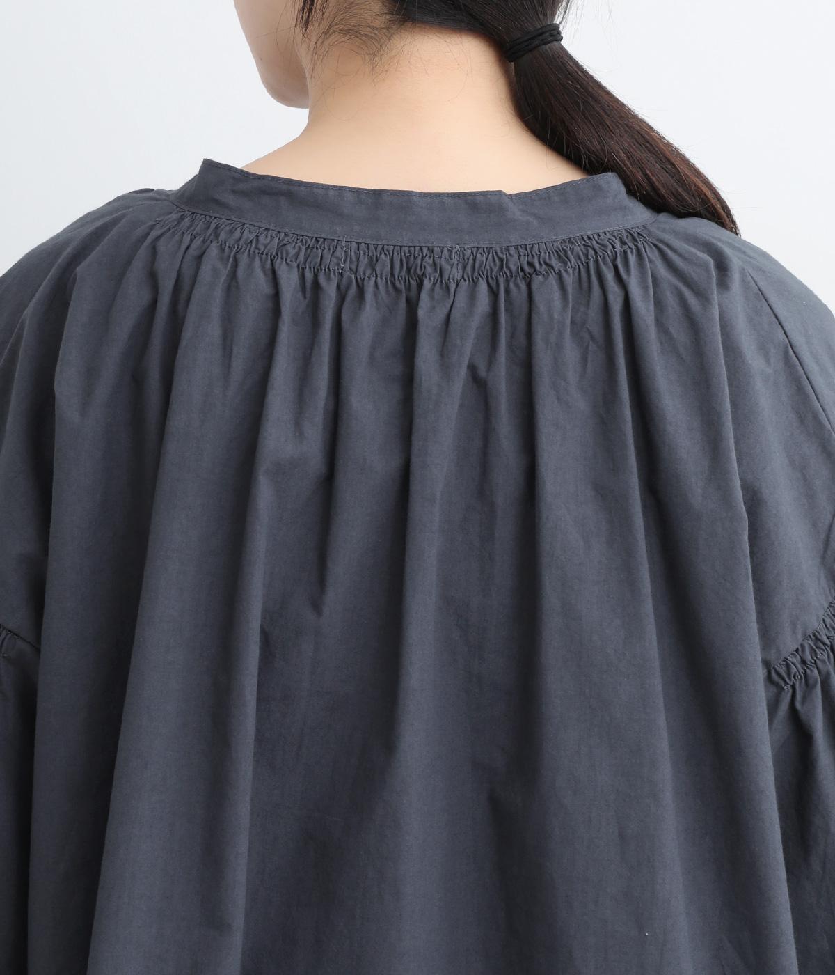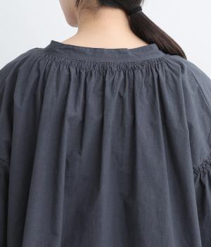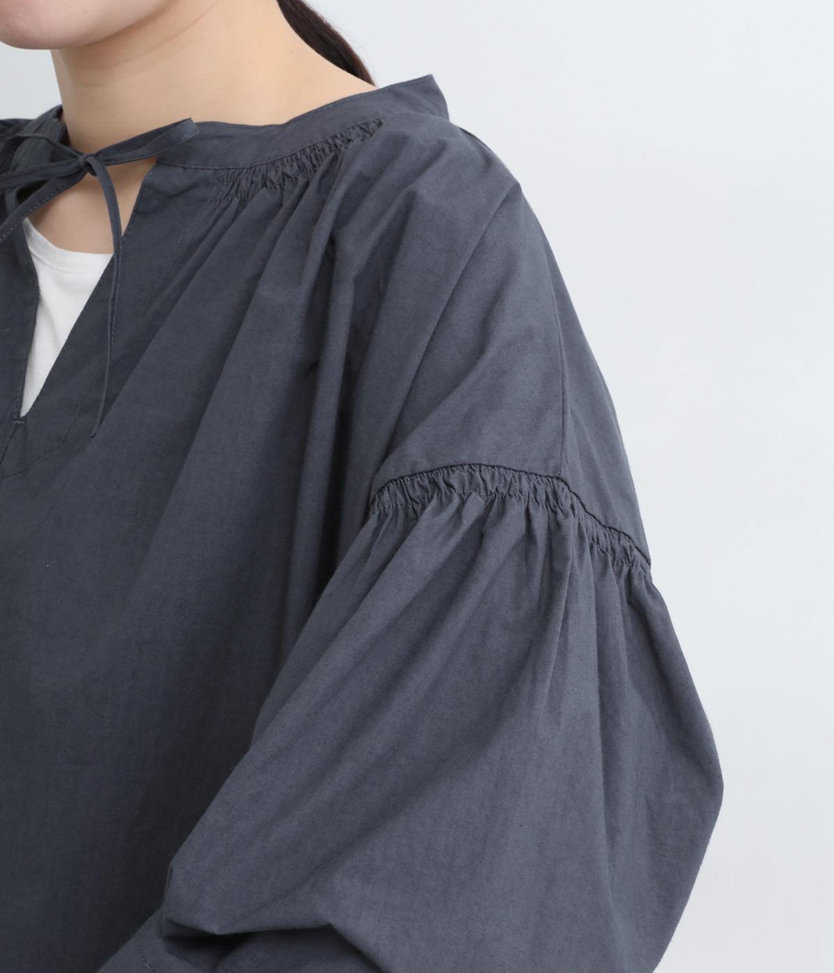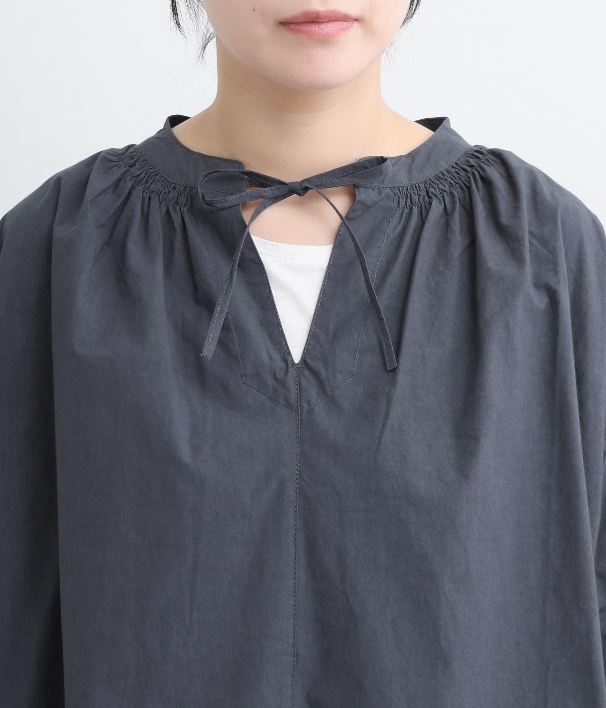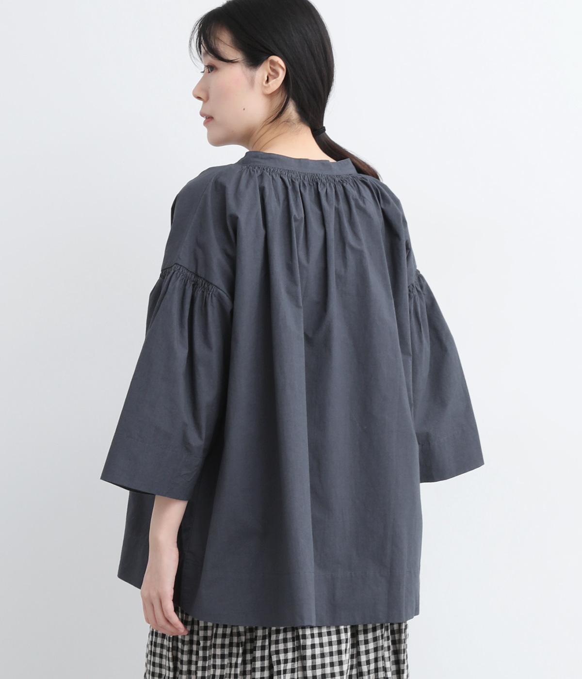 ネックのスリットが顔まわりをきれいに映すプルオーバーブラウス。襟もとや肩にはシャーリングを施した、ディテールにこだわった一枚です。ドロップショルダーにフレアな袖ラインが、大人の抜け感を漂わせます。