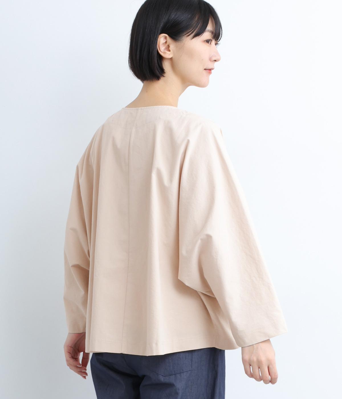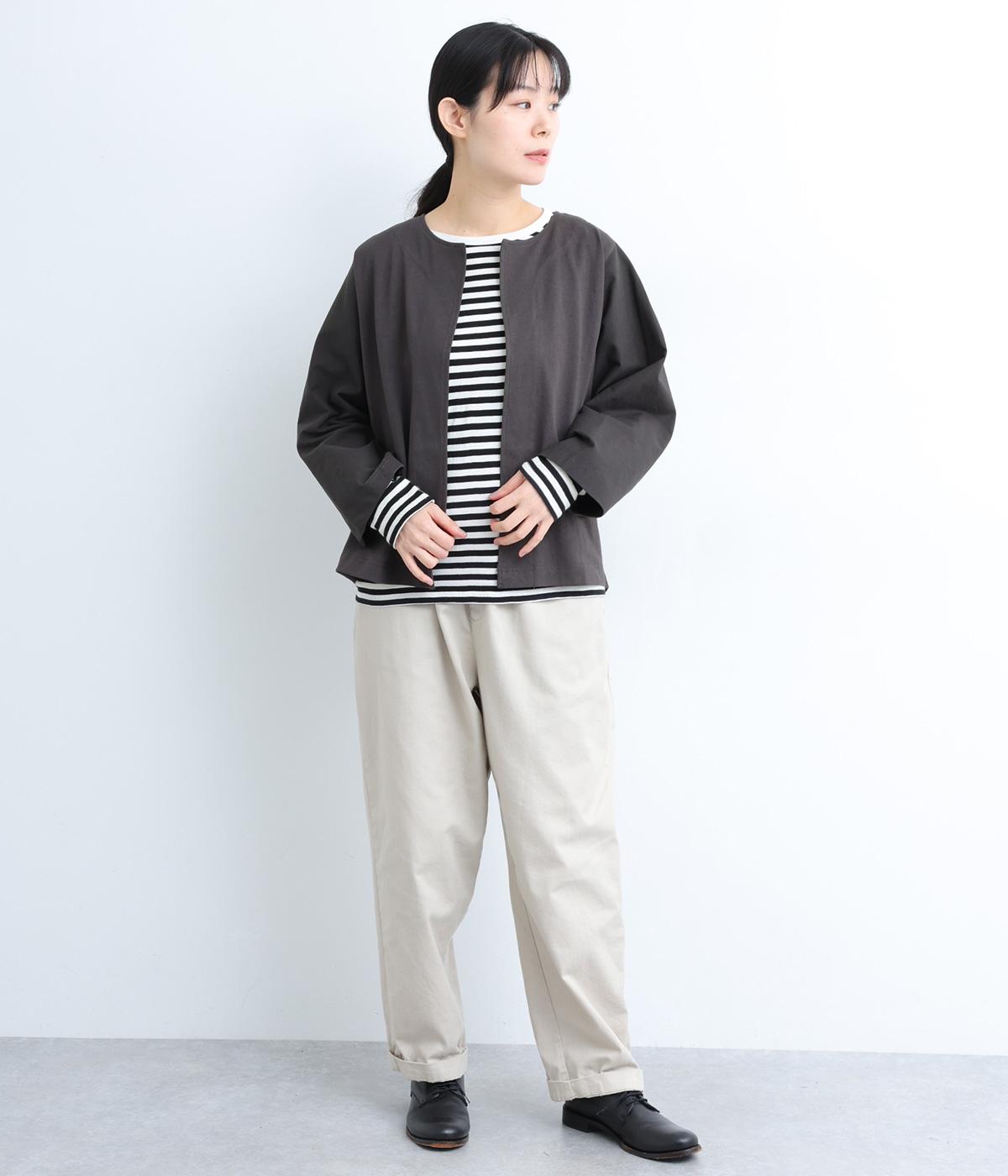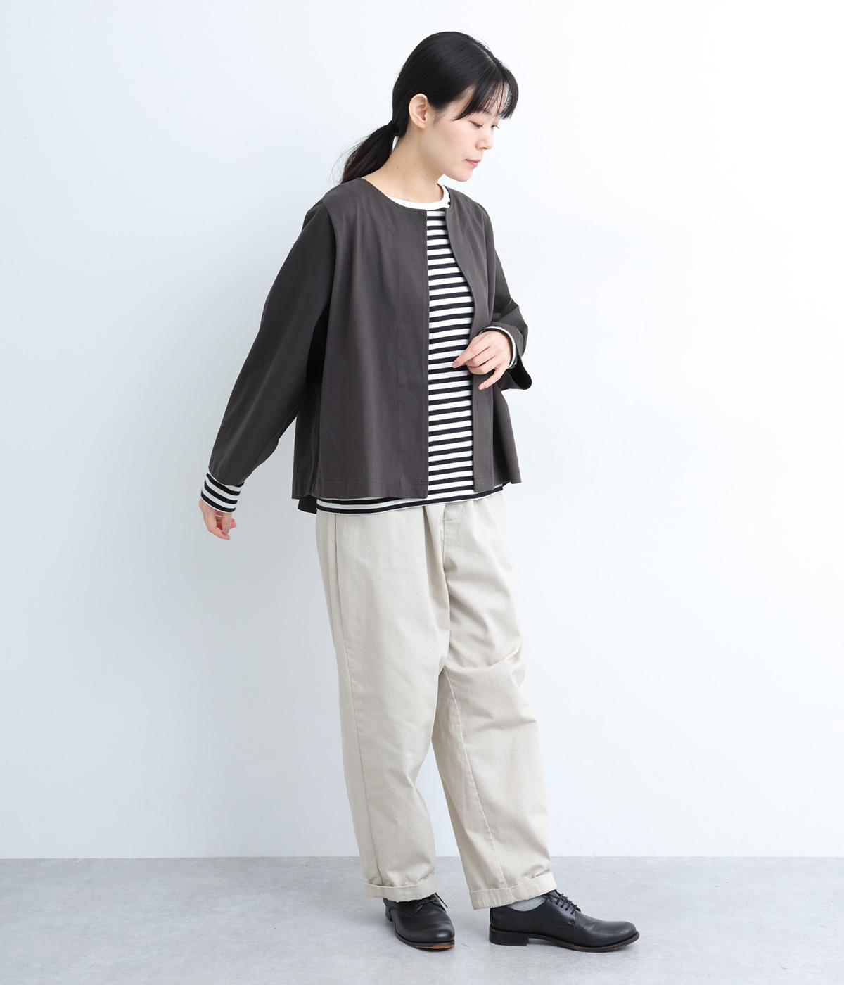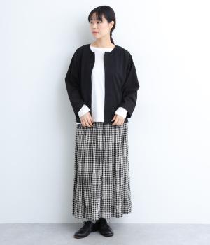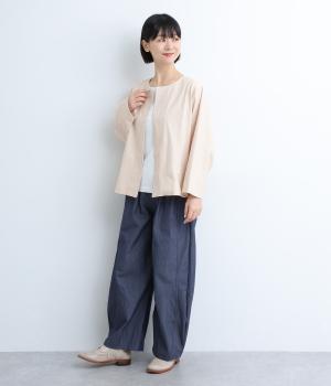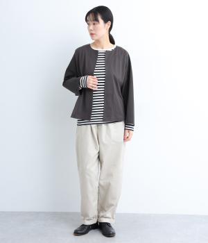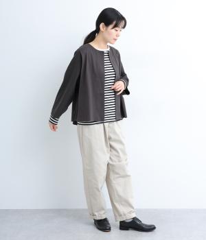 ソフトで伸びのあるカットソー生地と布帛を組み合わせました。同色系でまとまりも良く、さり気なく変化をつけています。どちらもコットンでロングシーズン活躍する生地感です。
