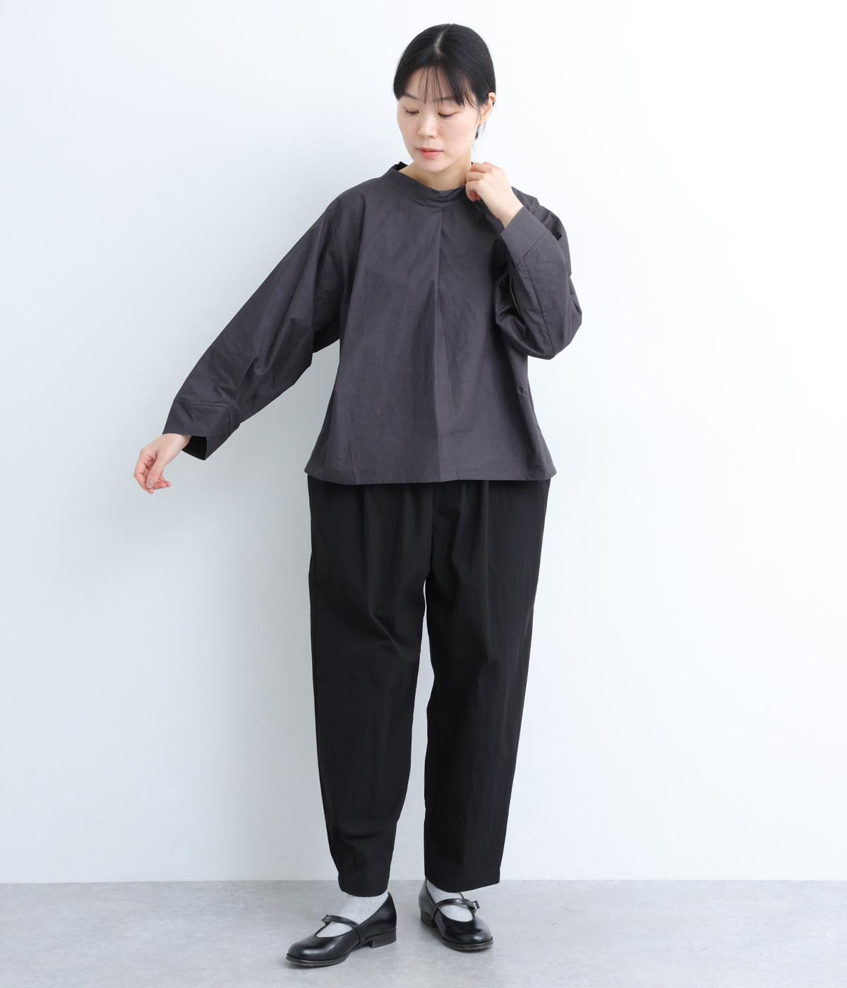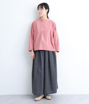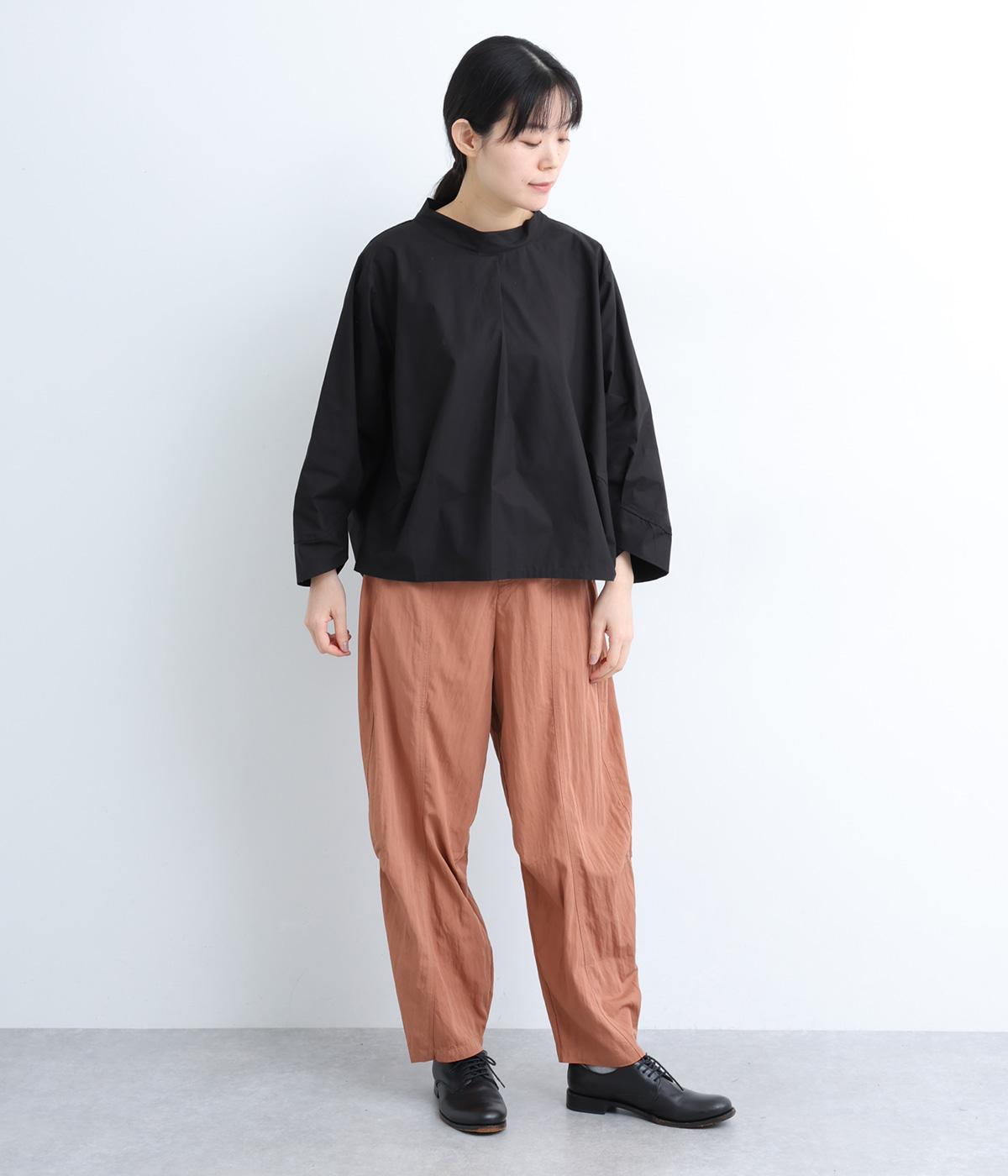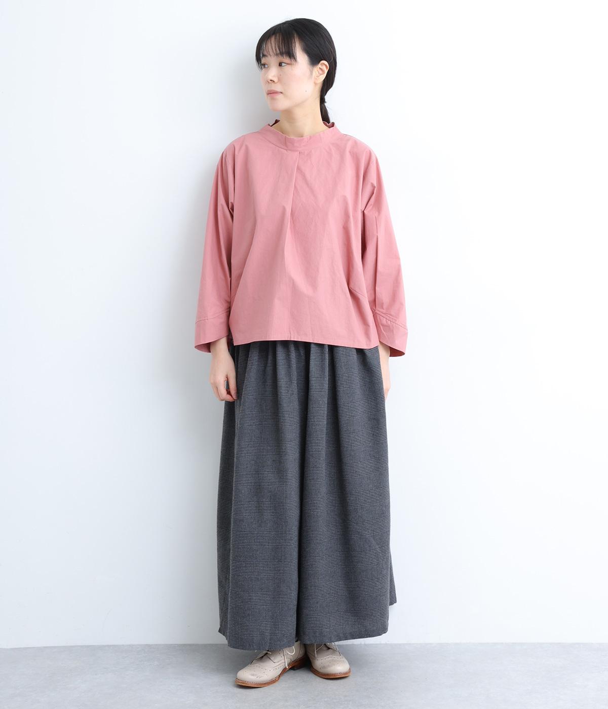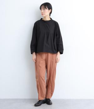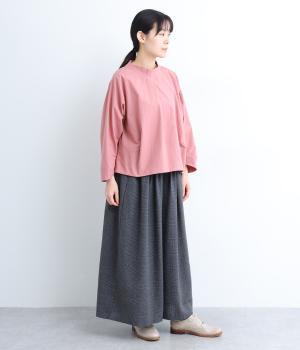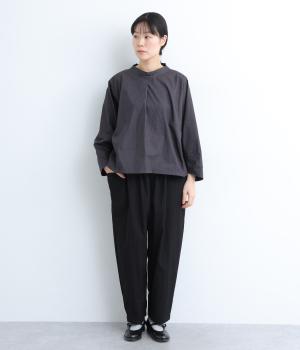 顔まわりにニュアンスを持たせたショールネックが品のいい一枚。前身頃は襟ぐりのタックで適度なゆとりを、後ろ身頃は長めのラウンドヘムでこなれ感を出しました。脇ダーツで自然な立体感をつけているので、シンプルな合わせでもサマになります。