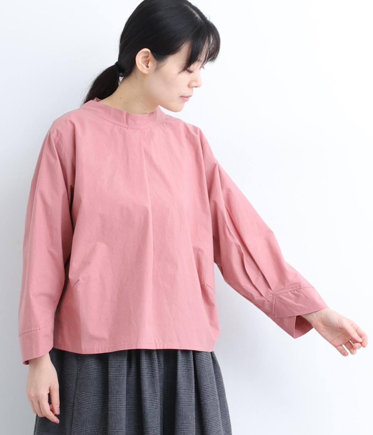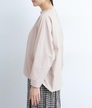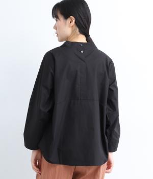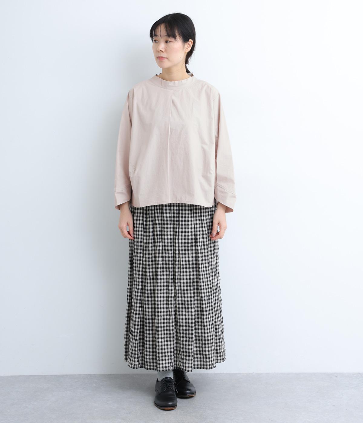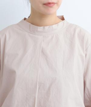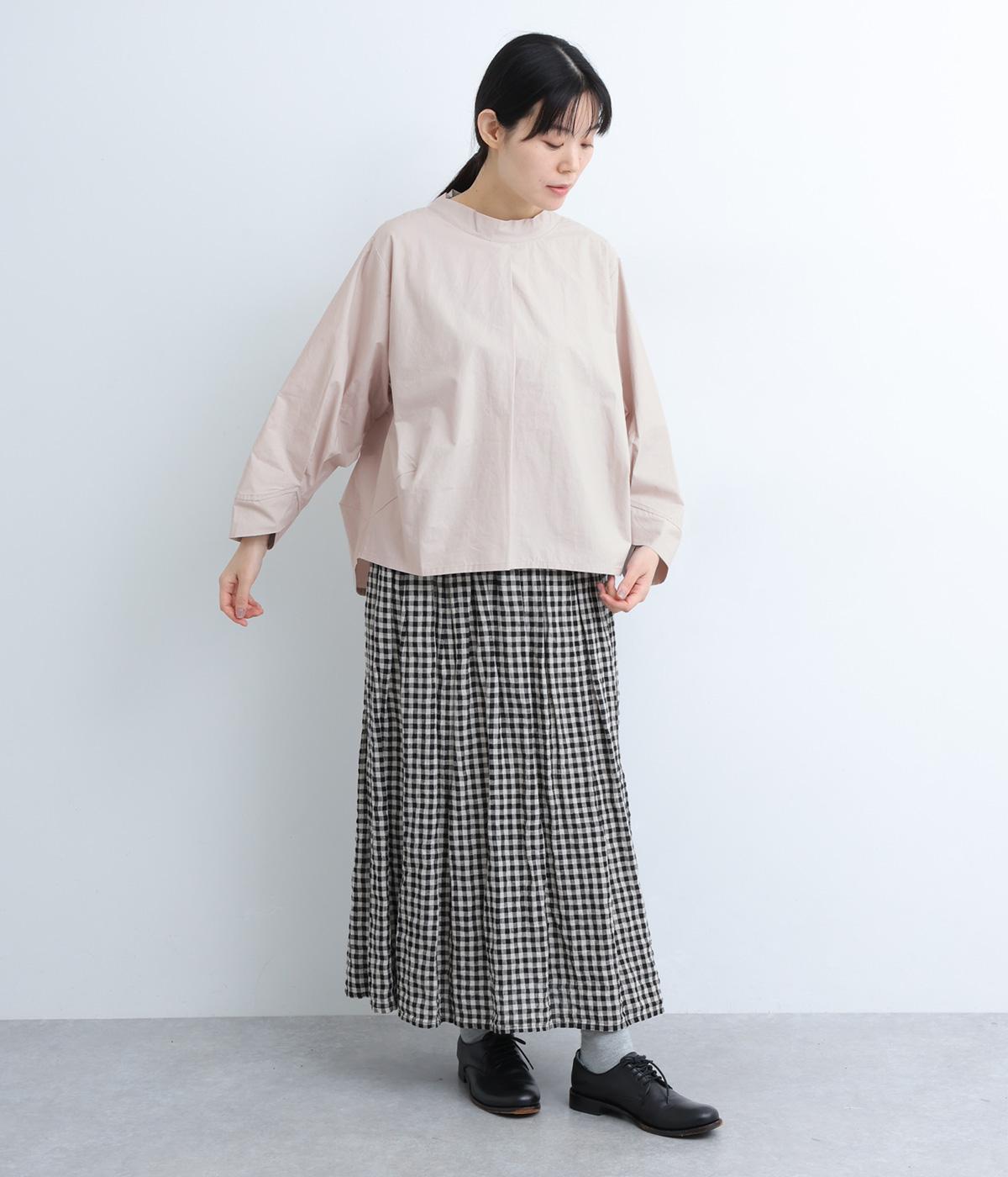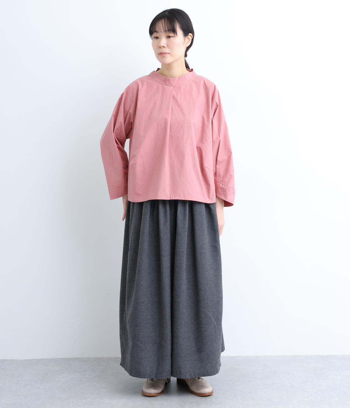 顔まわりにニュアンスを持たせたショールネックが品のいい一枚。前身頃は襟ぐりのタックで適度なゆとりを、後ろ身頃は長めのラウンドヘムでこなれ感を出しました。脇ダーツで自然な立体感をつけているので、シンプルな合わせでもサマになります。