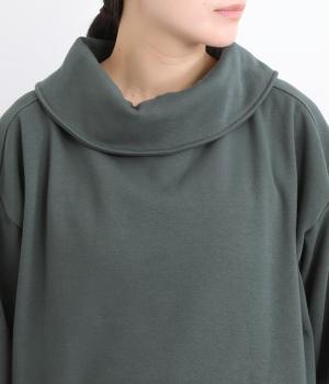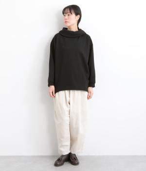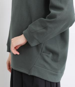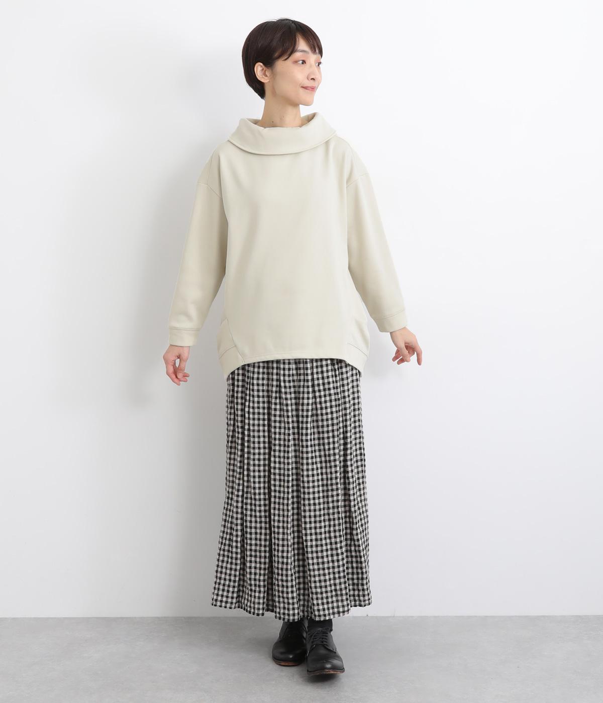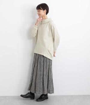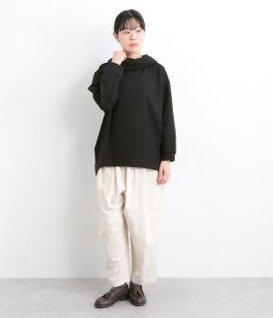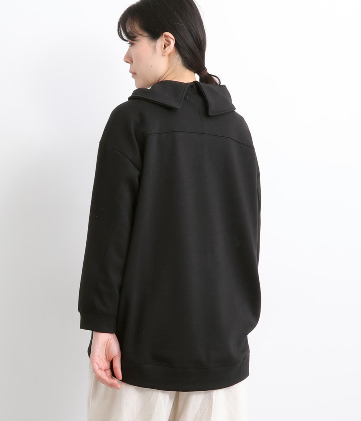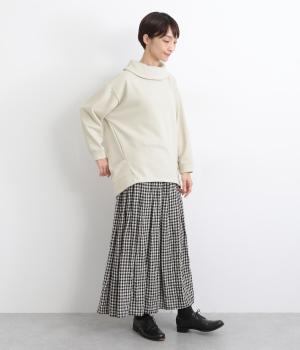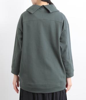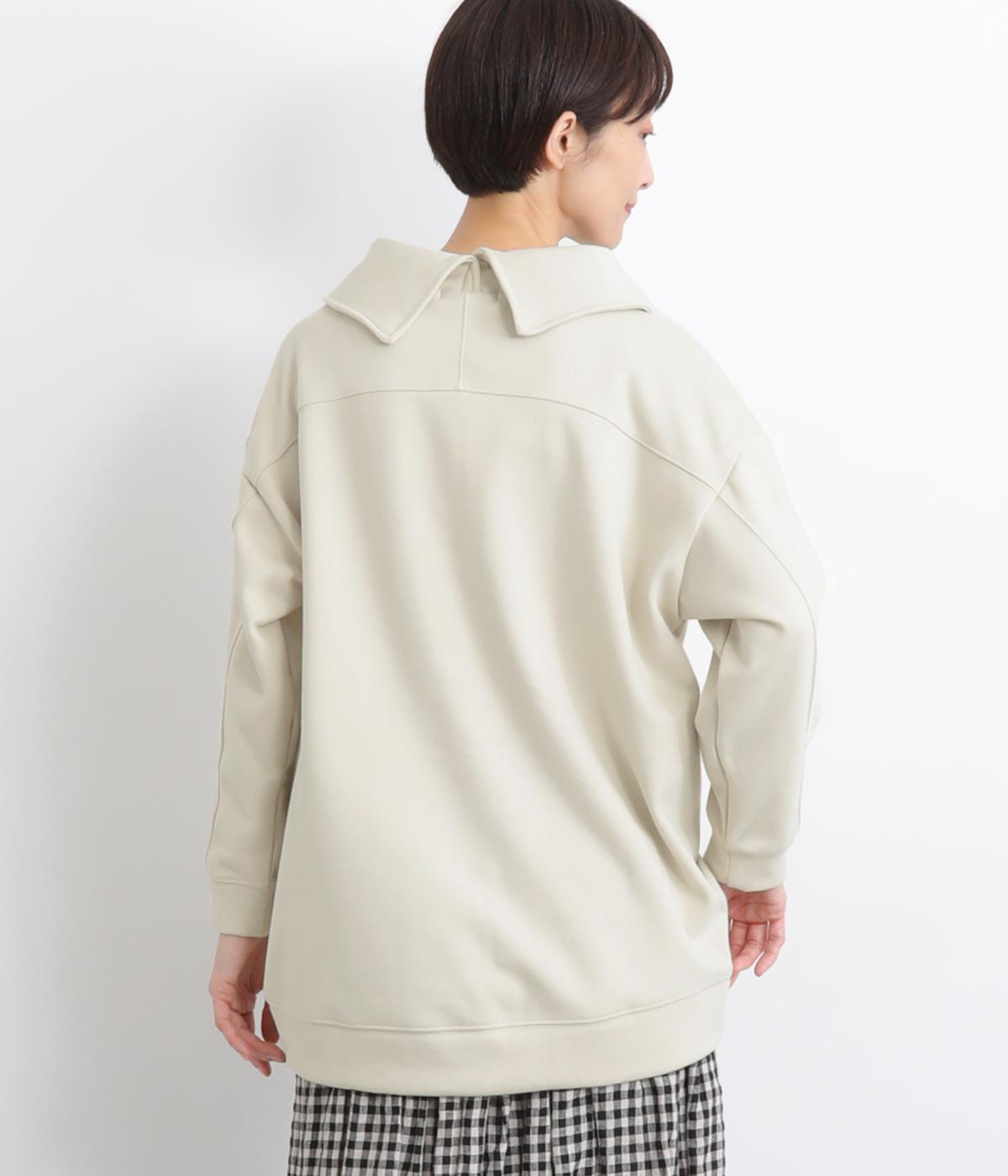 ワントーンですっきりまとめ、ロールカラーが上品な印象を与えるプルオーバーチュニック。前に持ってきた脇線にタックを入れて、さり気なく動きのあるシルエットに仕立てています。シャツ襟のような後ろ姿もいいポイントです。