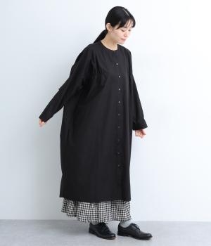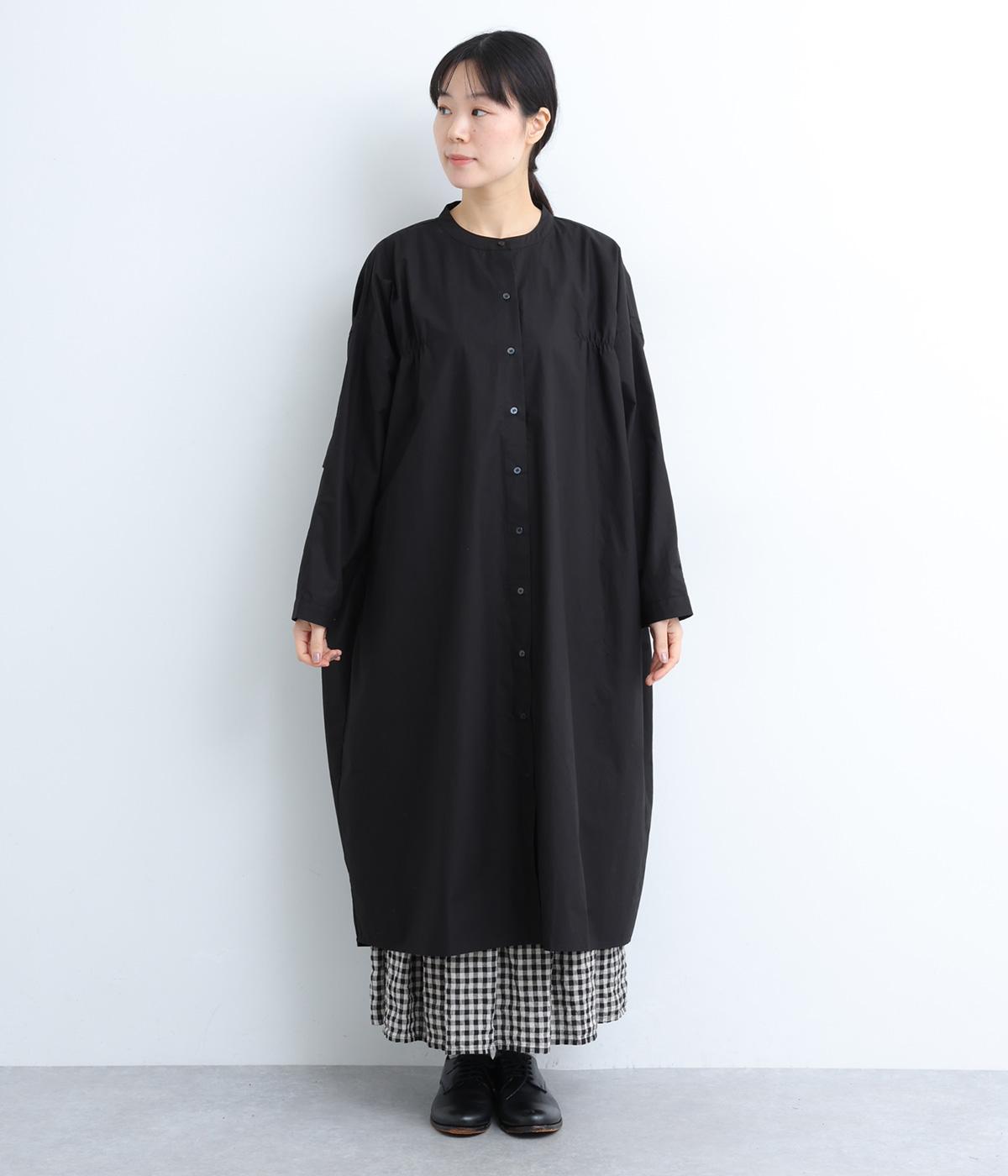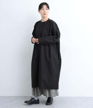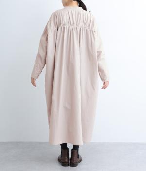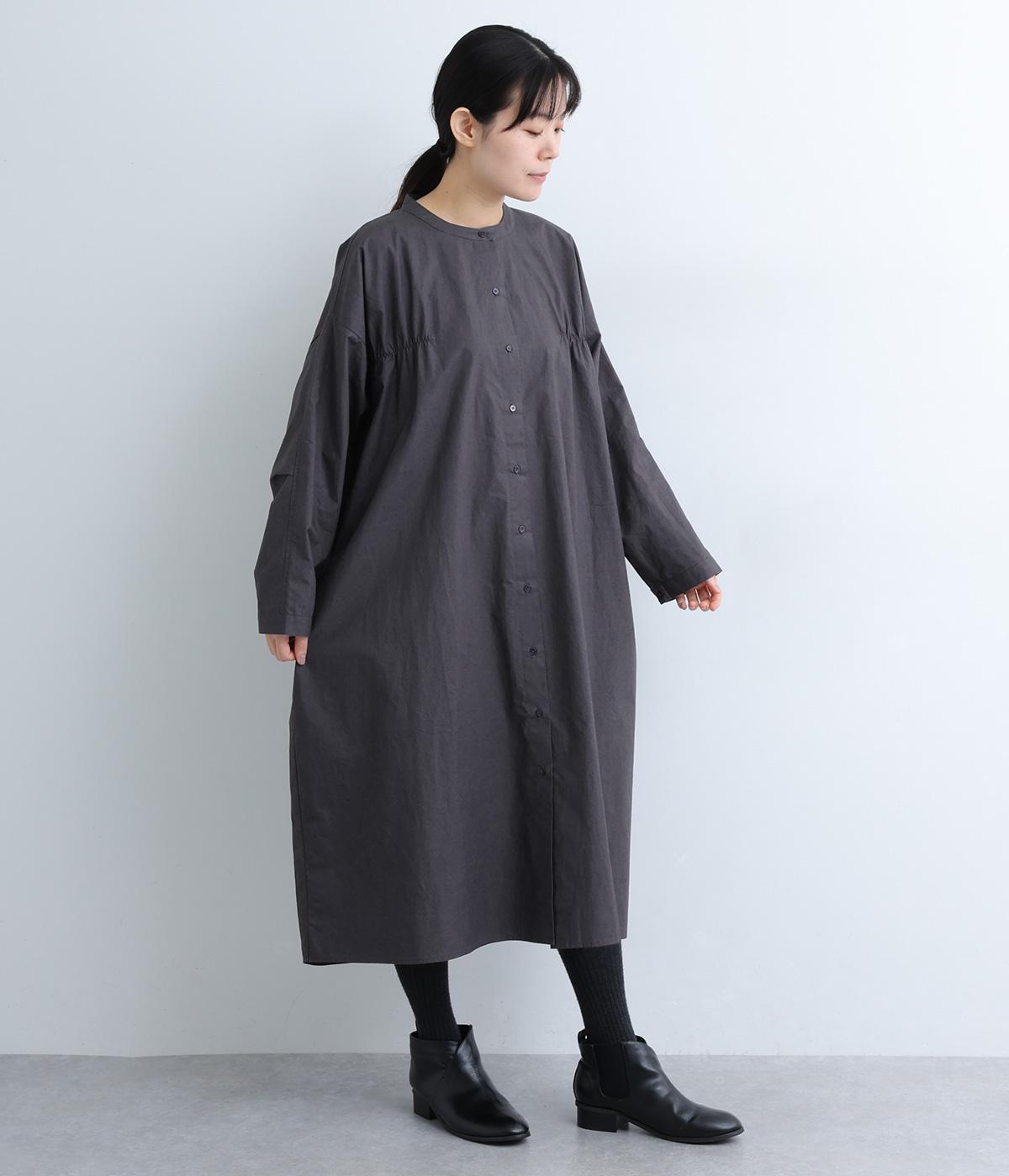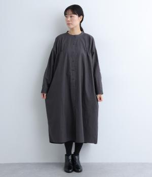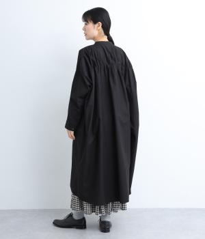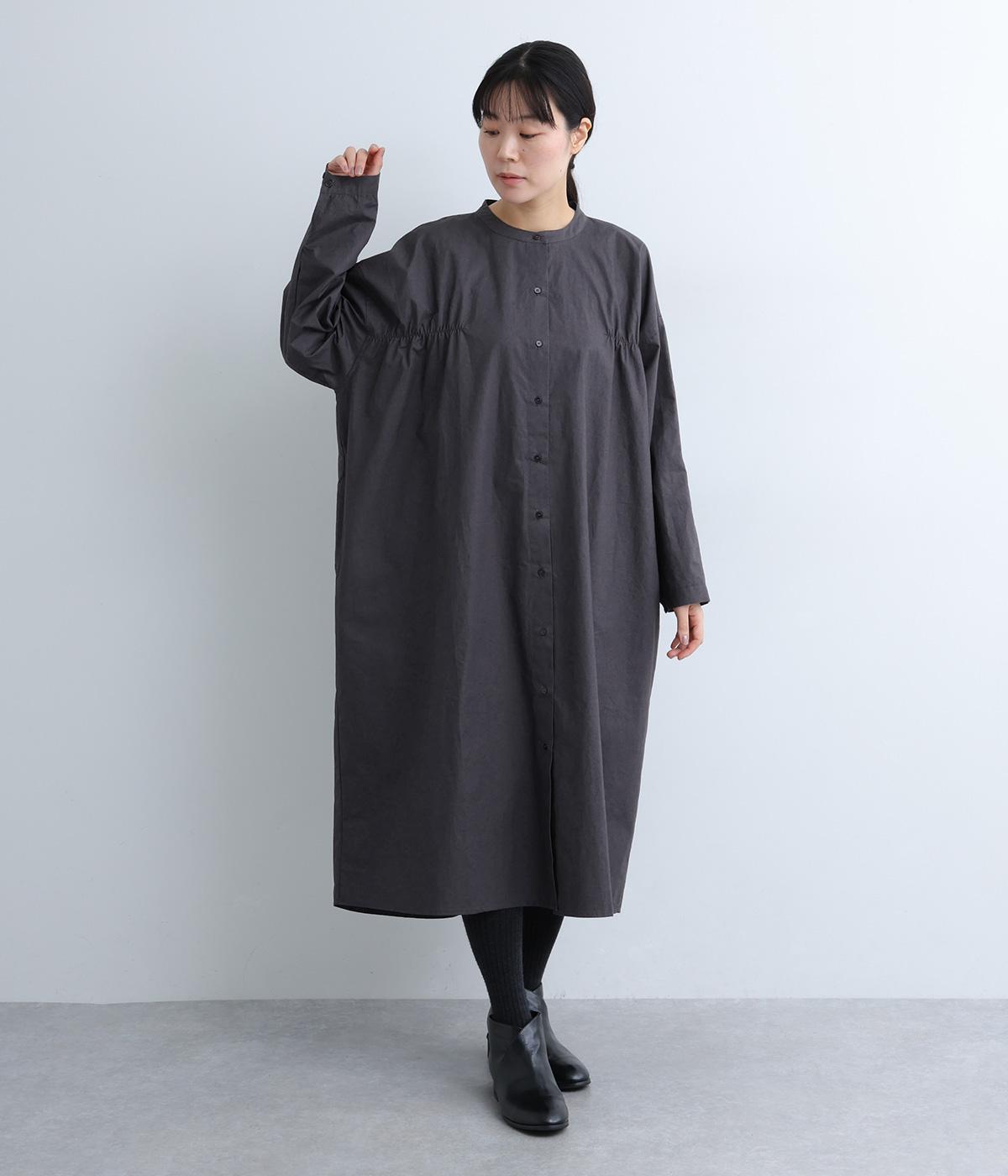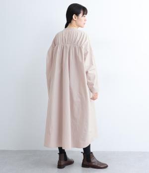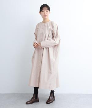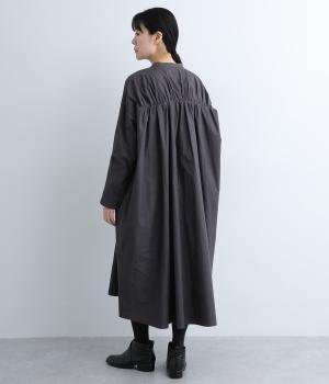 脇や後ろにギャザーを寄せてさり気なくニュアンスをもたせた、ワイドシルエットのワンピースです。ボトムとのレイヤードもたのしめるロング丈で、前をあけた羽織り使いもおすすめ。顔まわりはラウンドネックで品よくまとめました。