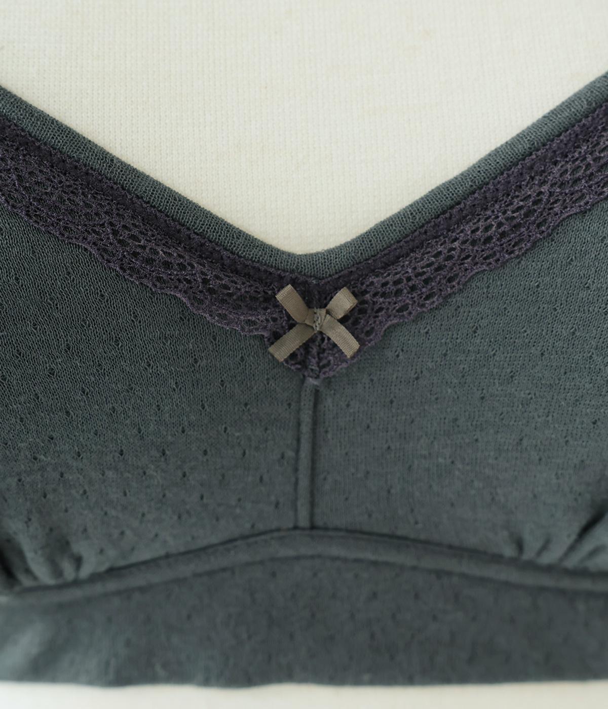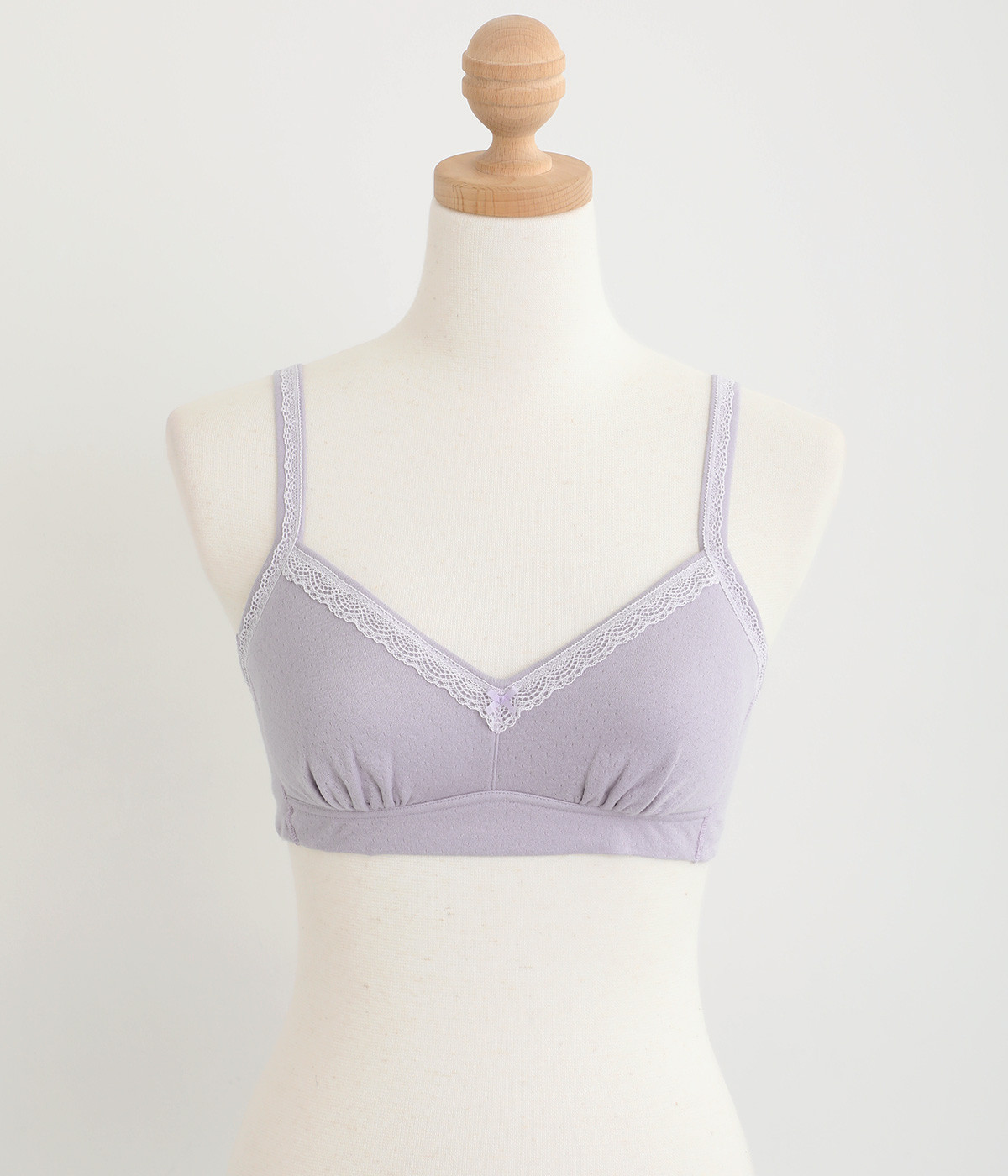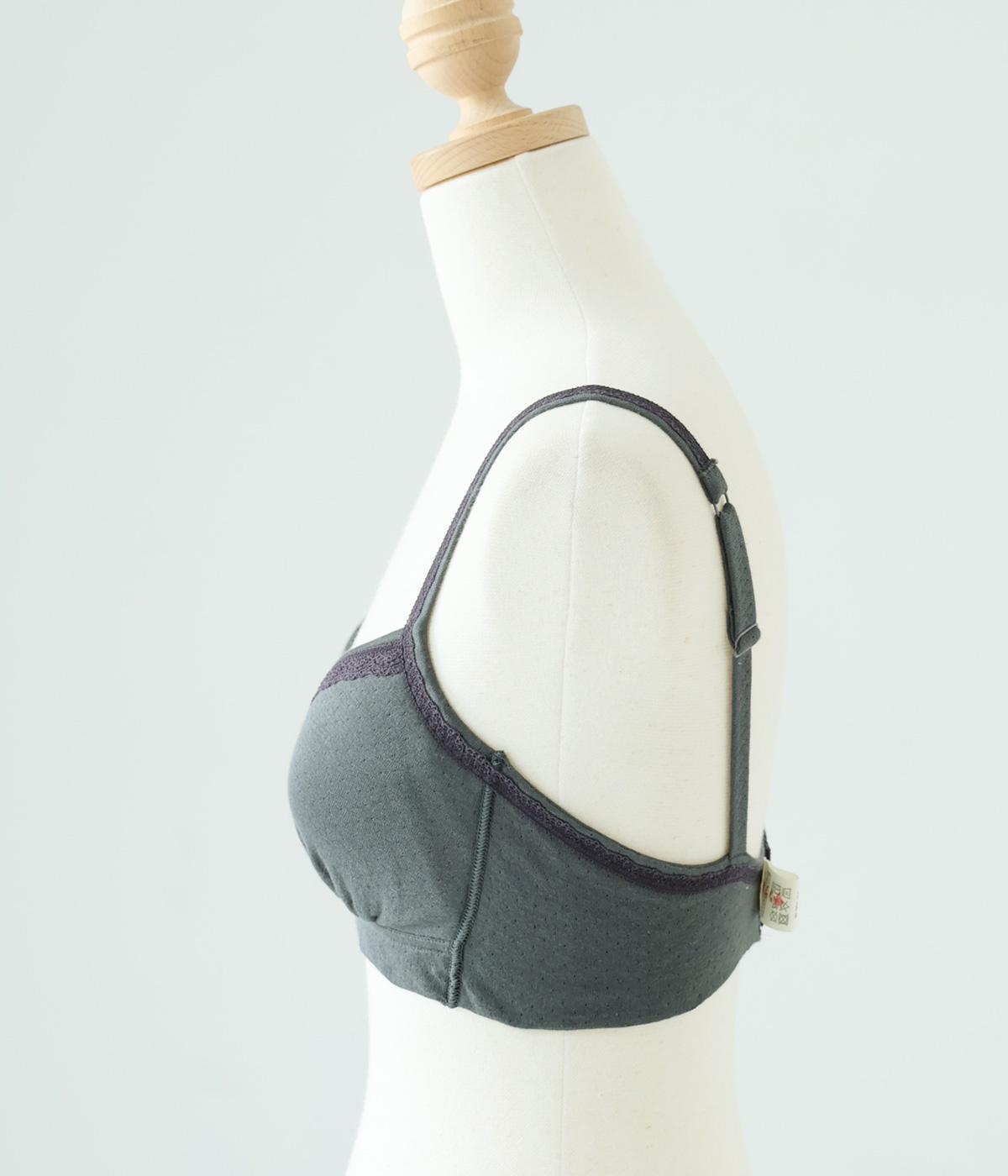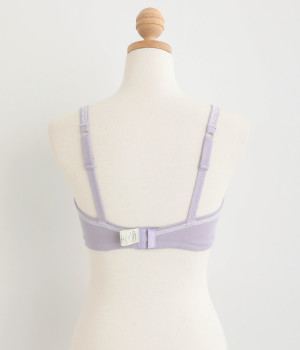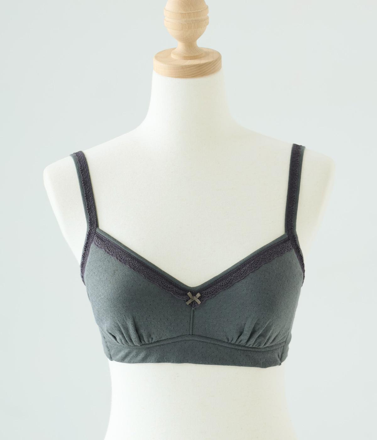 つけ心地のよさとおしゃれな見た目を両立させたブラジャー。ほどよくバストをサポートするサイドパネルつきで、ノンワイヤーブラを普段つけない方にもおすすめです。大人の愛らしさを添える控えめなレースとリボンもポイントに。共生地のストラップは調節可能です。