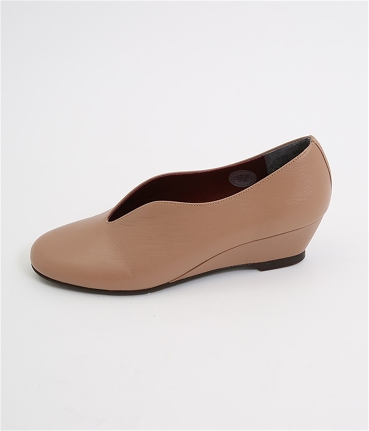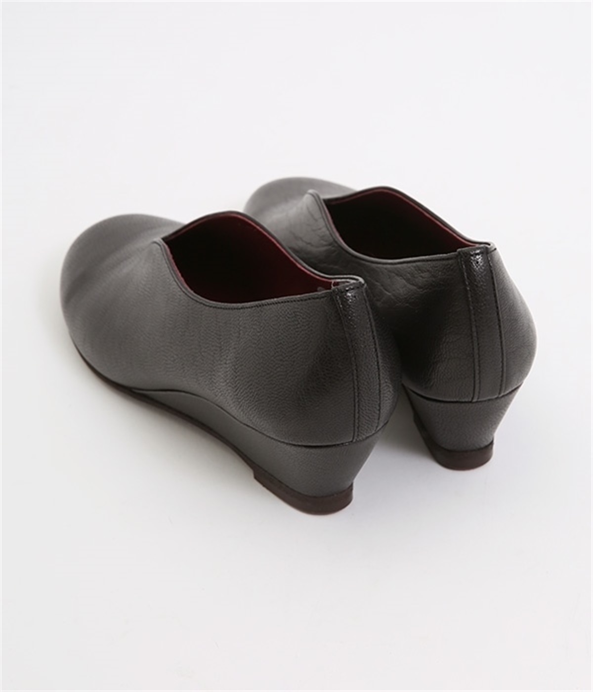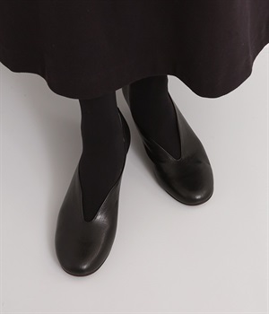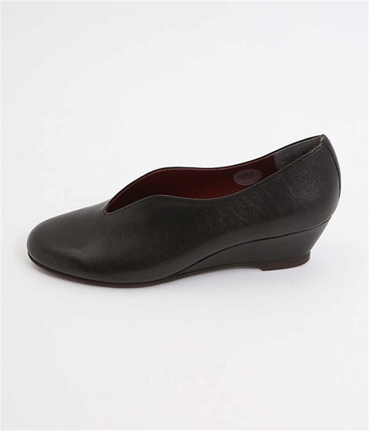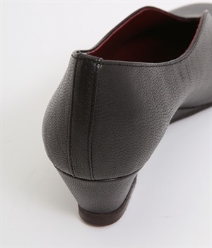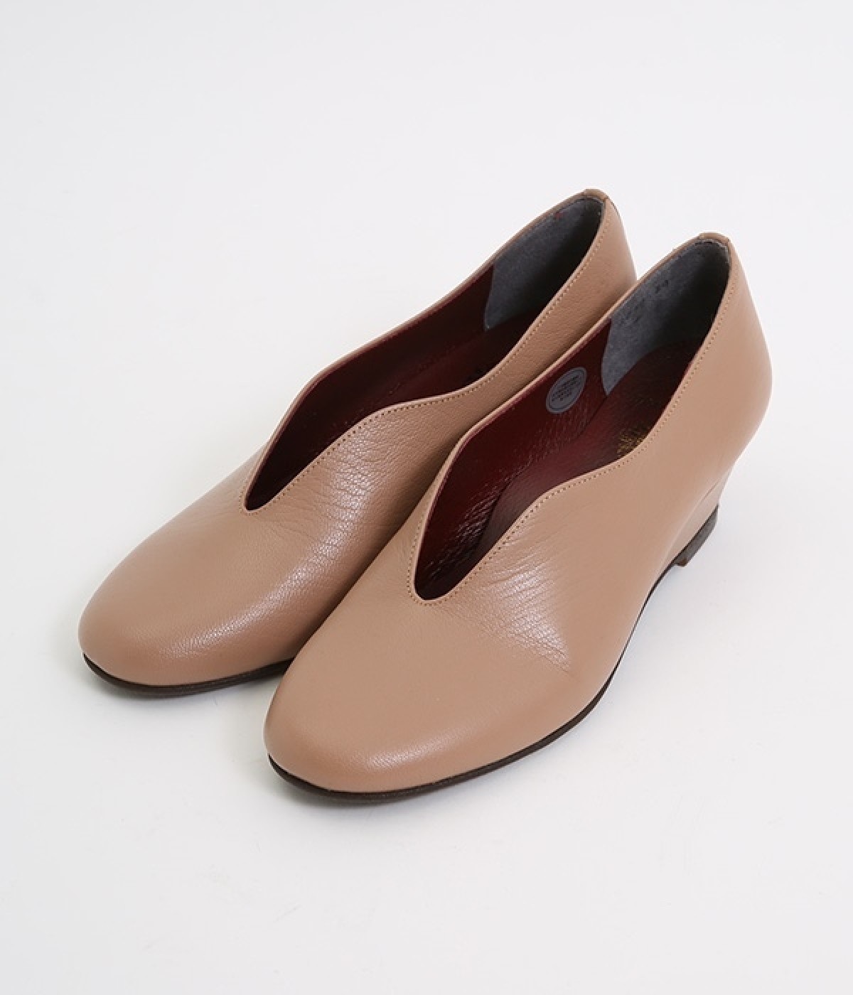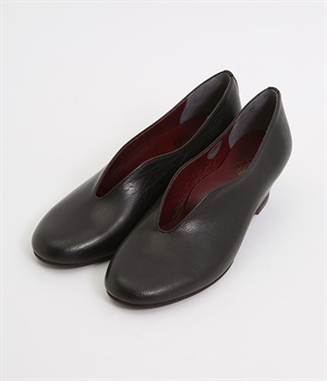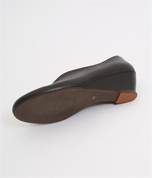 やさしい丸みを帯びた曲線とVカットの計算されたフォルムが魅力のウェッジソールパンプスです。低反発のウレタンインソールに、適度にクッションを効かせたアーチクッション、歩きやすい高級合成クレープの本底など、細部に至るまで履き心地を追求しています。アッパーはアンティーク加工を施した山羊革で、きれいめながら疲れにくい優秀な一足です。