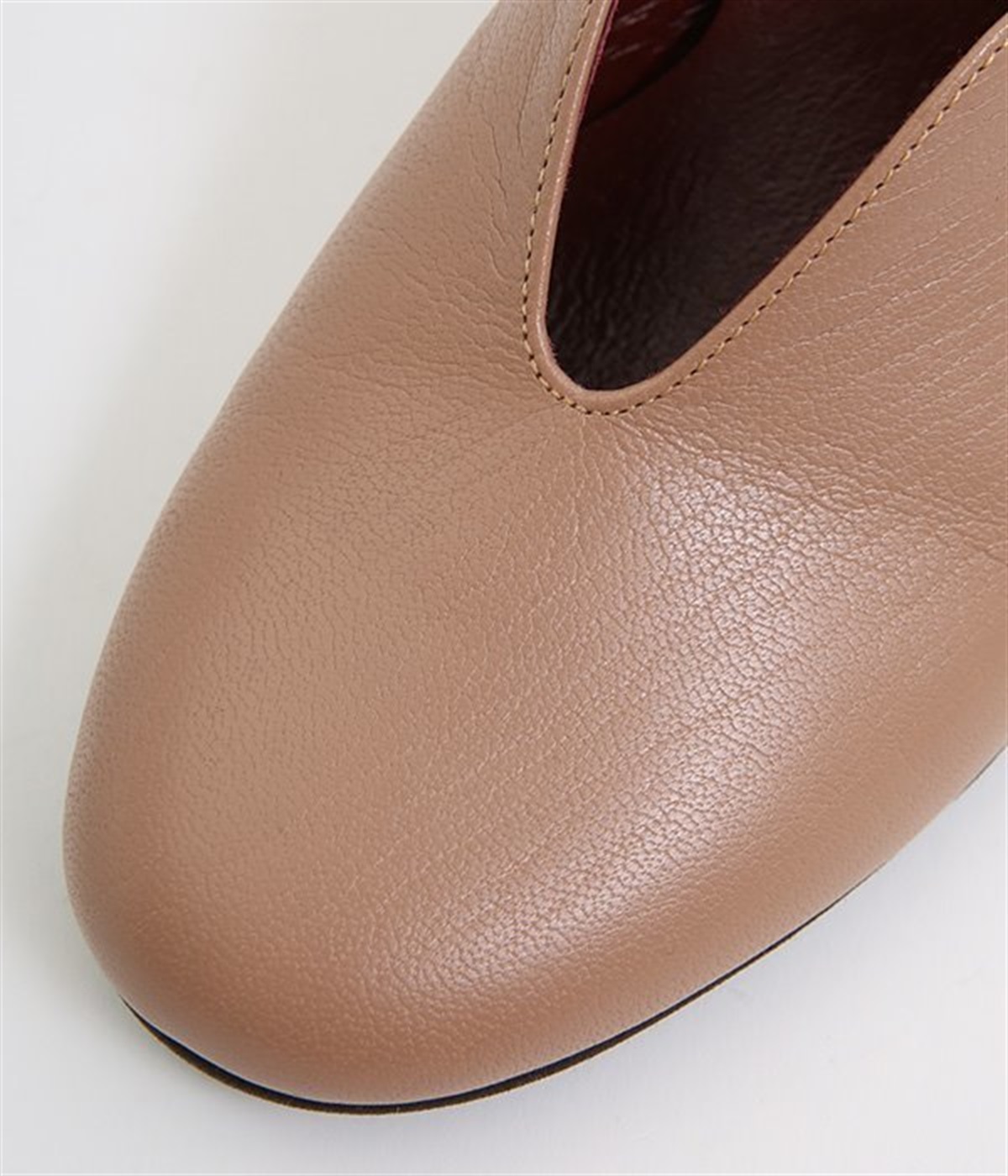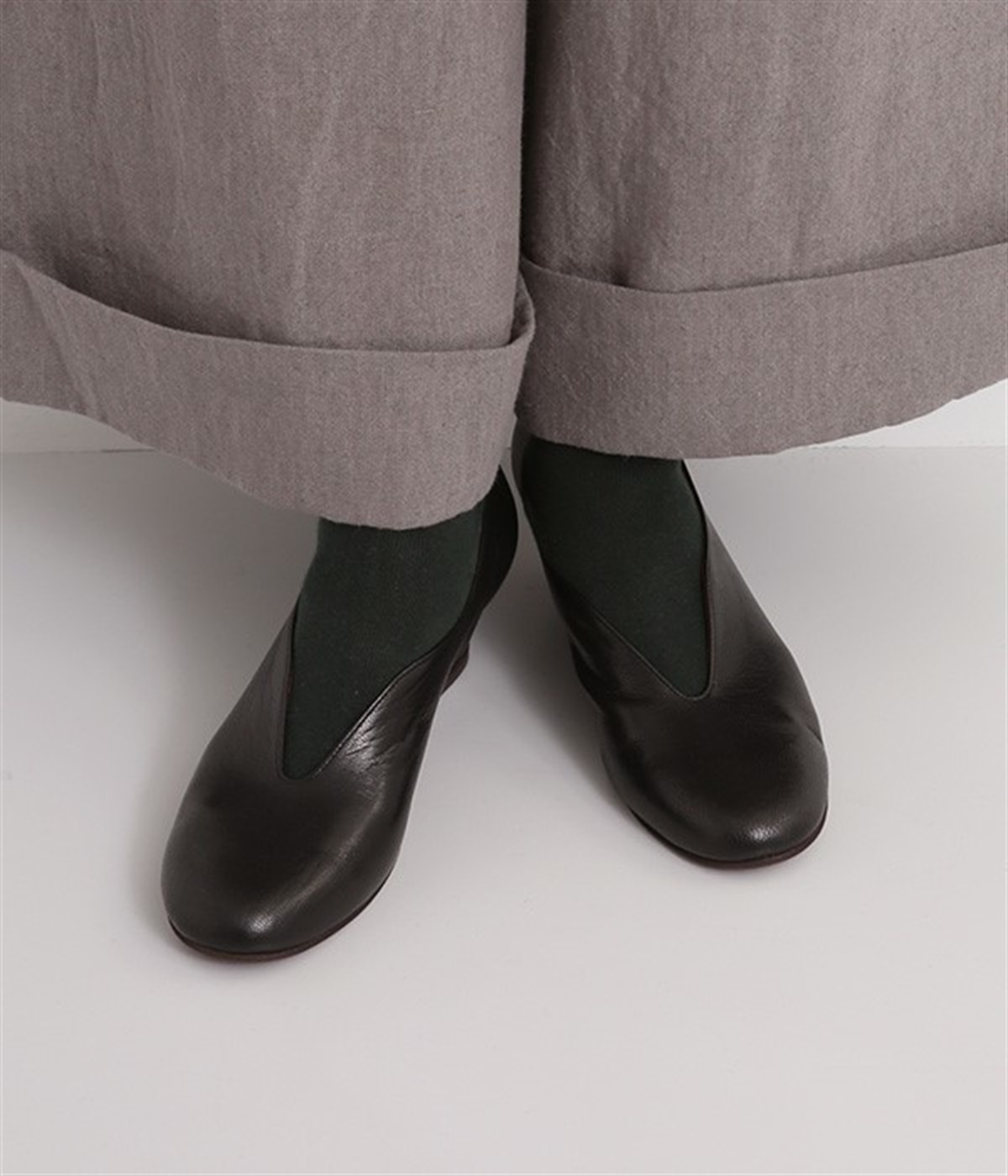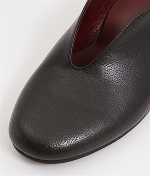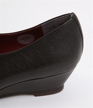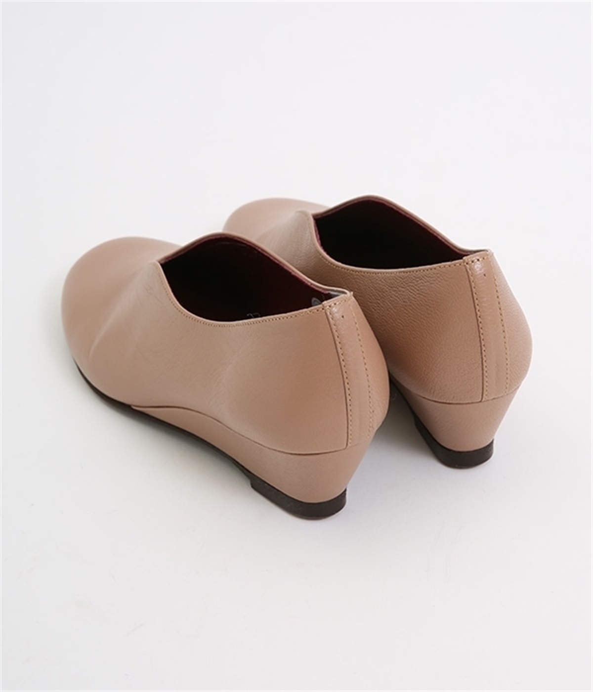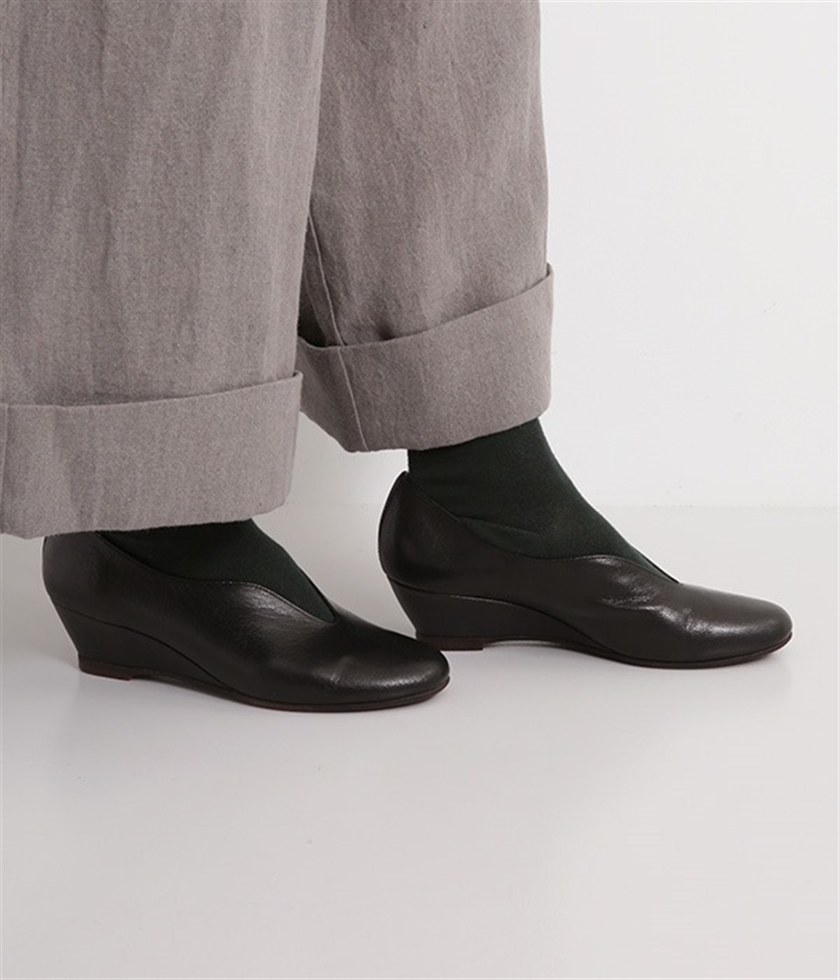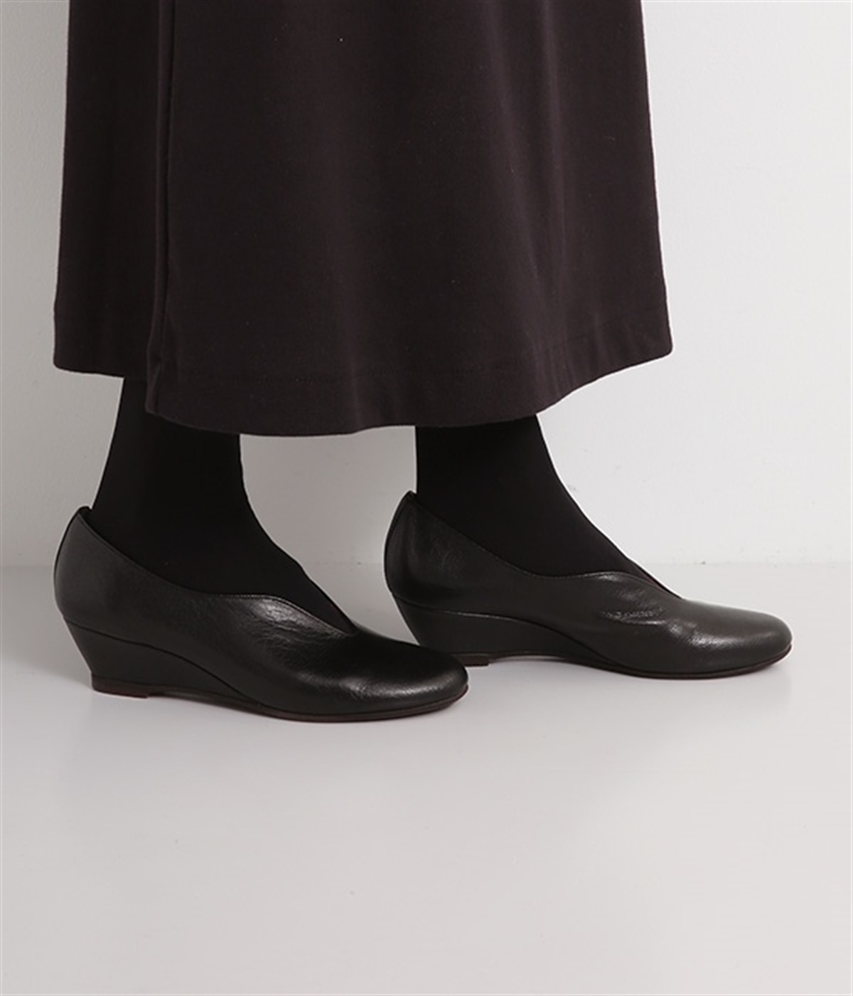 やさしい丸みを帯びた曲線とVカットの計算されたフォルムが魅力のウェッジソールパンプスです。低反発のウレタンインソールに、適度にクッションを効かせたアーチクッション、歩きやすい高級合成クレープの本底など、細部に至るまで履き心地を追求しています。アッパーはアンティーク加工を施した山羊革で、きれいめながら疲れにくい優秀な一足です。