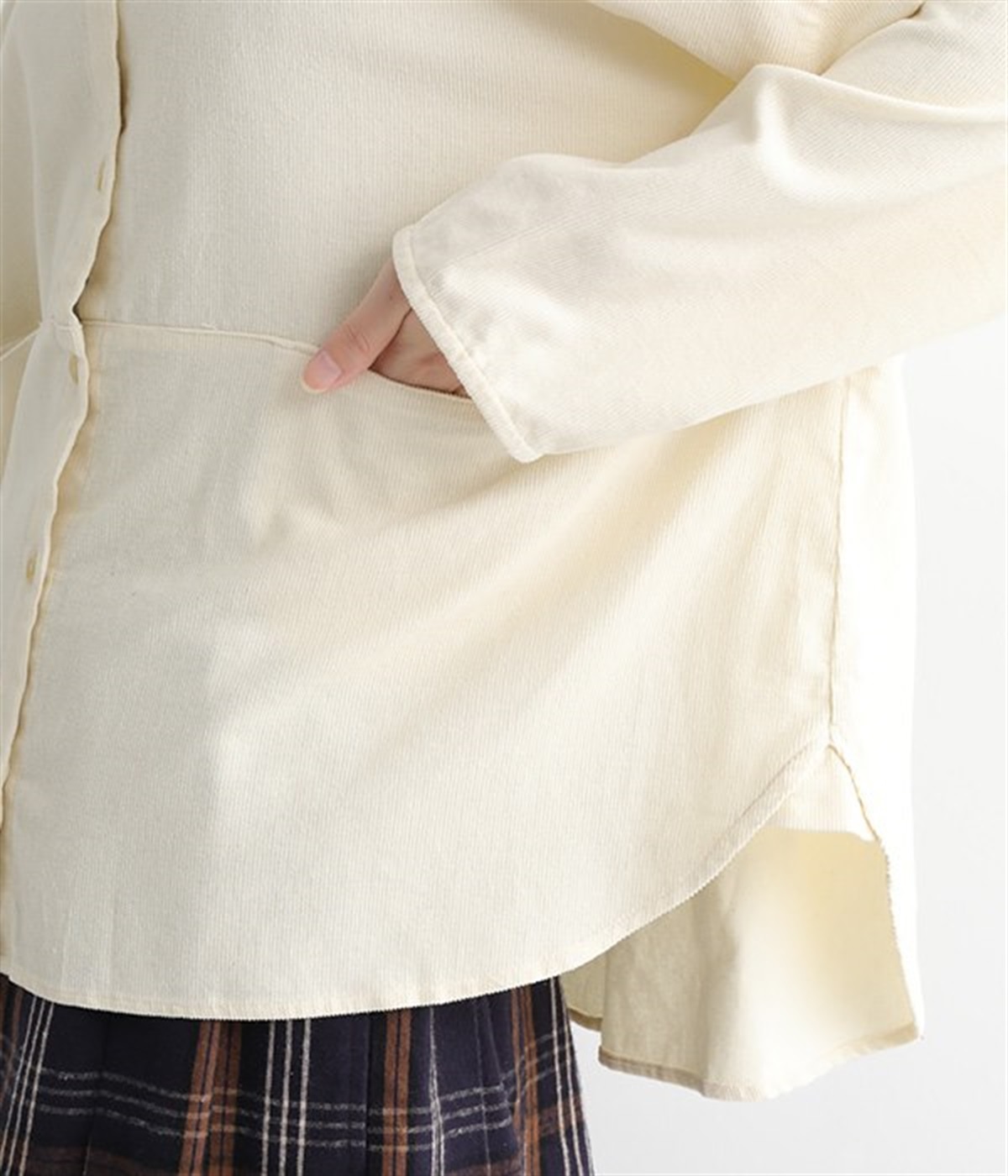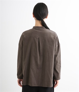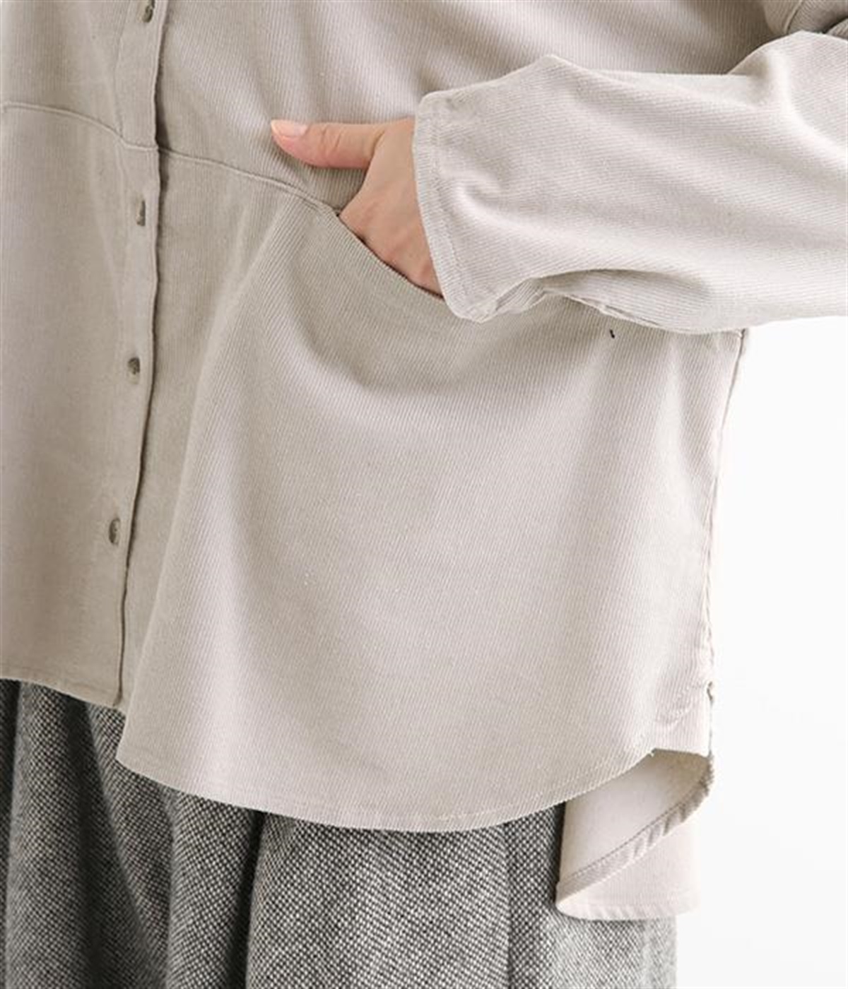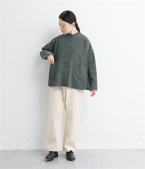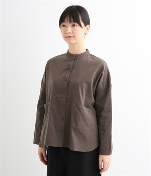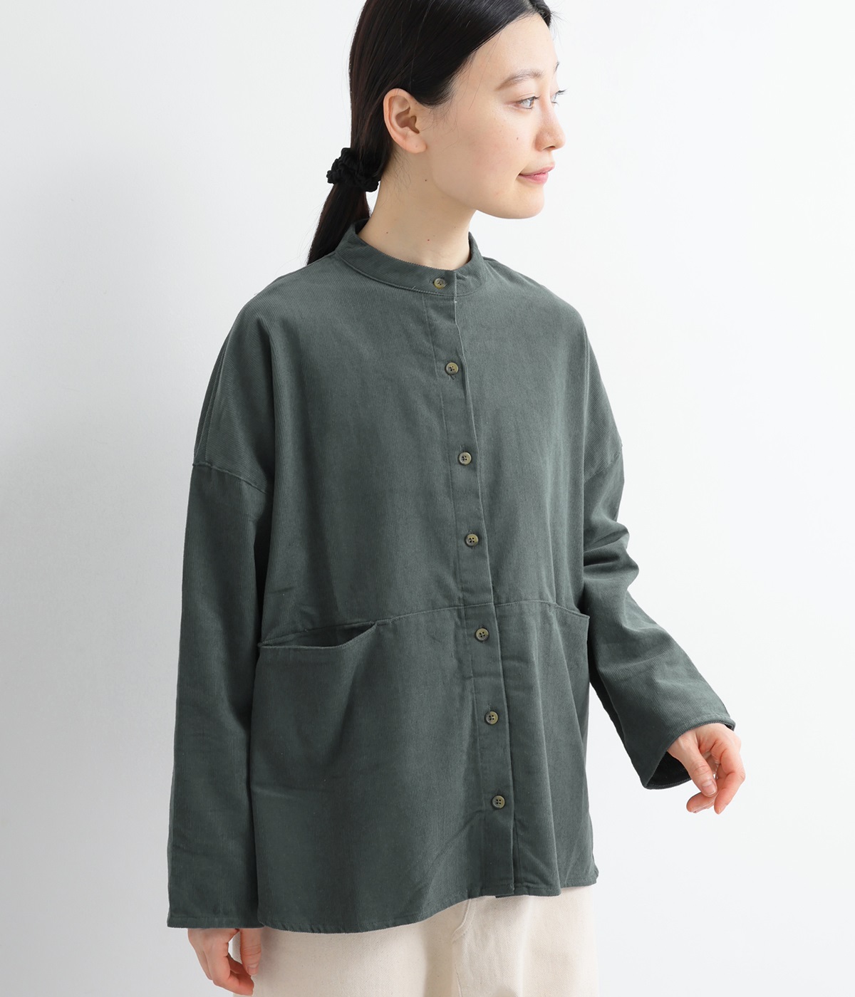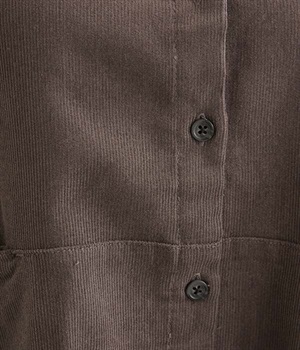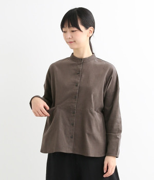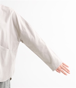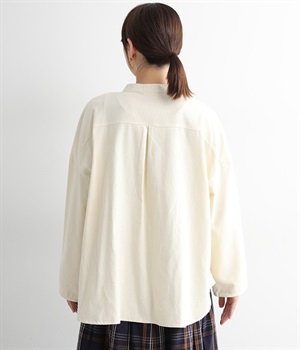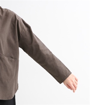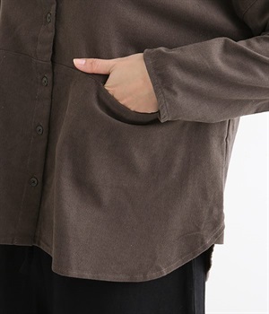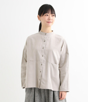 暖かみのある表情が特徴のコットンコーデュロイで仕立てたブラウスです。細畝なのでカジュアルになりすぎず、大人な着こなしにマッチします。柔らかく薄手の生地なのでロングシーズン着まわせます。切り替え位置から下のポケットがデザインポイント。フルオープンにして羽織りものとしてスタイリングするのもおすすめです。