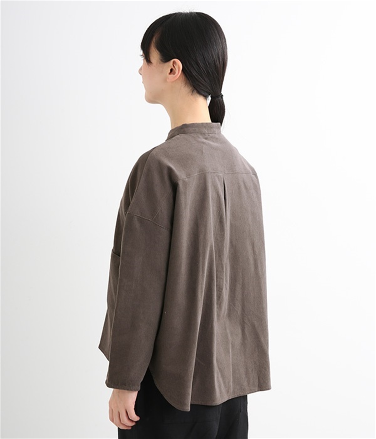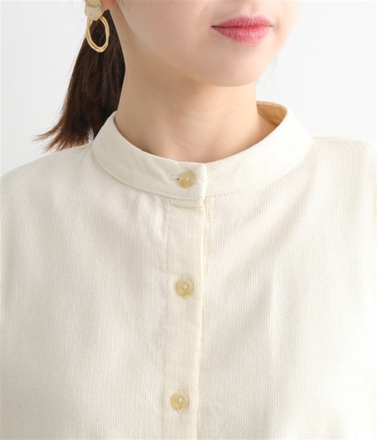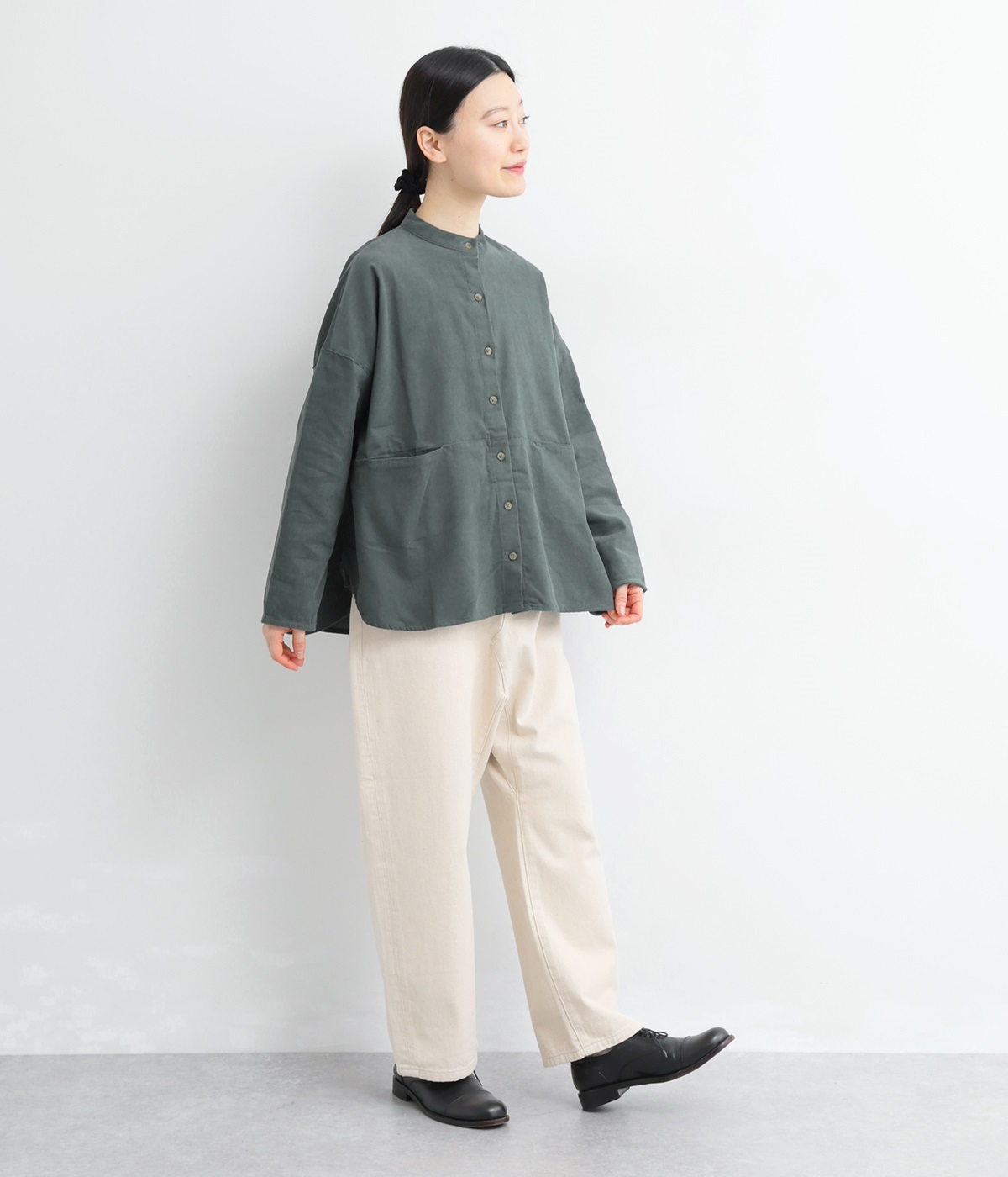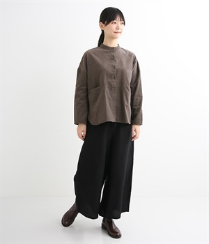 暖かみのある表情が特徴のコットンコーデュロイで仕立てたブラウスです。細畝なのでカジュアルになりすぎず、大人な着こなしにマッチします。柔らかく薄手の生地なのでロングシーズン着まわせます。切り替え位置から下のポケットがデザインポイント。フルオープンにして羽織りものとしてスタイリングするのもおすすめです。
