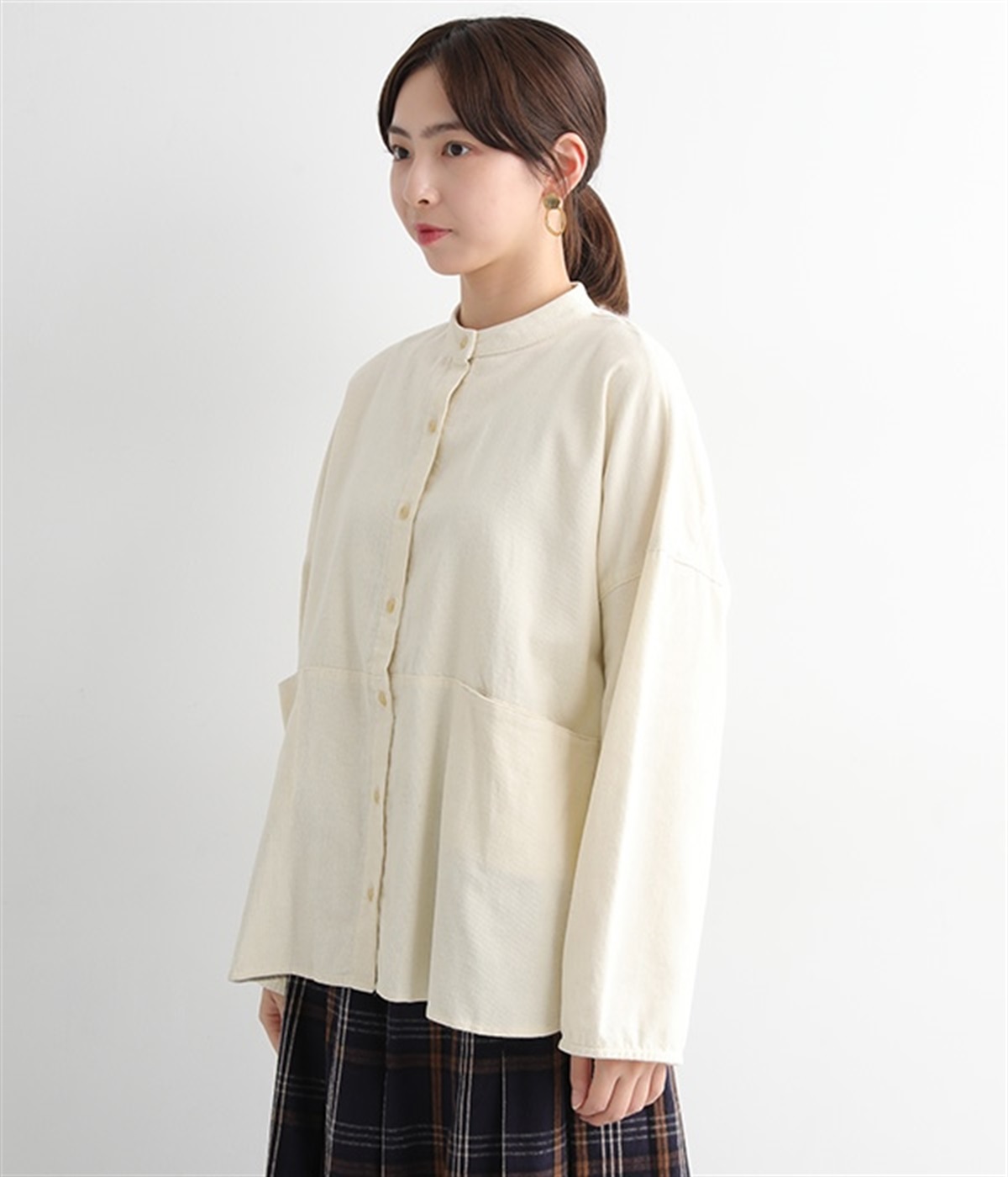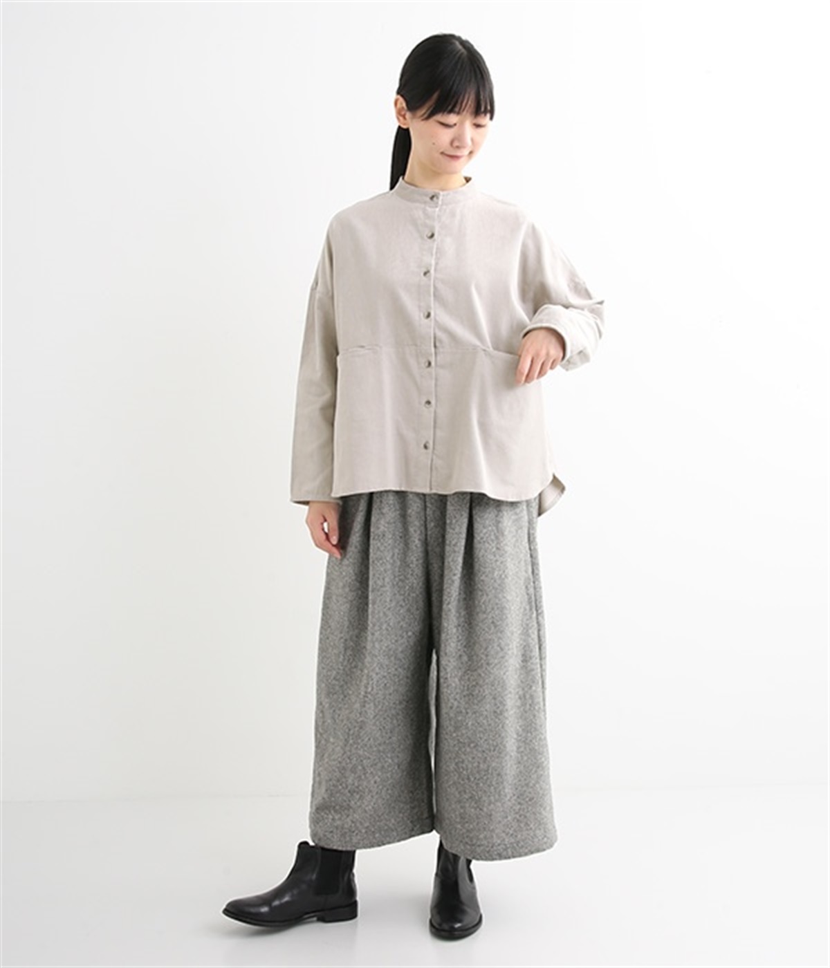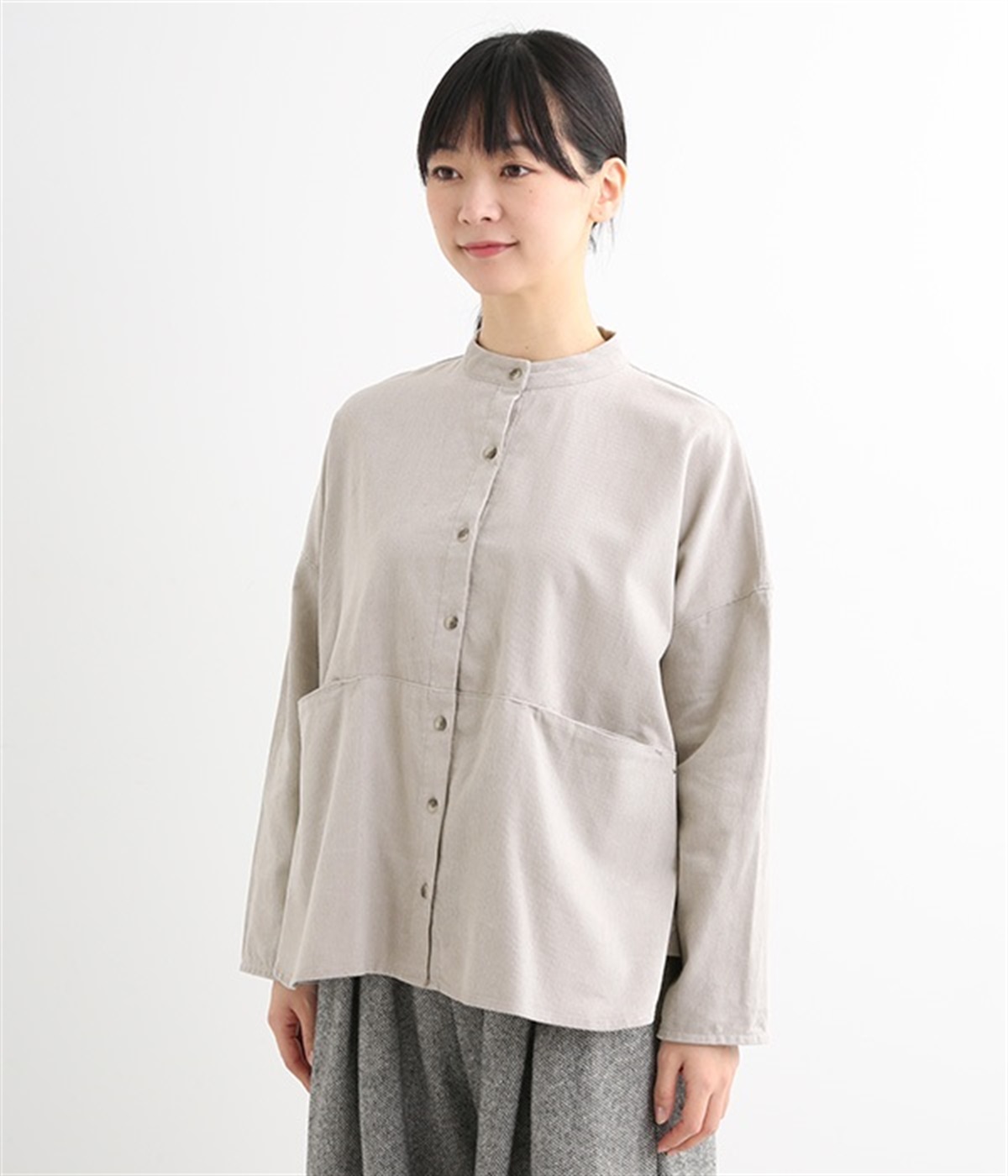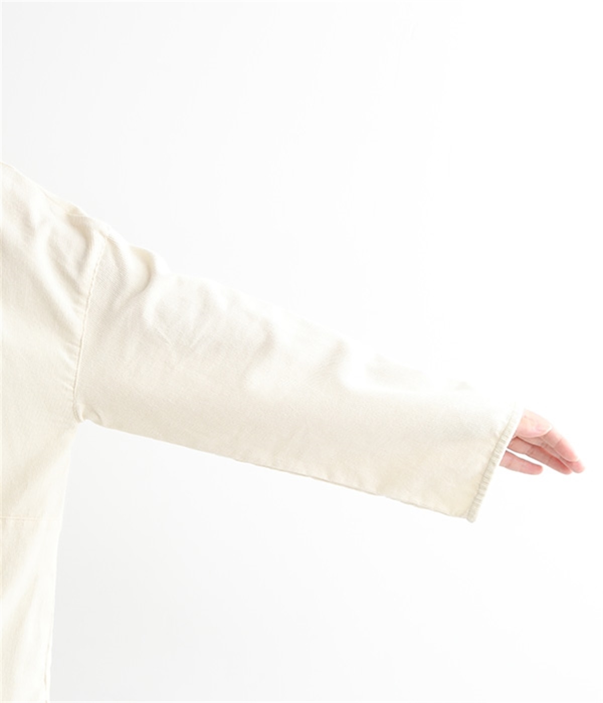 暖かみのある表情が特徴のコットンコーデュロイで仕立てたブラウスです。細畝なのでカジュアルになりすぎず、大人な着こなしにマッチします。柔らかく薄手の生地なのでロングシーズン着まわせます。切り替え位置から下のポケットがデザインポイント。フルオープンにして羽織りものとしてスタイリングするのもおすすめです。