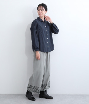 多彩なスタイリングが楽しめるシンプルな襟つきシャツです。前立てのデザインや、後ろのハンガーループなど細かな仕様がポイントに。前あきで羽織りものとしても活躍します。