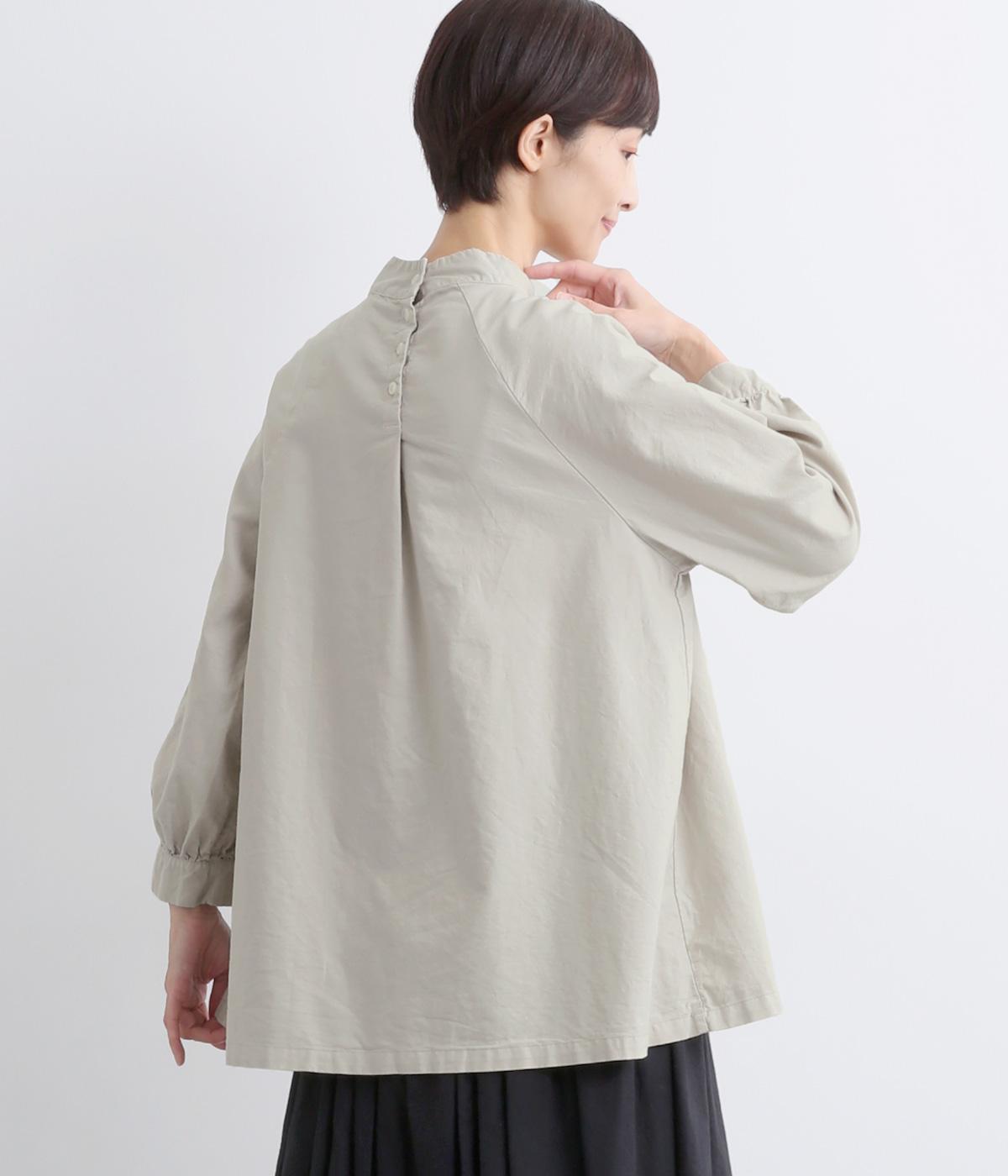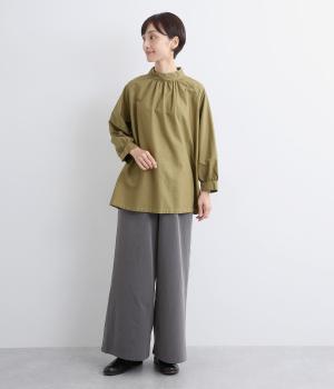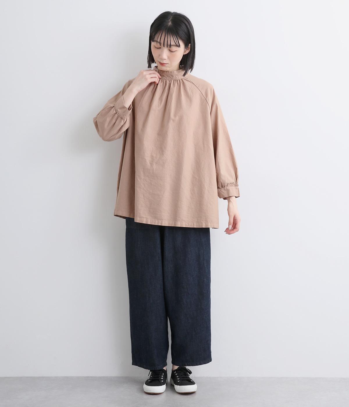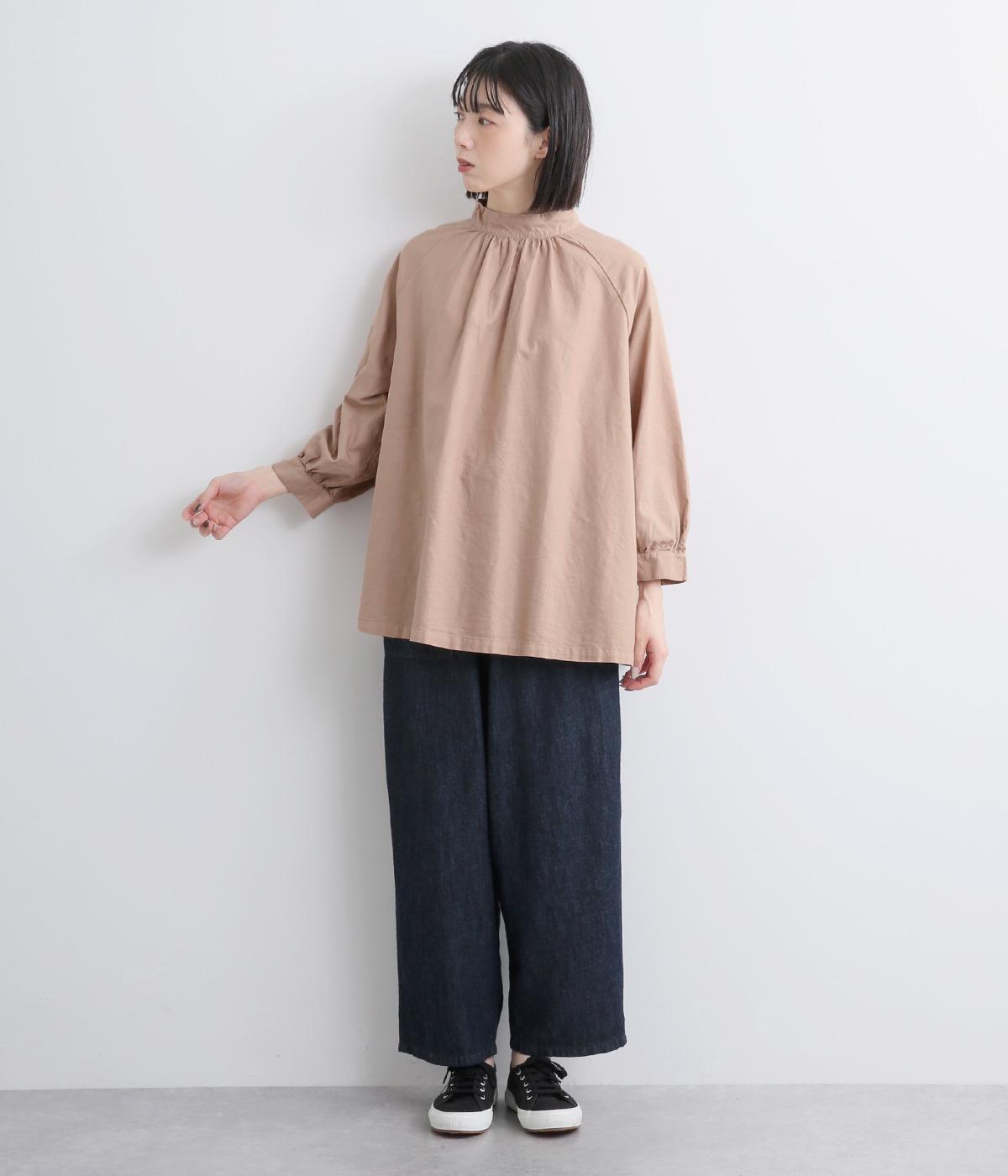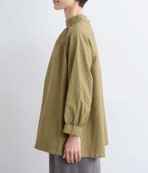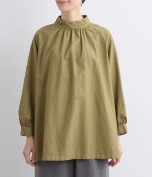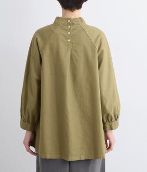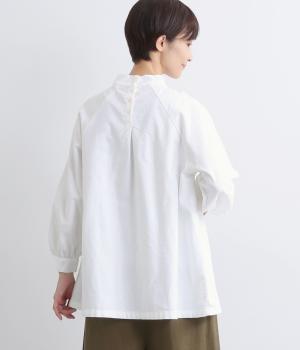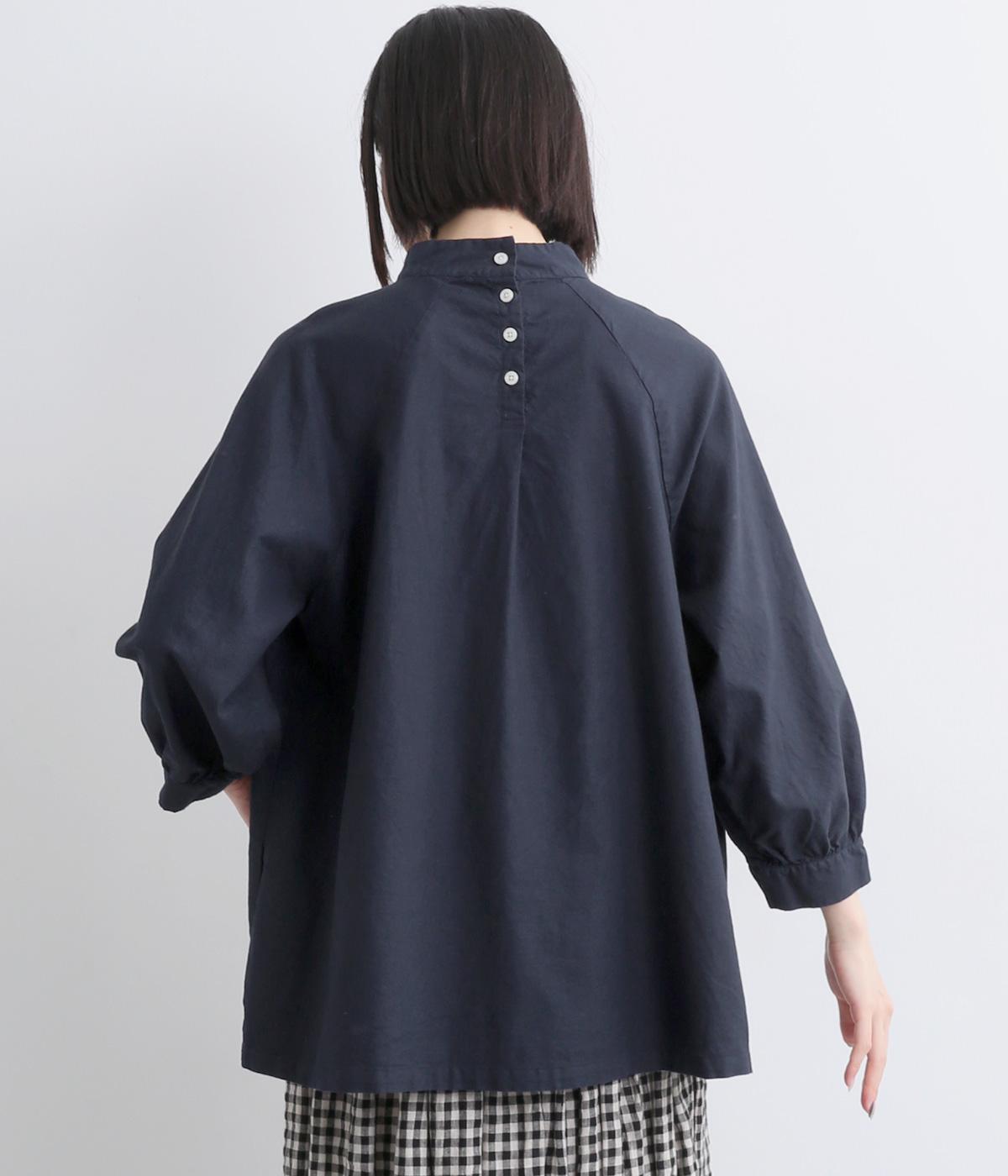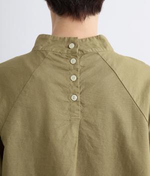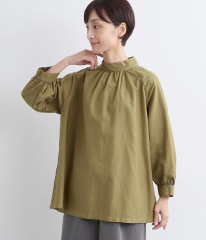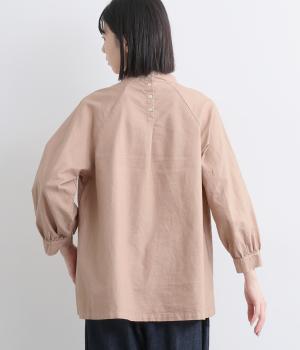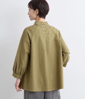 首元がすっきりと見えるスタンドカラーの9分袖ブラウスです。肩まわりに窮屈さを感じにくいラグランスリーブ仕立てで、全体が華奢に見えるのがポイント。バックスタイルのアクセントにもなる後ろボタンあきは、着脱のしやすさも◎。