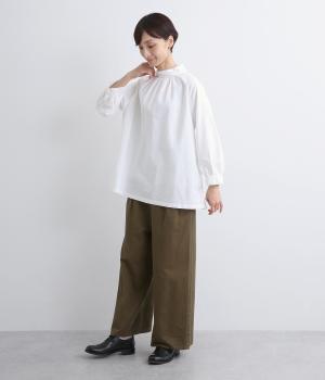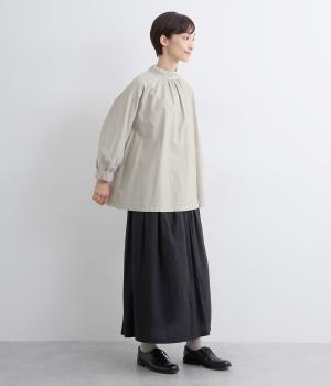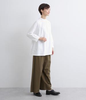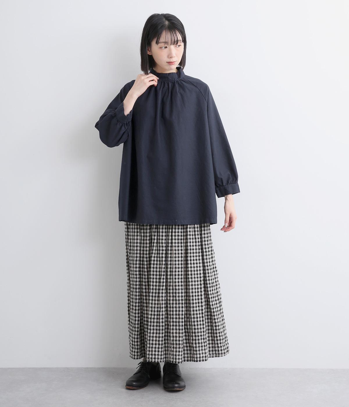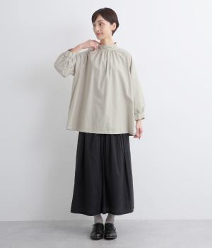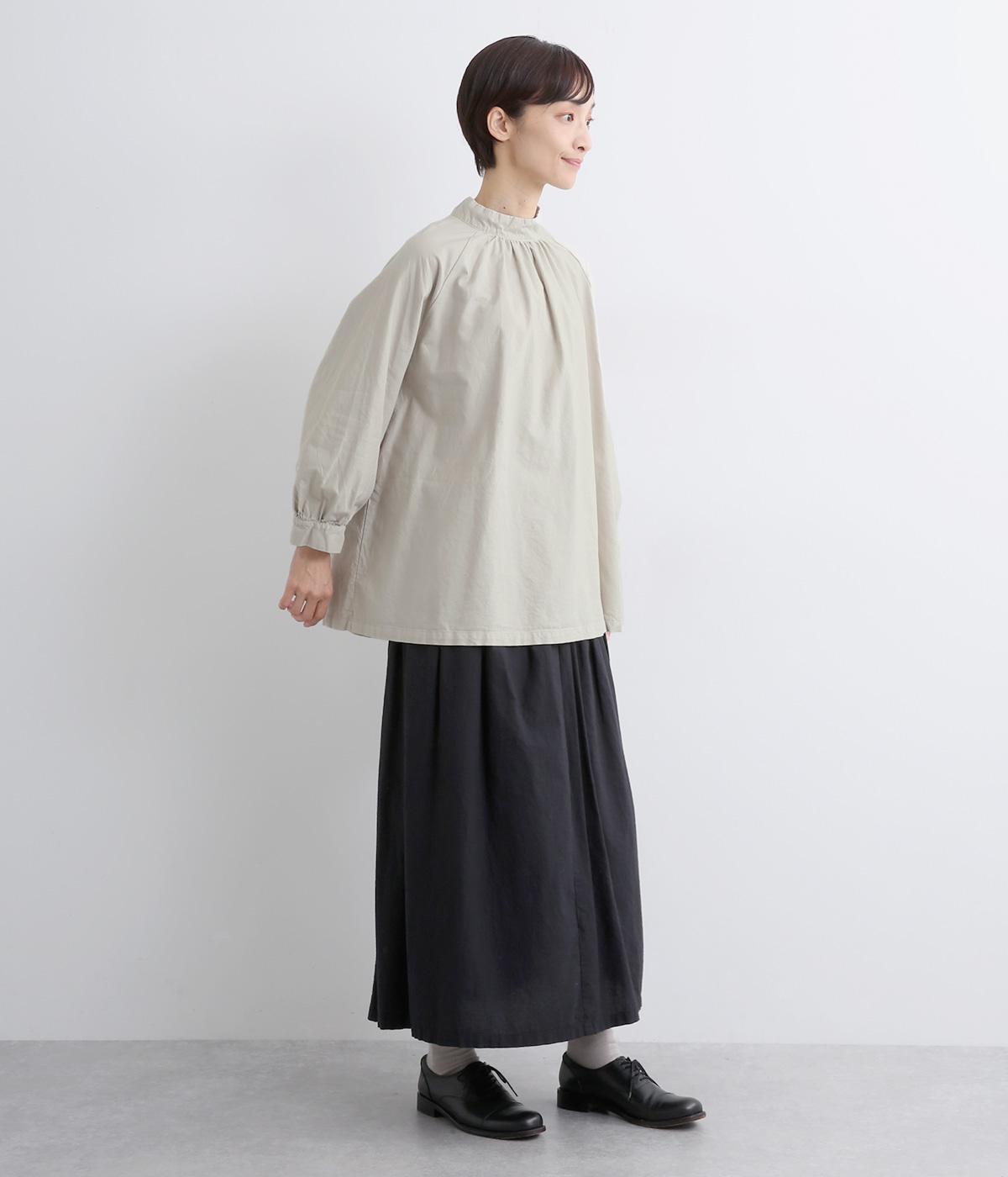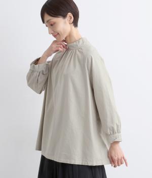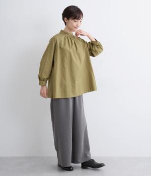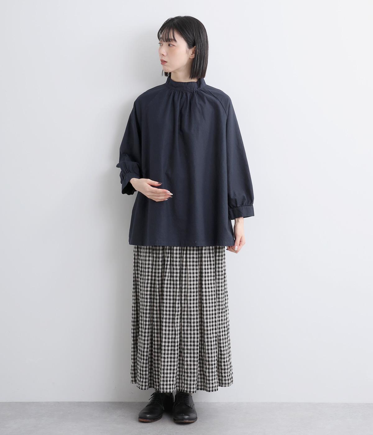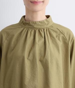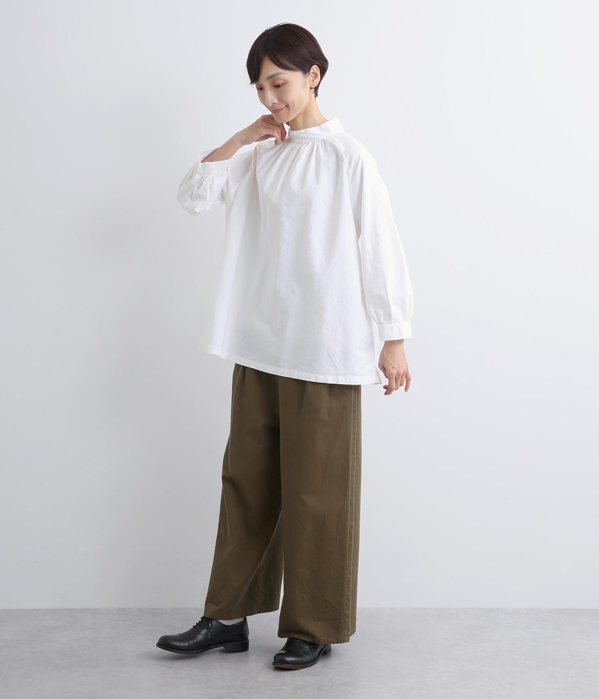 首元がすっきりと見えるスタンドカラーの9分袖ブラウスです。肩まわりに窮屈さを感じにくいラグランスリーブ仕立てで、全体が華奢に見えるのがポイント。バックスタイルのアクセントにもなる後ろボタンあきは、着脱のしやすさも◎。
