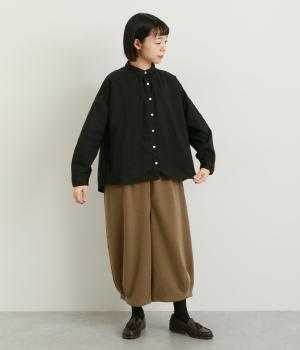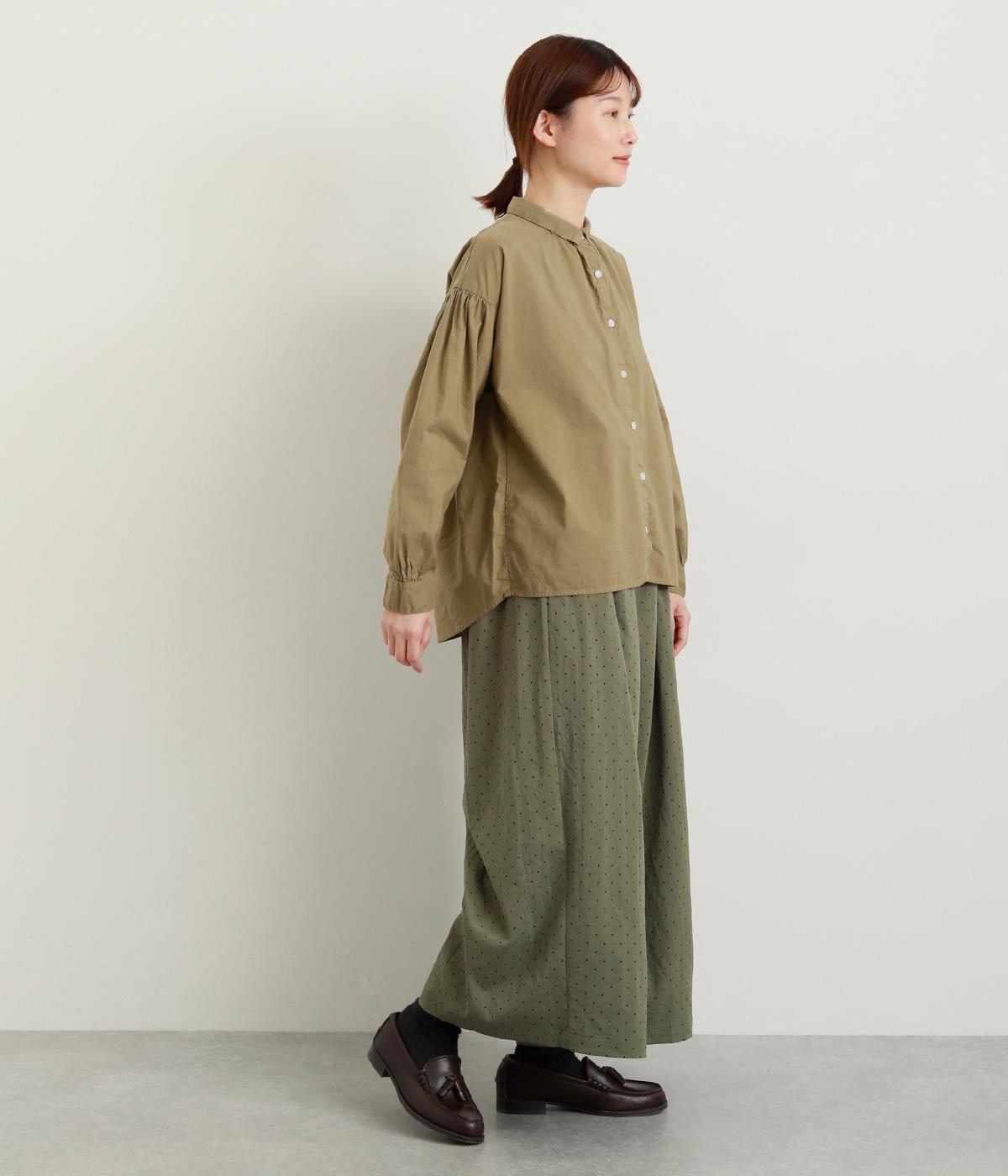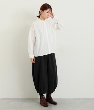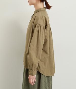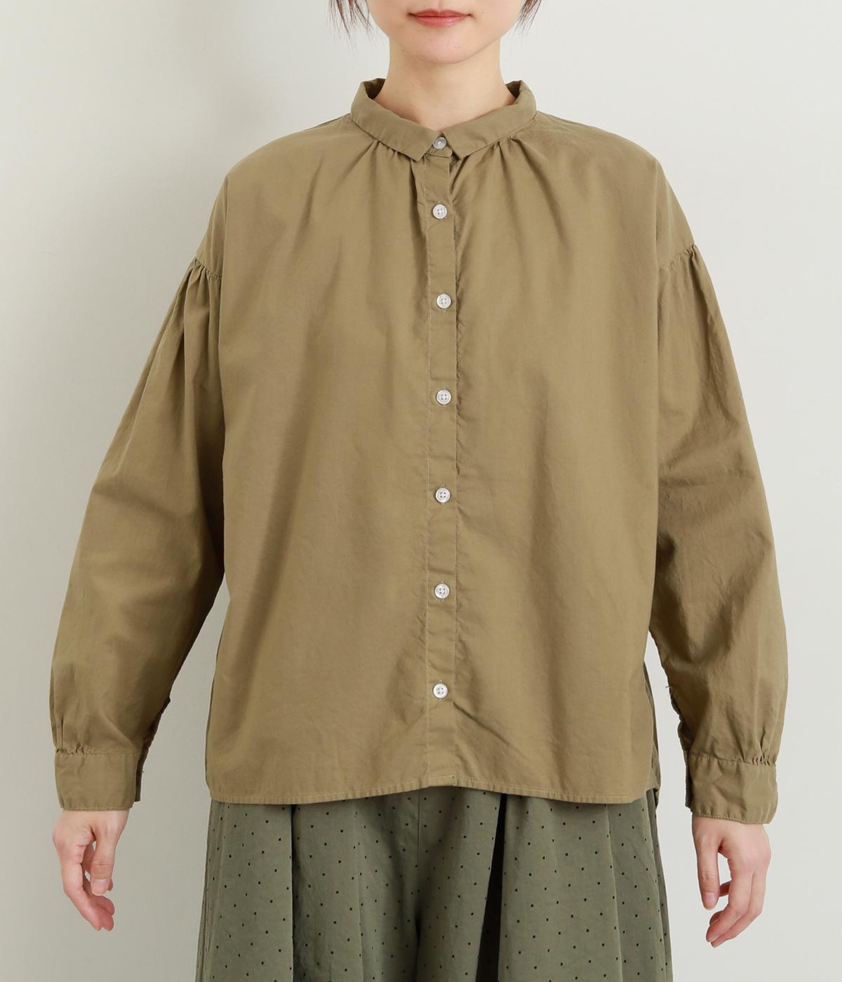 顔まわりをやさしく見せる小さめの襟と、肩まわりに入れたギャザーがポイントです。背面ヨークにもたっぷり寄せたギャザーが広がり、軽やかに動きの出るシルエットに。ほどよい甘さのデザインなので、シンプルなボトムに合わせるだけでふんわりと女性らしい雰囲気にまとまります。