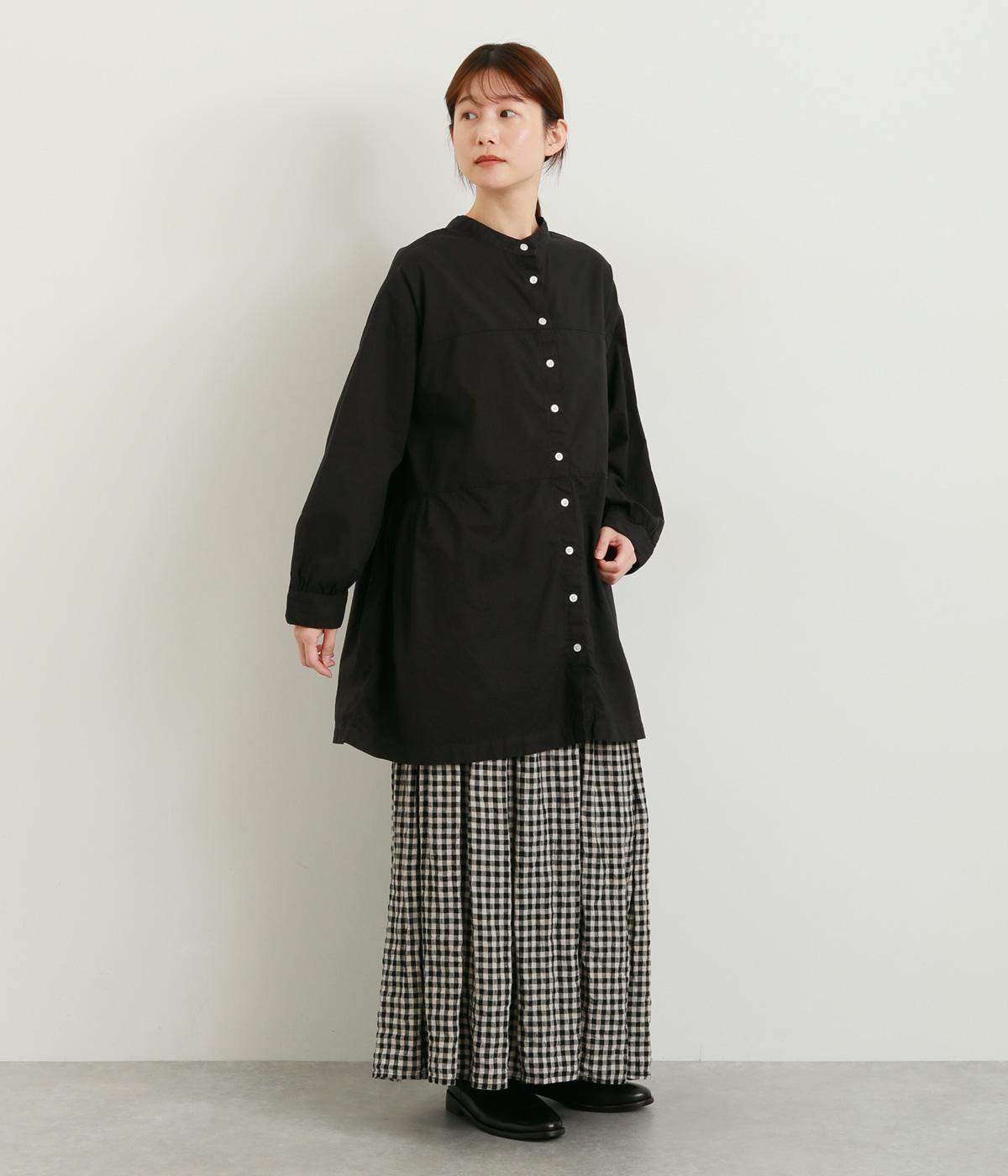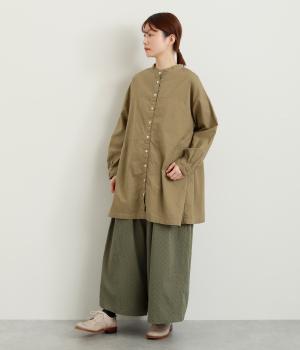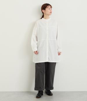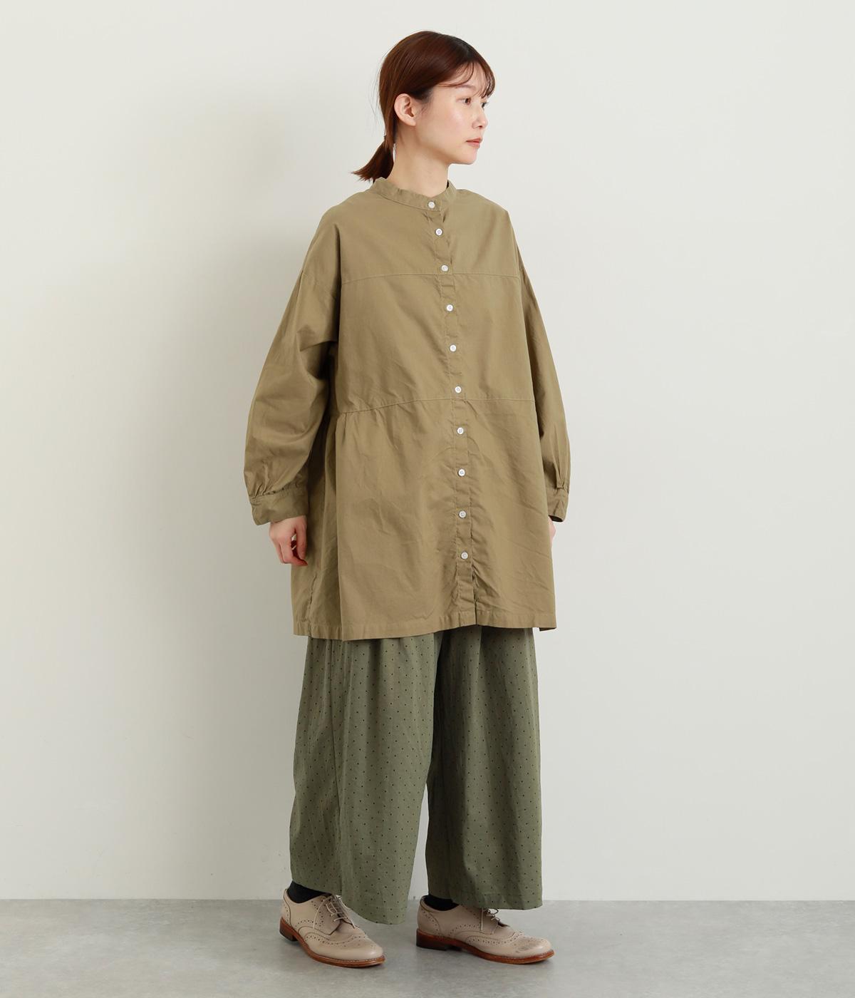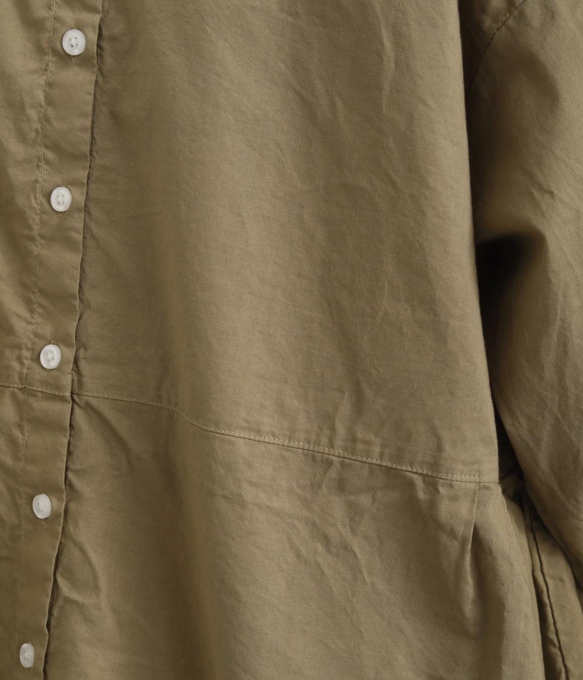 職人の手仕事による製品染めで、コットン平織りの生地にゆたかな風合いをプラスしました。洗い加工でくったりやわらかく、肌あたりもやさしい仕上がり。自然なシワ感が表情をつくり、毎日の装いにそっとなじむ素材感です。