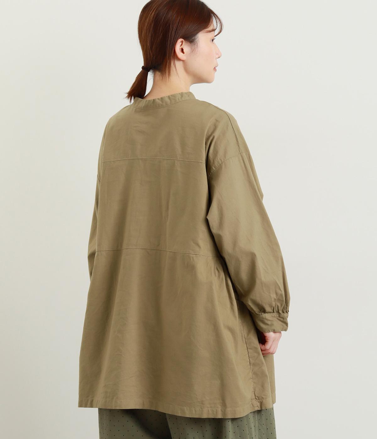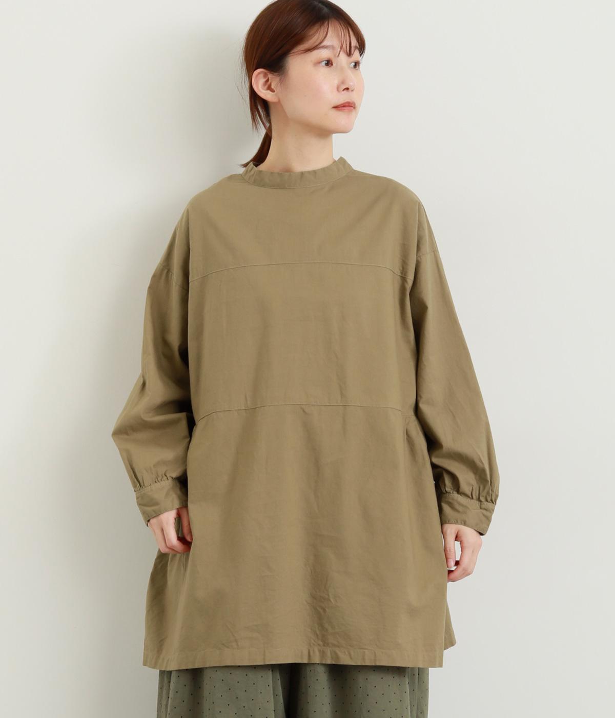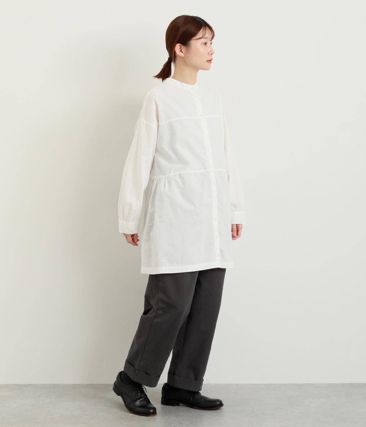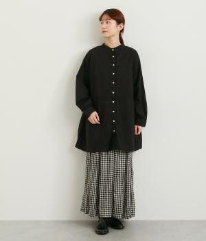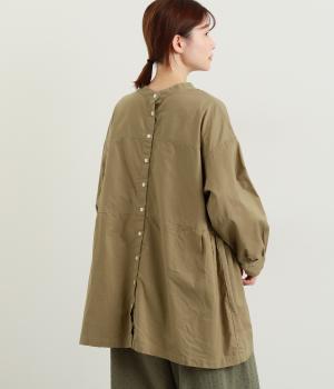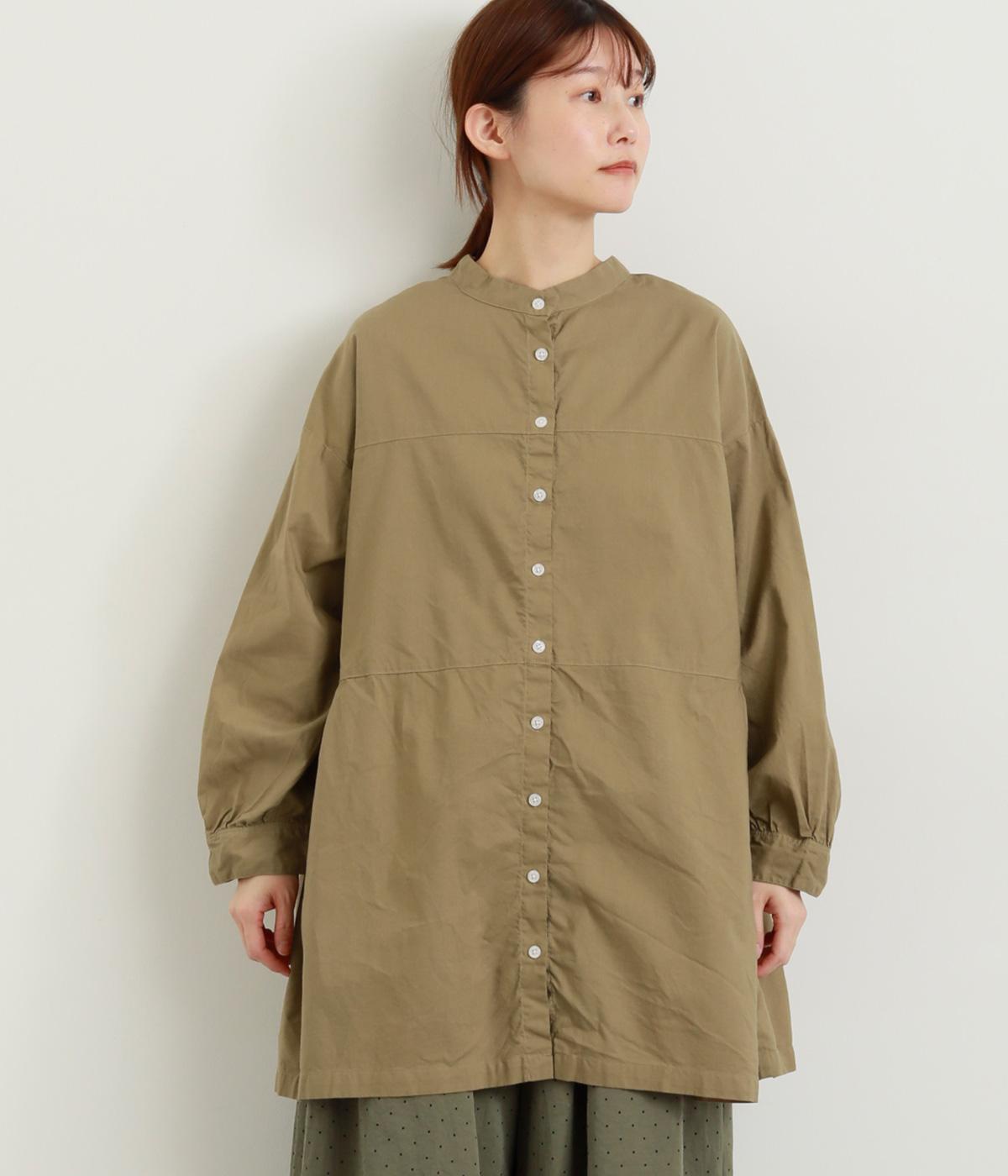 職人の手仕事による製品染めで、コットン平織りの生地にゆたかな風合いをプラスしました。洗い加工でくったりやわらかく、肌あたりもやさしい仕上がり。自然なシワ感が表情をつくり、毎日の装いにそっとなじむ素材感です。