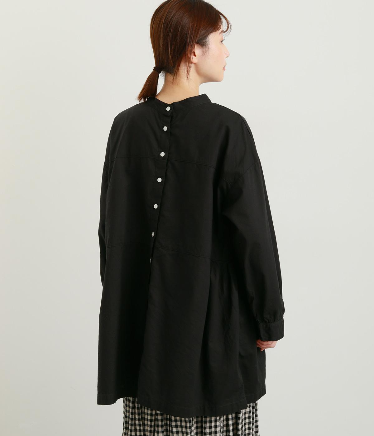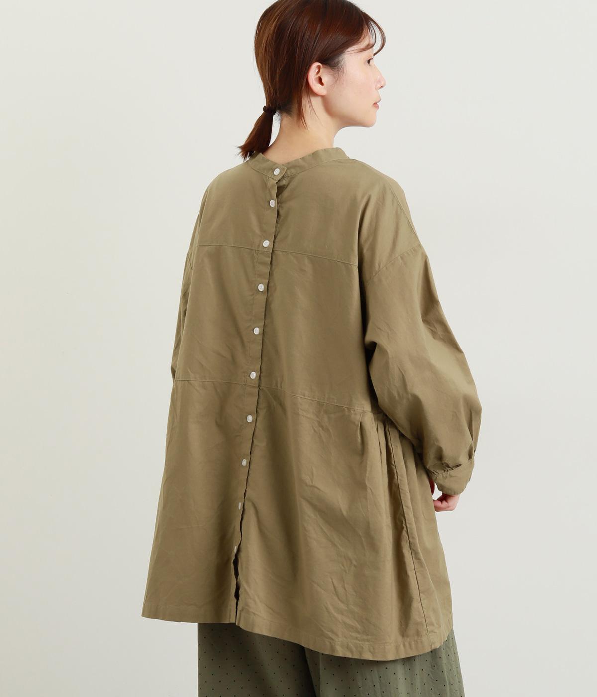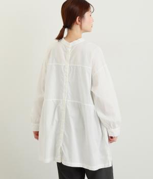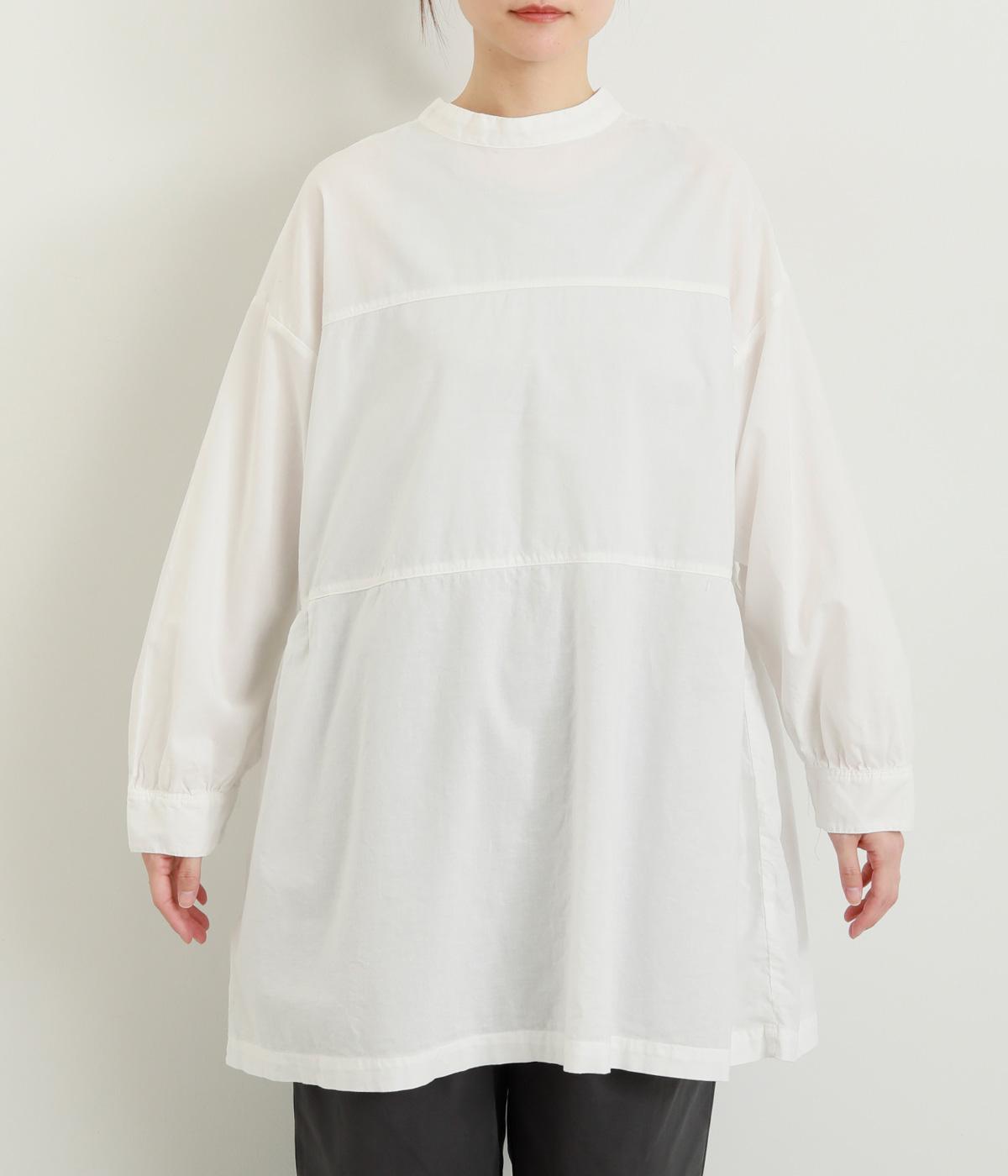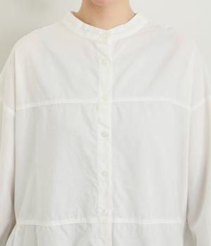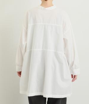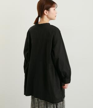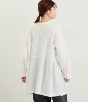 前後でデザインが変わる2way仕様のブラウスです。ボタンを前にするとクラシック調に、反対側はミニマルでやわらかな印象にまとまります。ティアード切り替えとギャザーがふんわりとしたシルエットをつくり、スタンドネックが全体をすっきり整え、甘さと落ち着きのバランスが絶妙な一枚です。