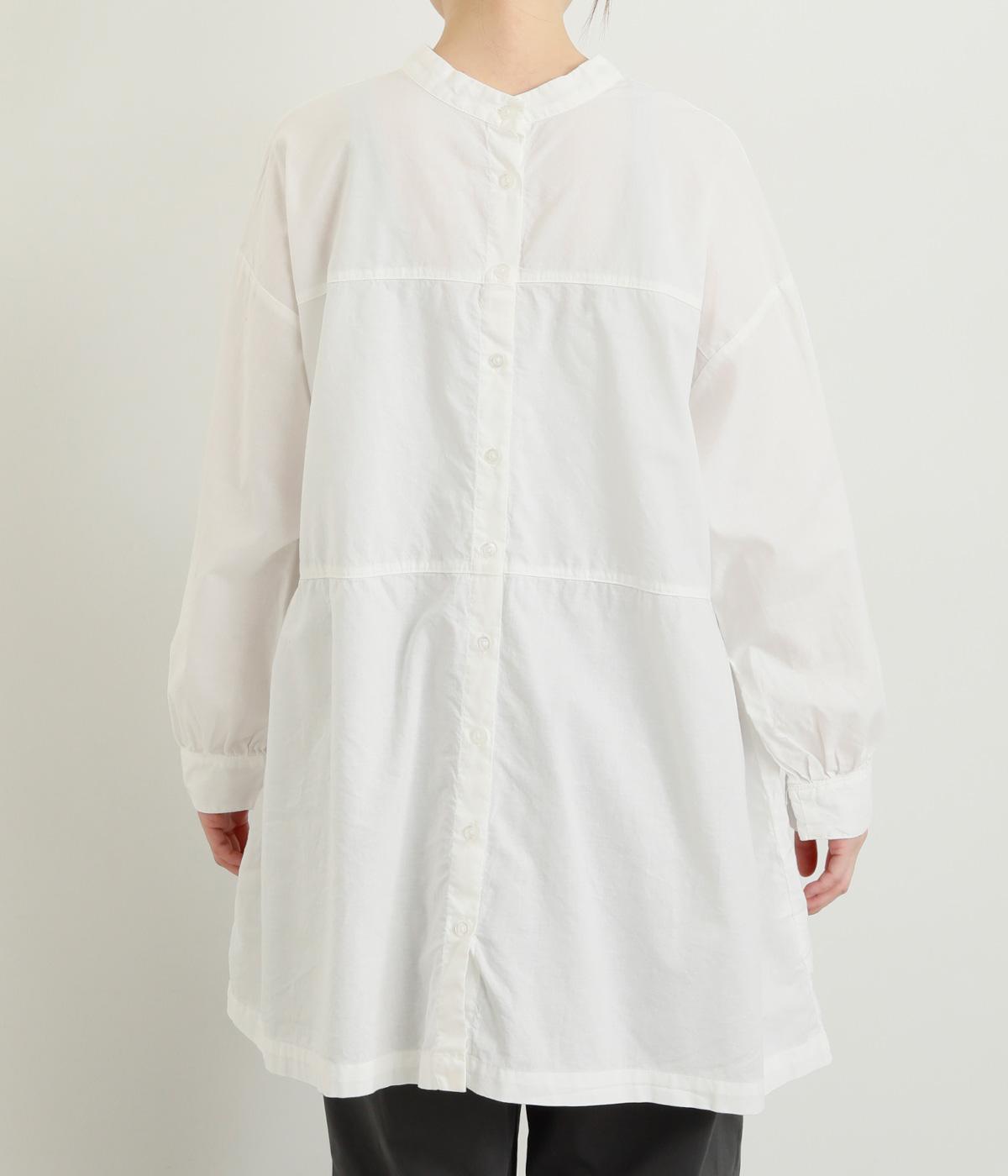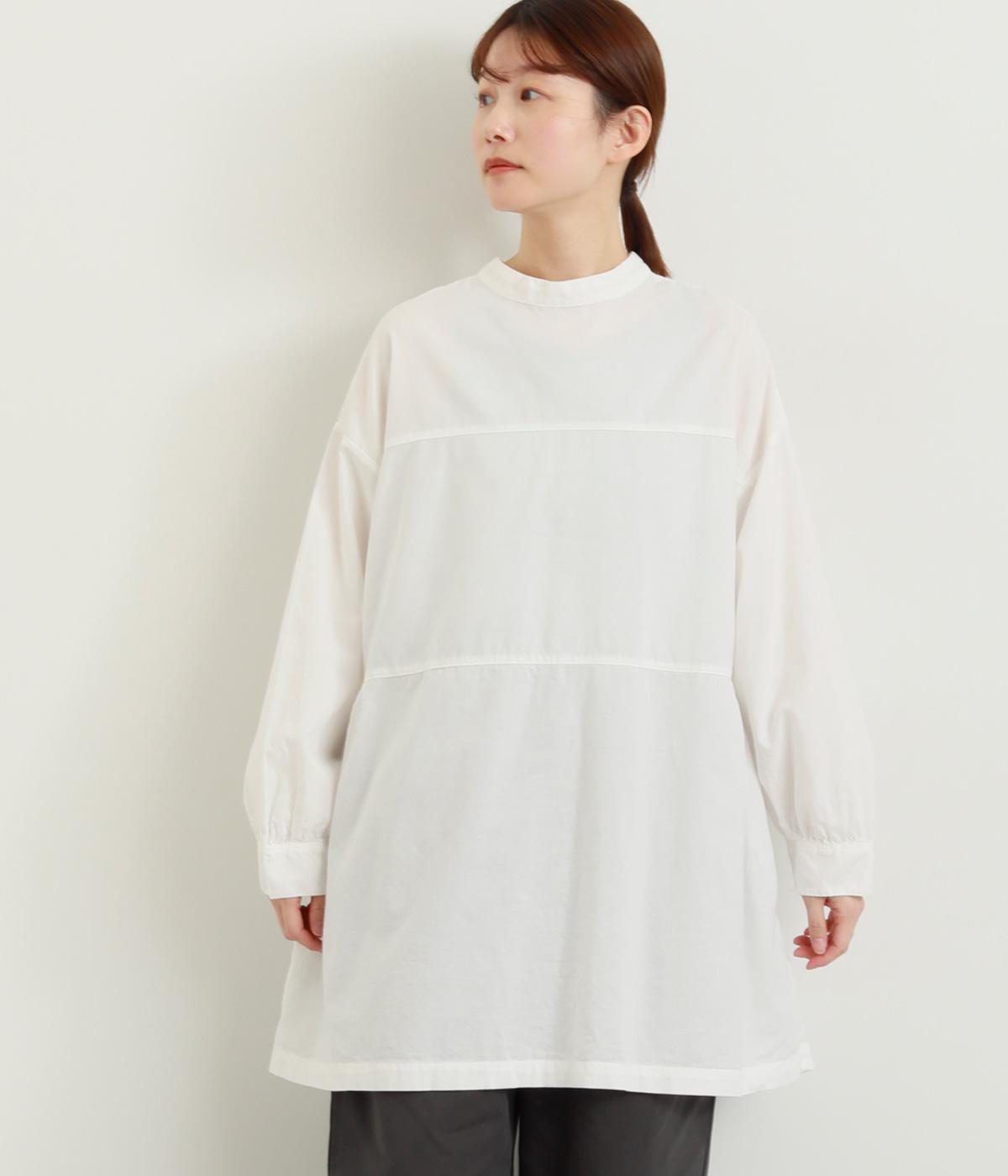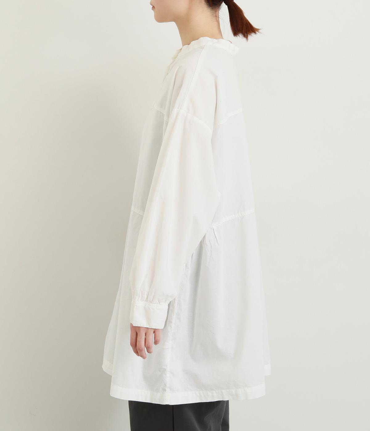 前後でデザインが変わる2way仕様のブラウスです。ボタンを前にするとクラシック調に、反対側はミニマルでやわらかな印象にまとまります。ティアード切り替えとギャザーがふんわりとしたシルエットをつくり、スタンドネックが全体をすっきり整え、甘さと落ち着きのバランスが絶妙な一枚です。