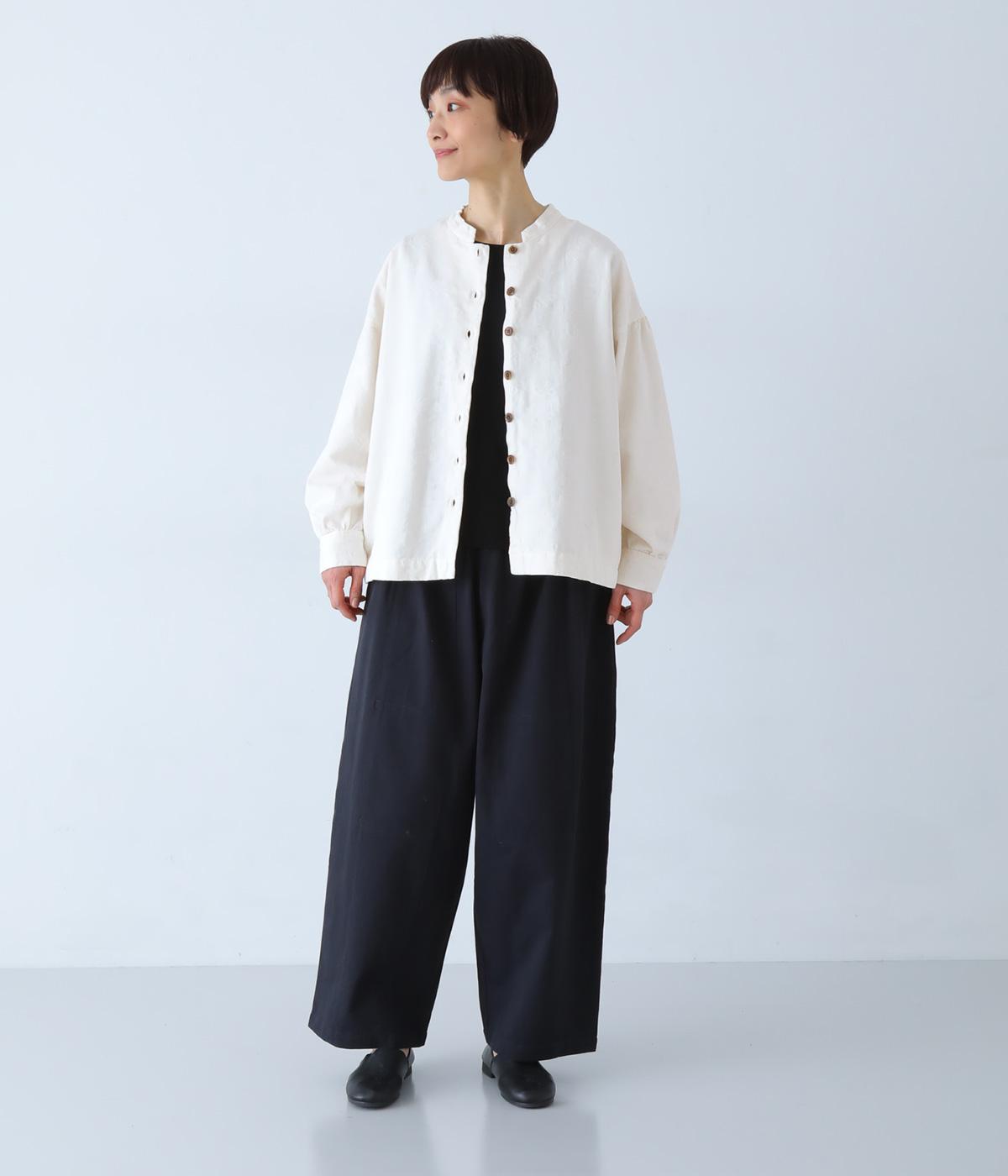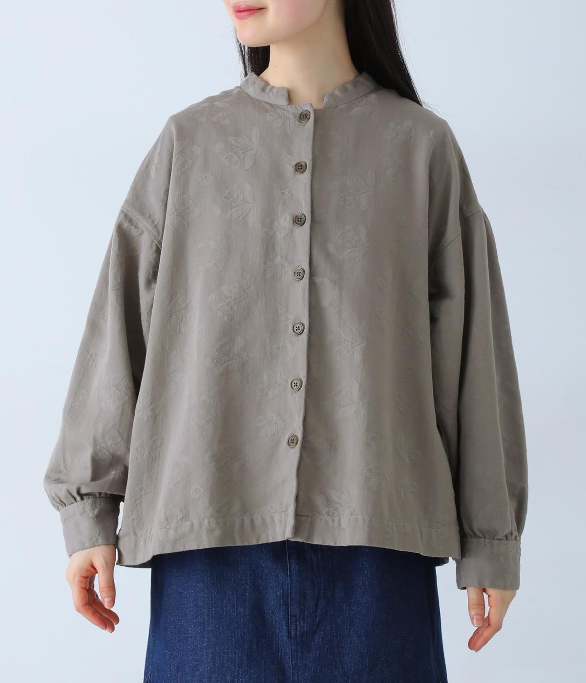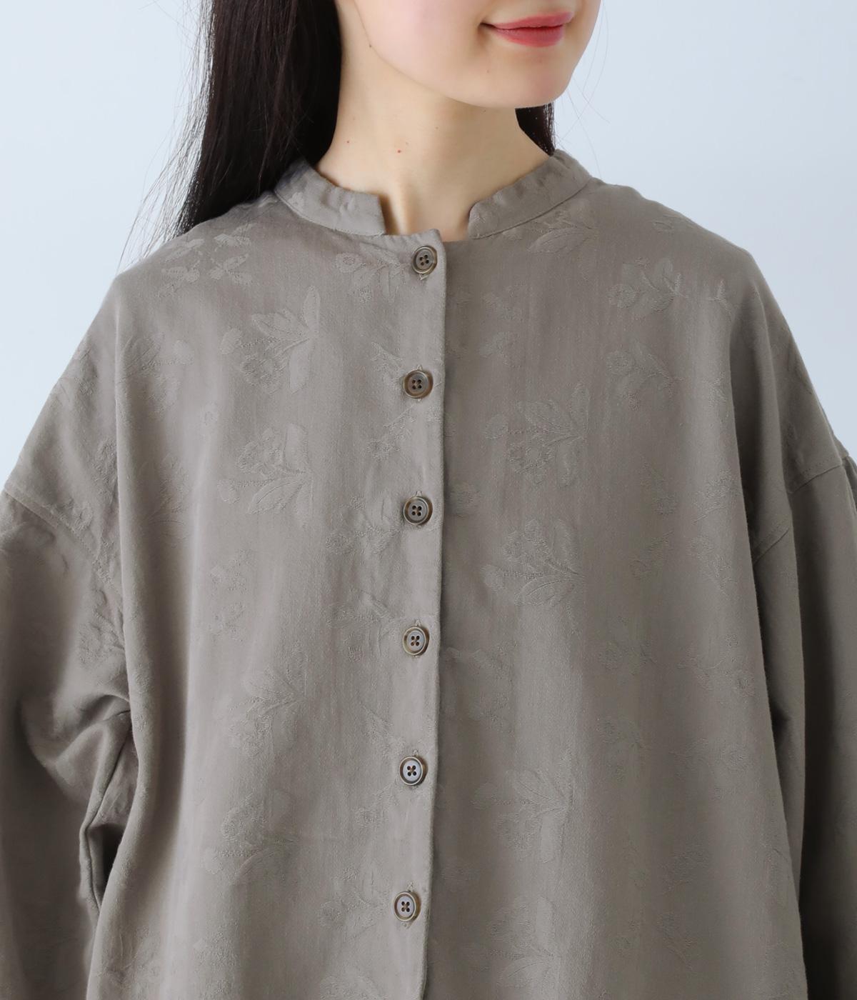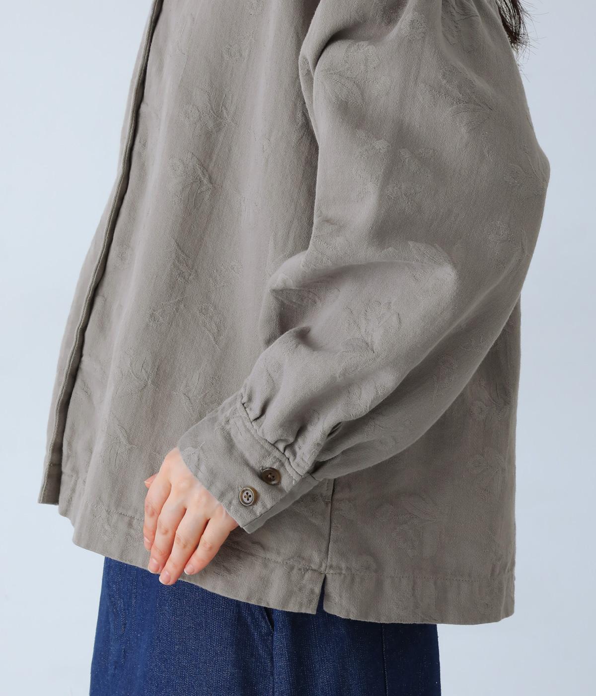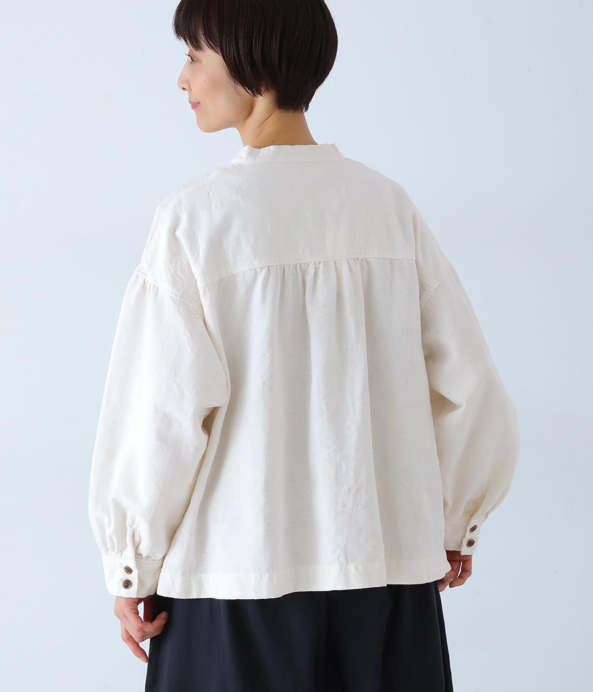 お花モチーフのジャカード柄が、上品な印象のシャツです。ゆとりのある身幅がリラックスした着心地を叶え、うしろヨークに入れたギャザーとボリューム袖が、やわらかなシルエットをつくります。首元は、コンパクトなスタンドカラーですっきりと。季節の変わり目には軽い羽織りとしても活躍する、便利な一枚です。
