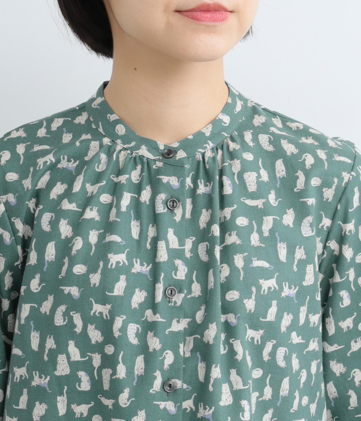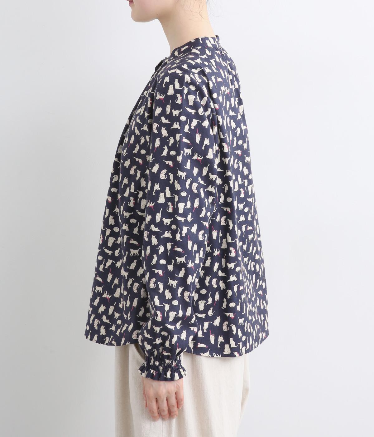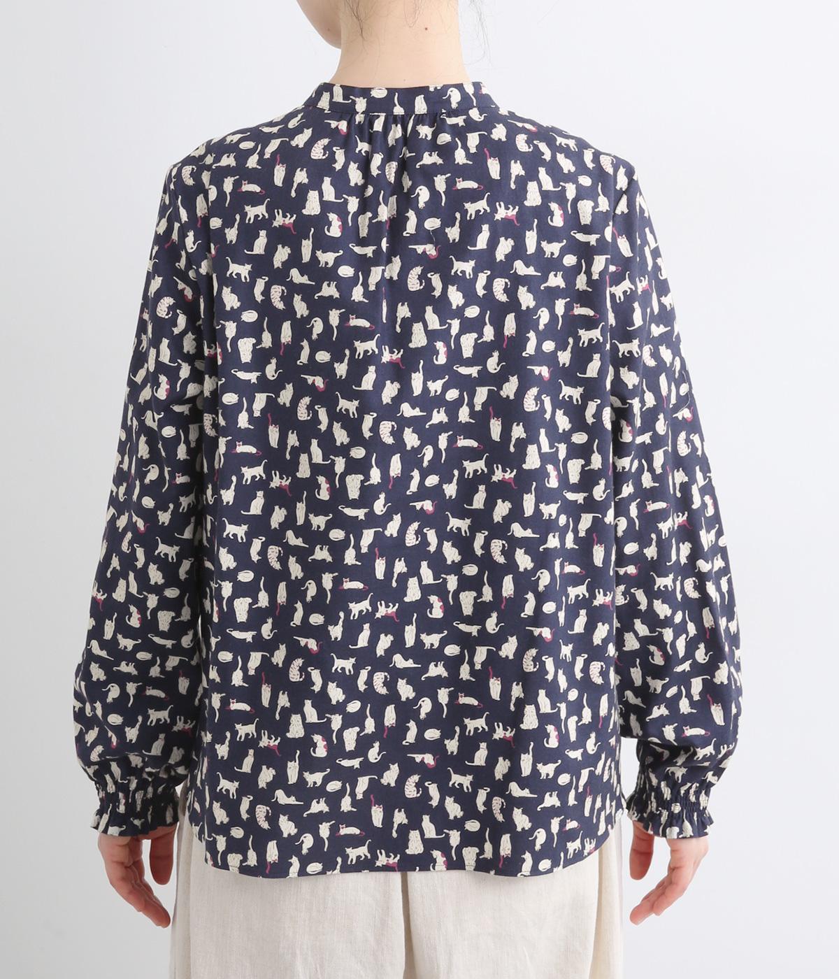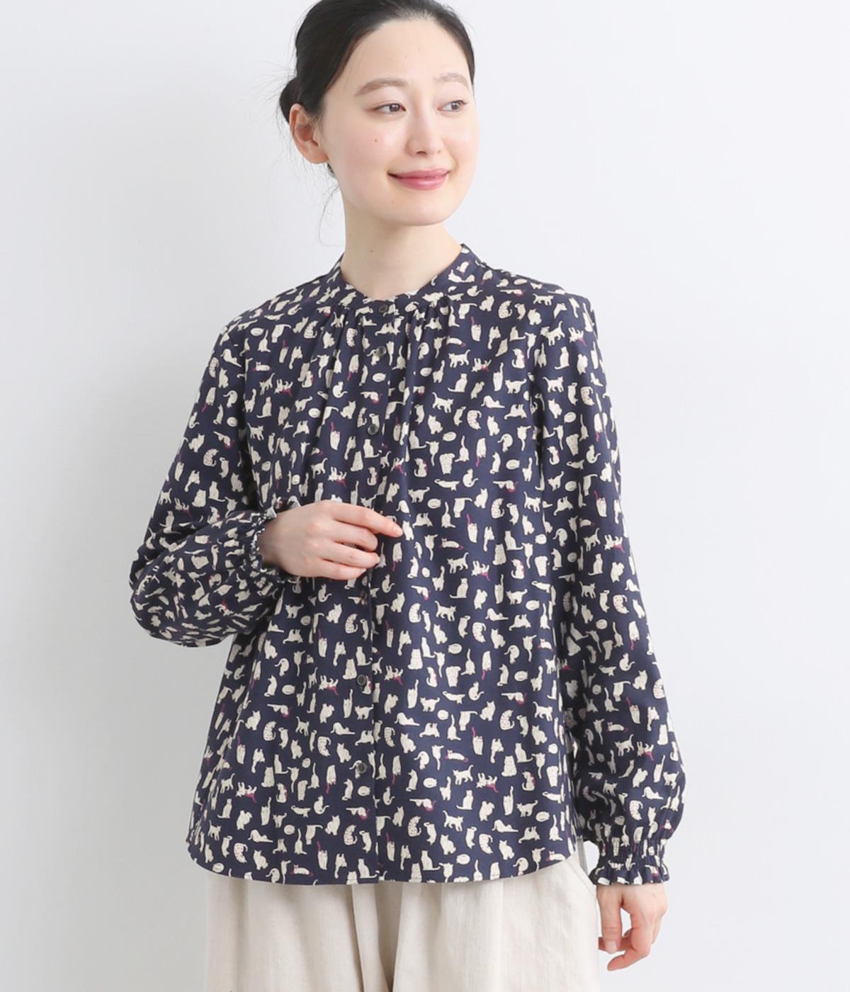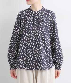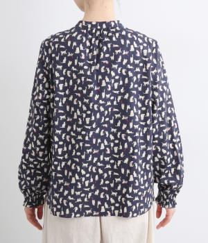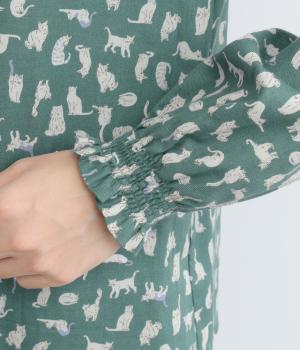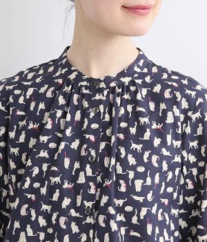 いろんな表情の猫が愛らしいブラウス。変則的な猫の向きや、ところどころちりばめられたアクセントカラーが表情に奥行きを与えます。袖口はシャーリング仕様で、袖の長さによって雰囲気の変化を楽しめます。