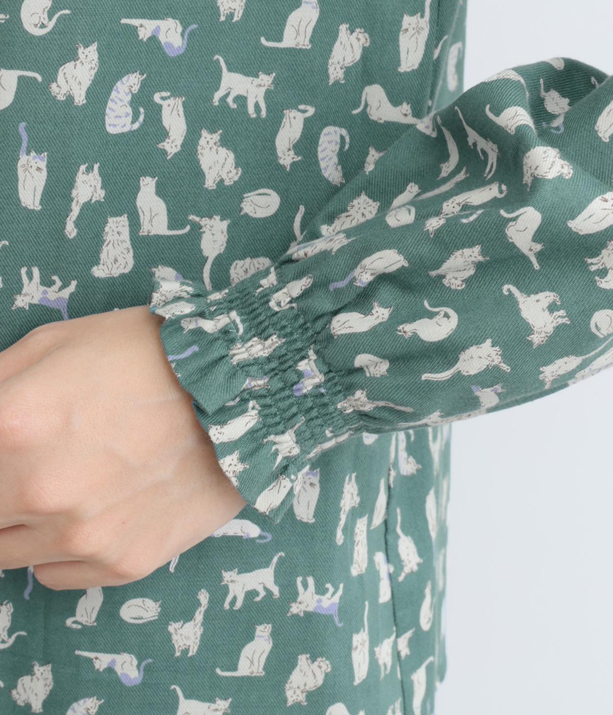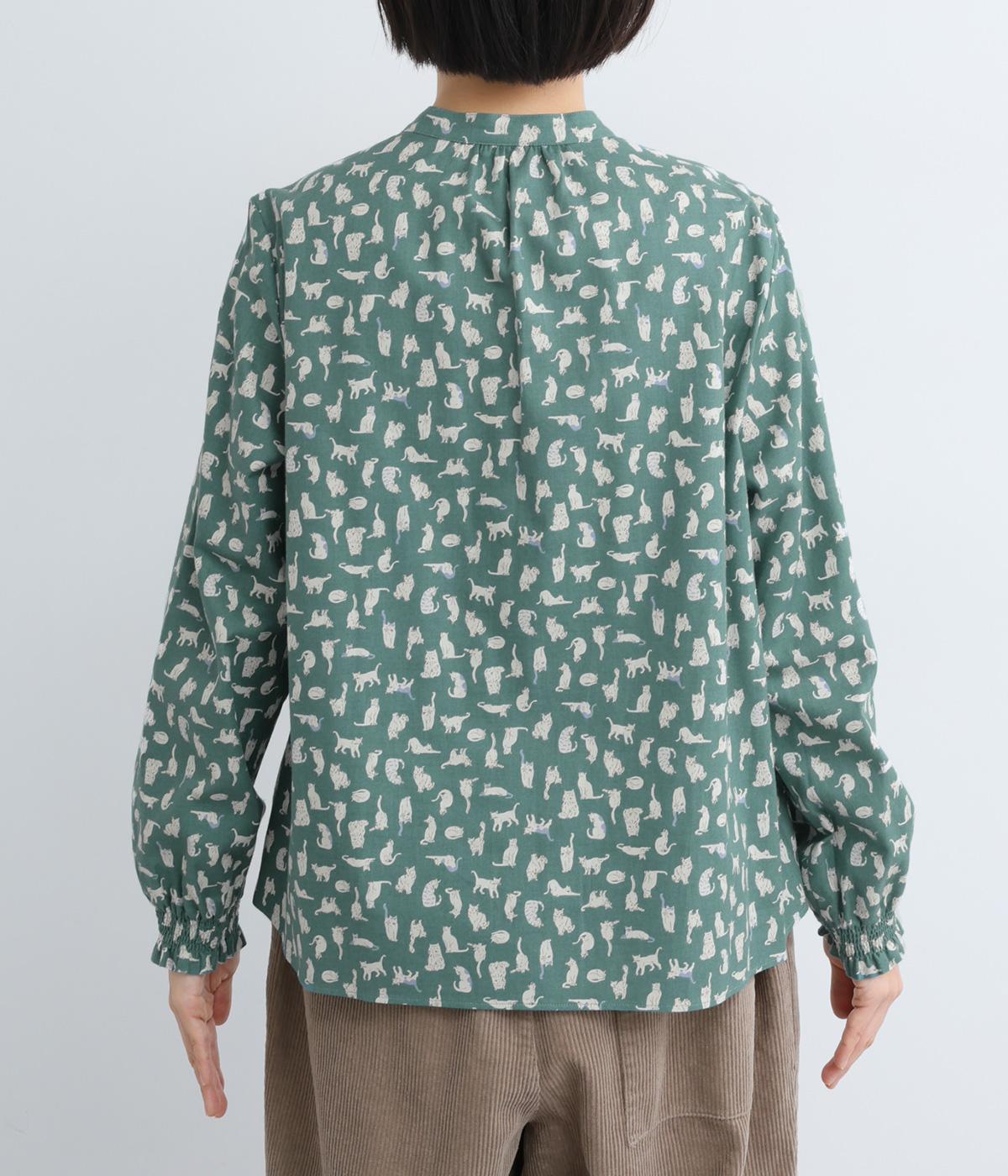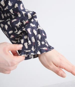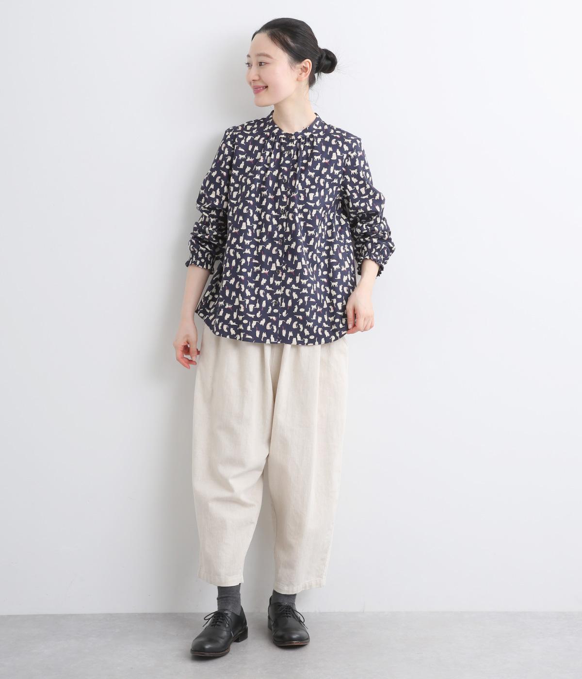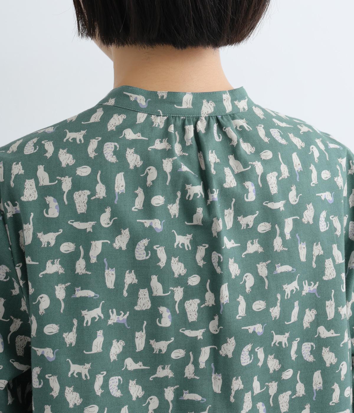 いろんな表情の猫が愛らしいブラウス。変則的な猫の向きや、ところどころちりばめられたアクセントカラーが表情に奥行きを与えます。袖口はシャーリング仕様で、袖の長さによって雰囲気の変化を楽しめます。