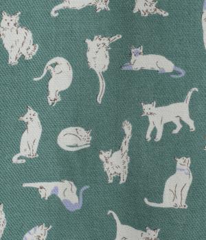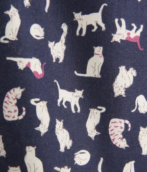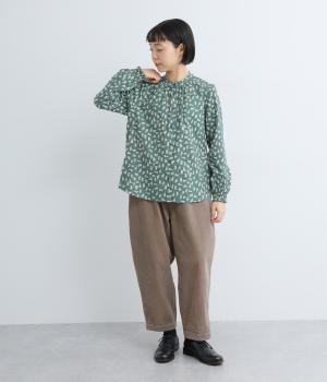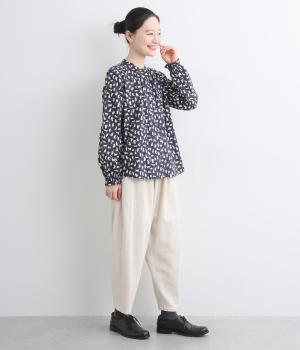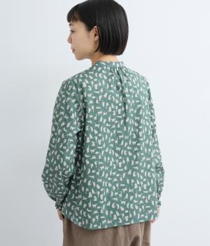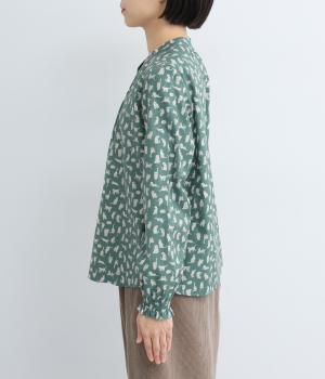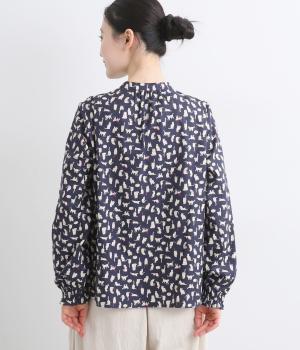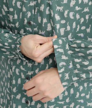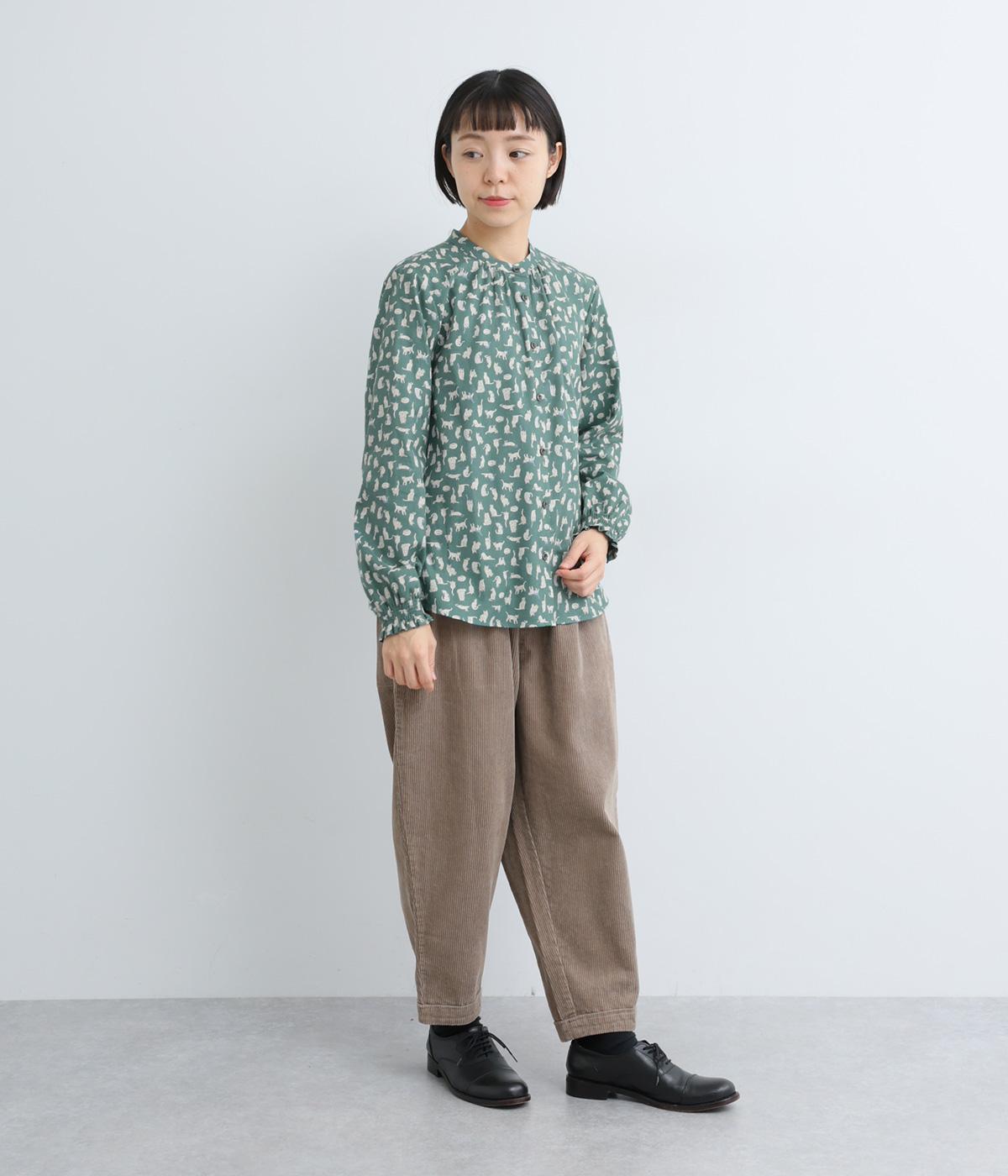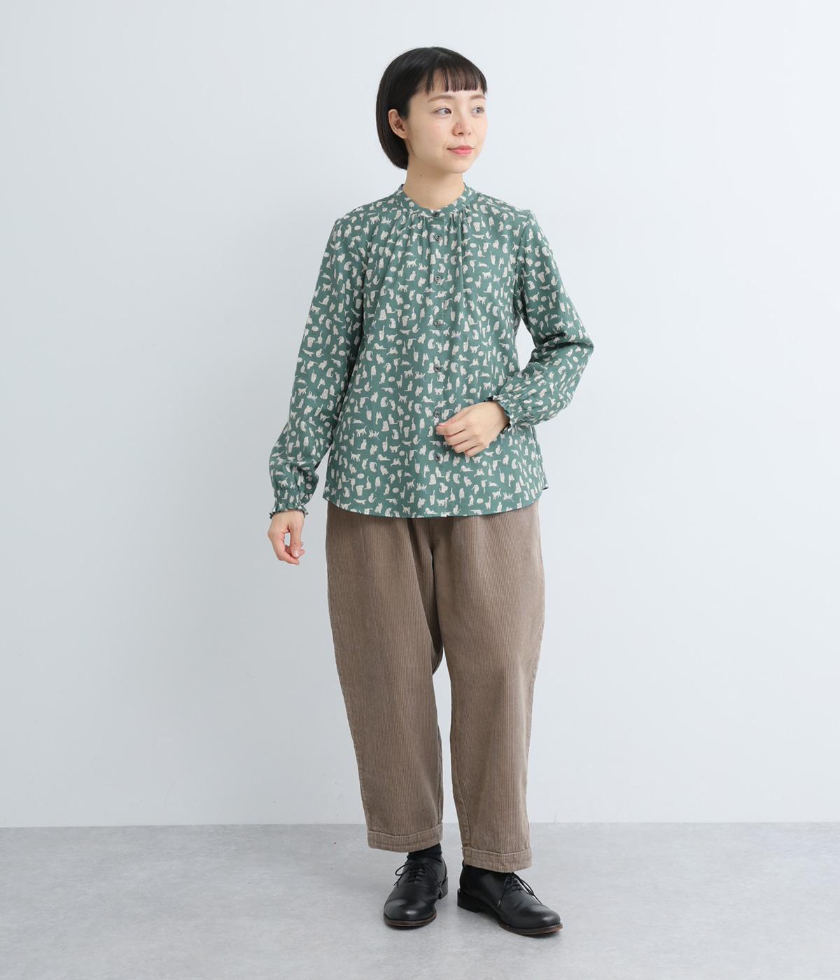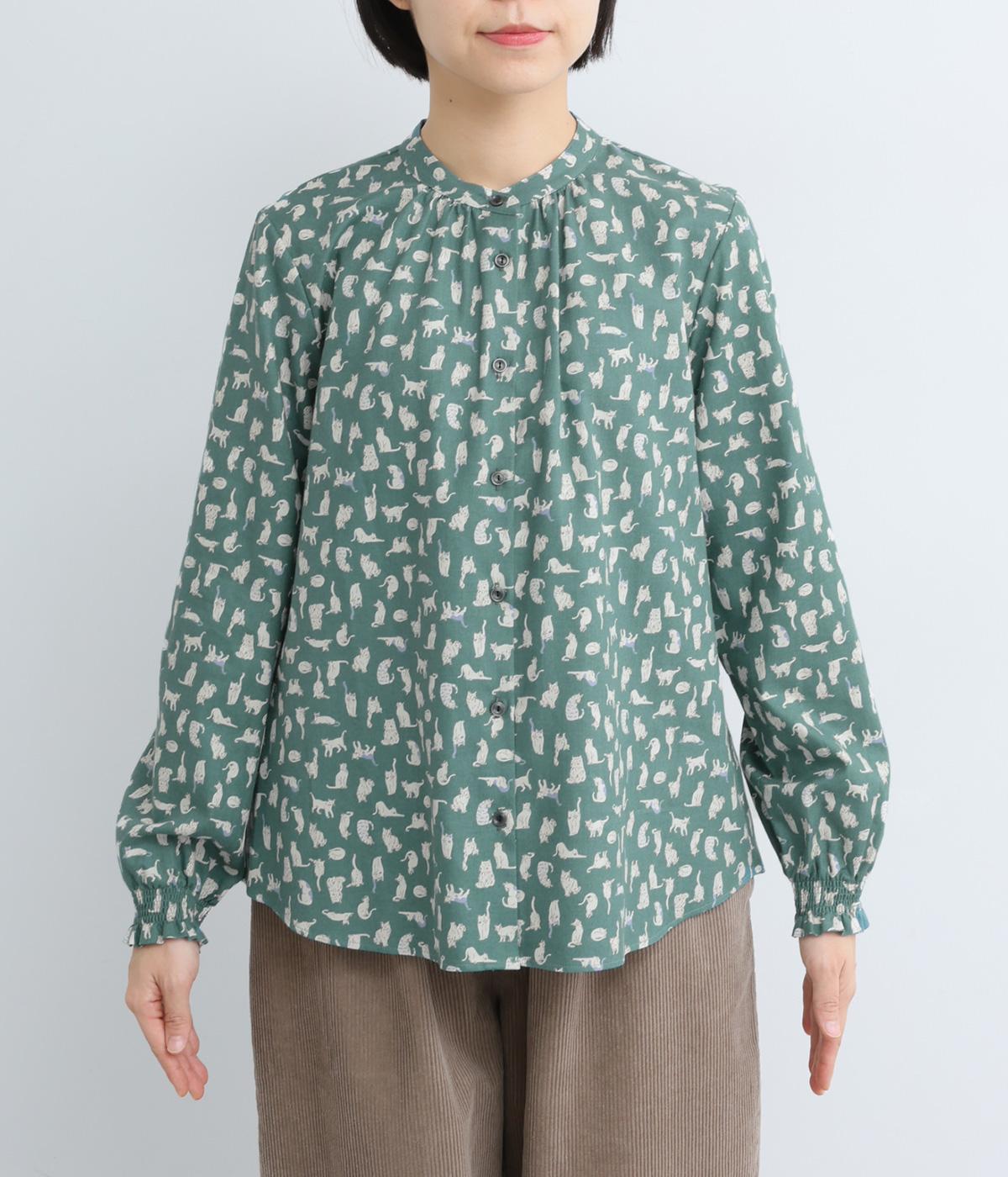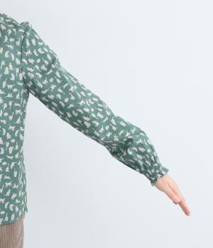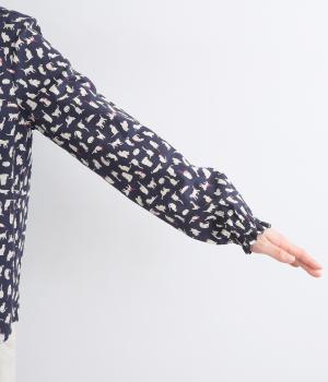 いろんな表情の猫が愛らしいブラウス。変則的な猫の向きや、ところどころちりばめられたアクセントカラーが表情に奥行きを与えます。袖口はシャーリング仕様で、袖の長さによって雰囲気の変化を楽しめます。