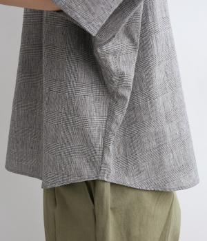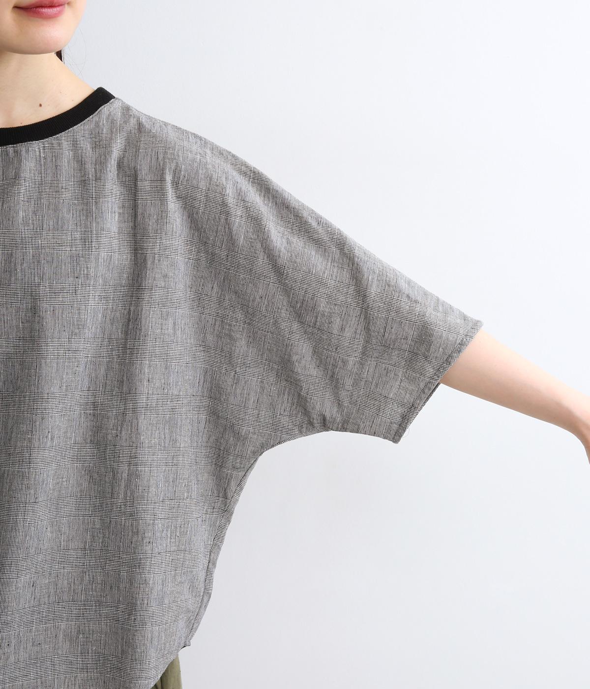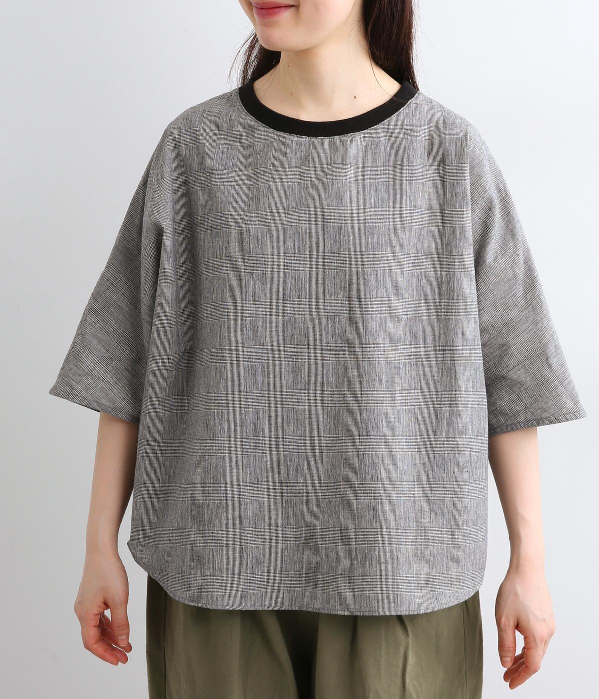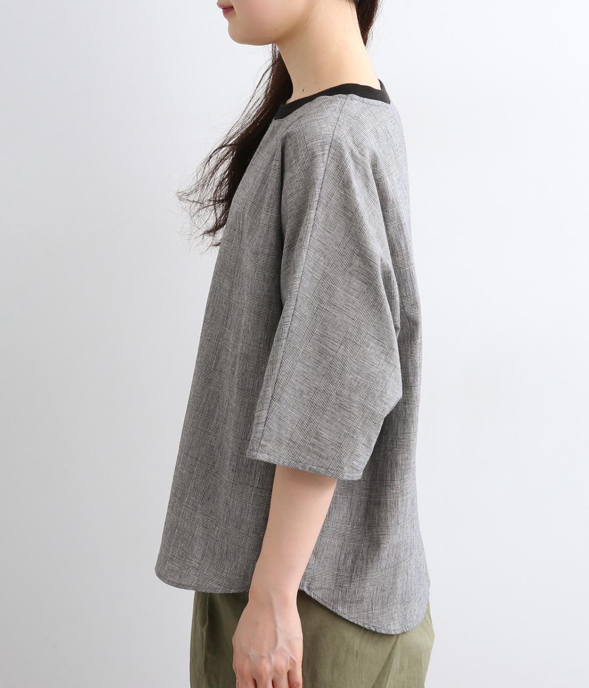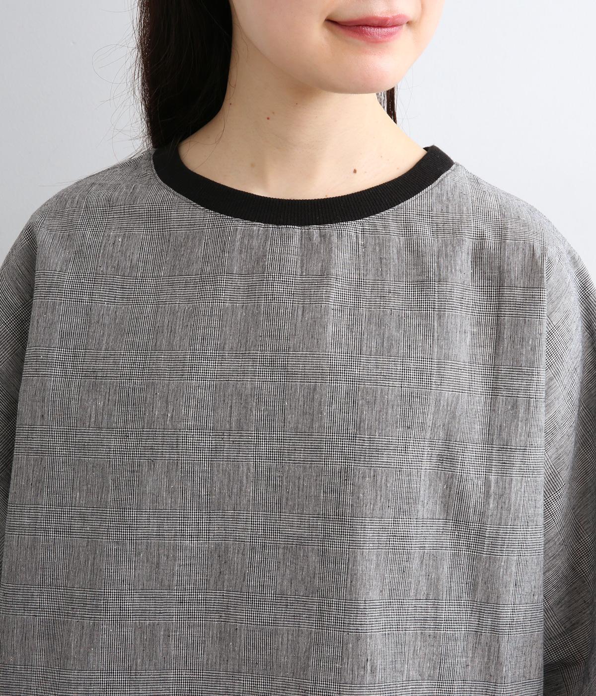 着こなしのワンポイントになるチェック柄プルオーバーは、襟ぐりを黒リブで引き締めてメリハリをつけました。身幅にゆとりを持たせたラグランタイプでリラックスムードを運ぶ一枚。裾はわずかに前後差をつけ、横姿も自然なラインに。