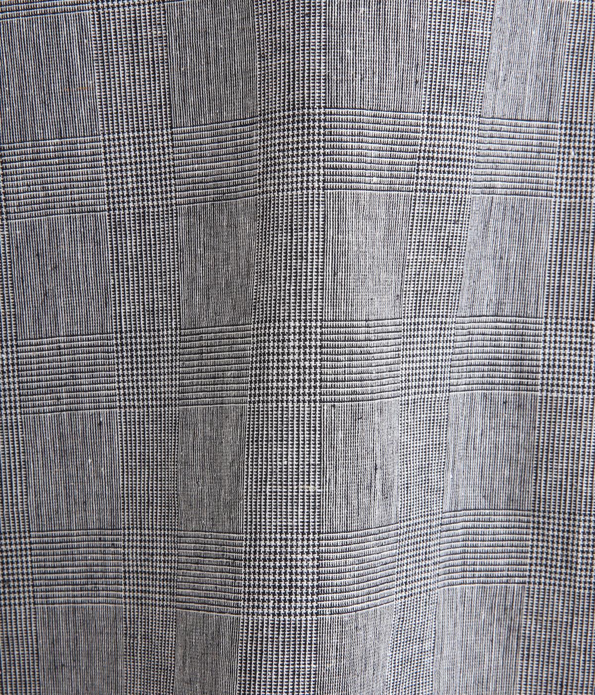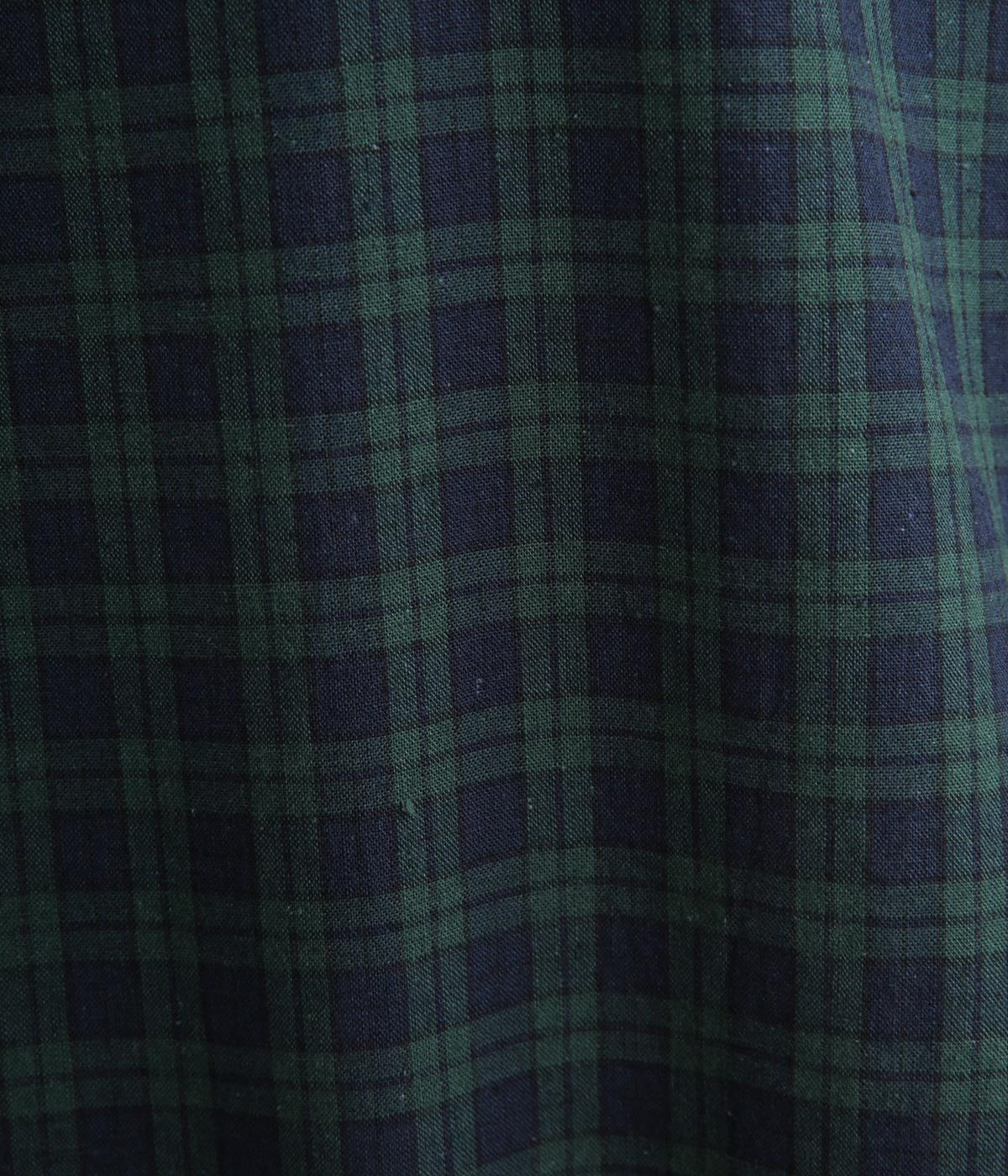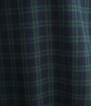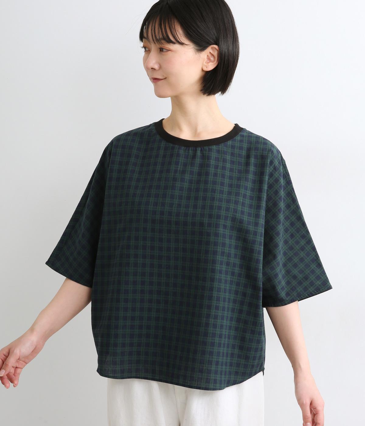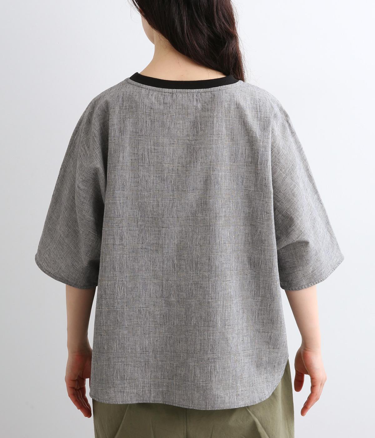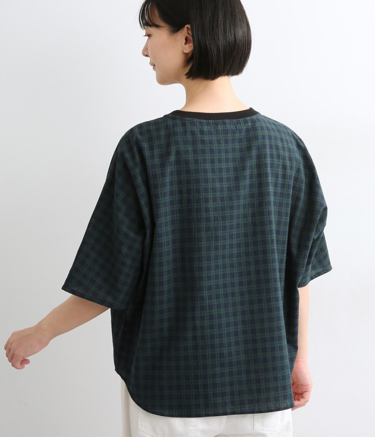 着こなしのワンポイントになるチェック柄プルオーバーは、襟ぐりを黒リブで引き締めてメリハリをつけました。身幅にゆとりを持たせたラグランタイプでリラックスムードを運ぶ一枚。裾はわずかに前後差をつけ、横姿も自然なラインに。