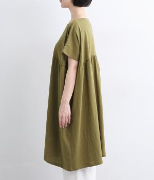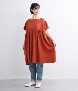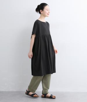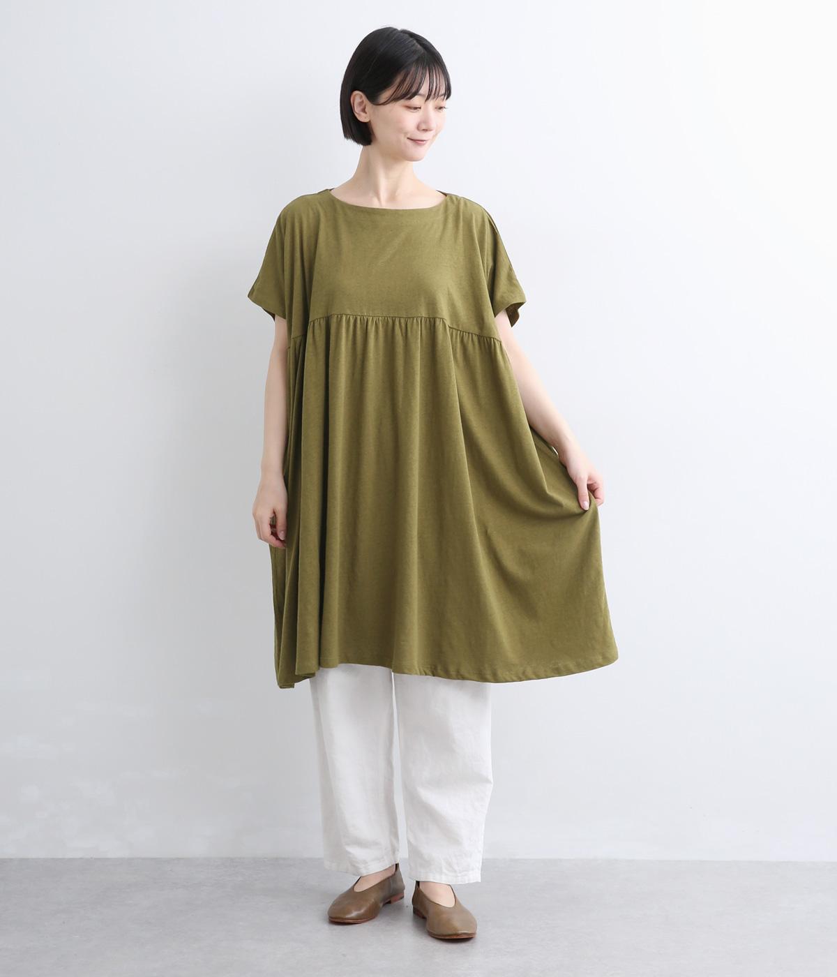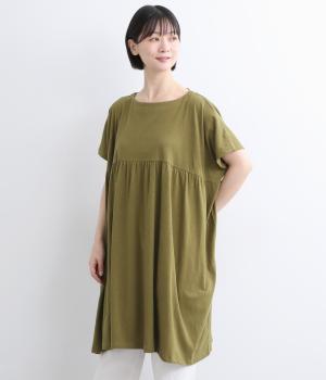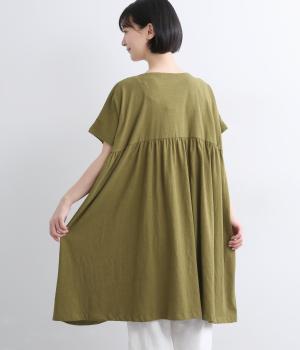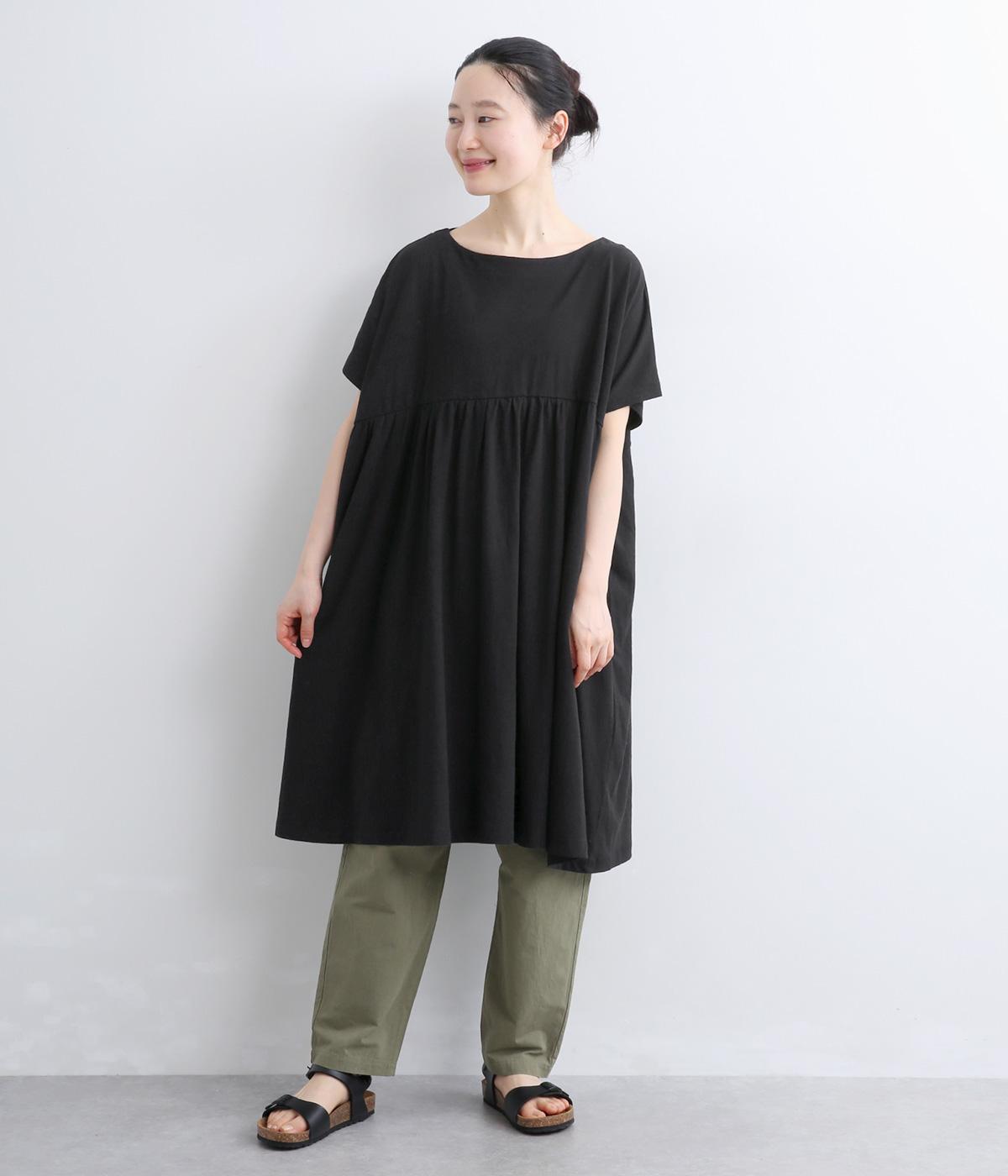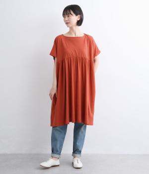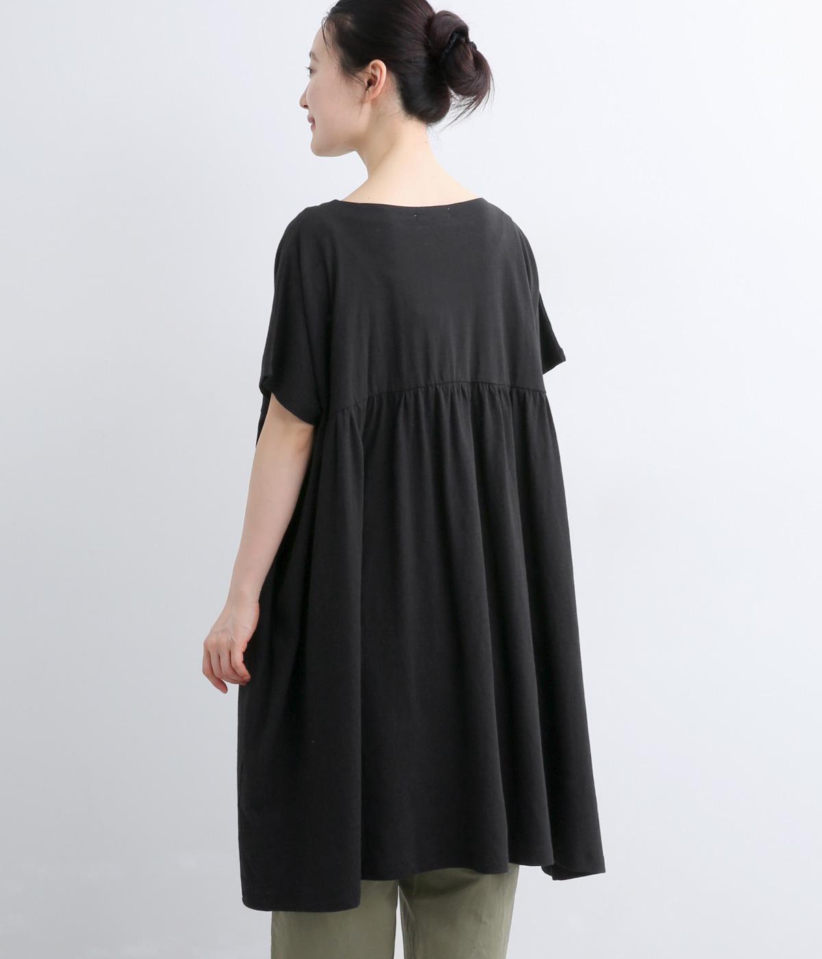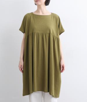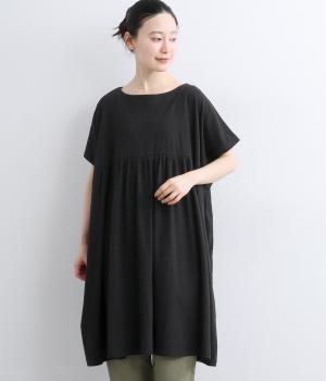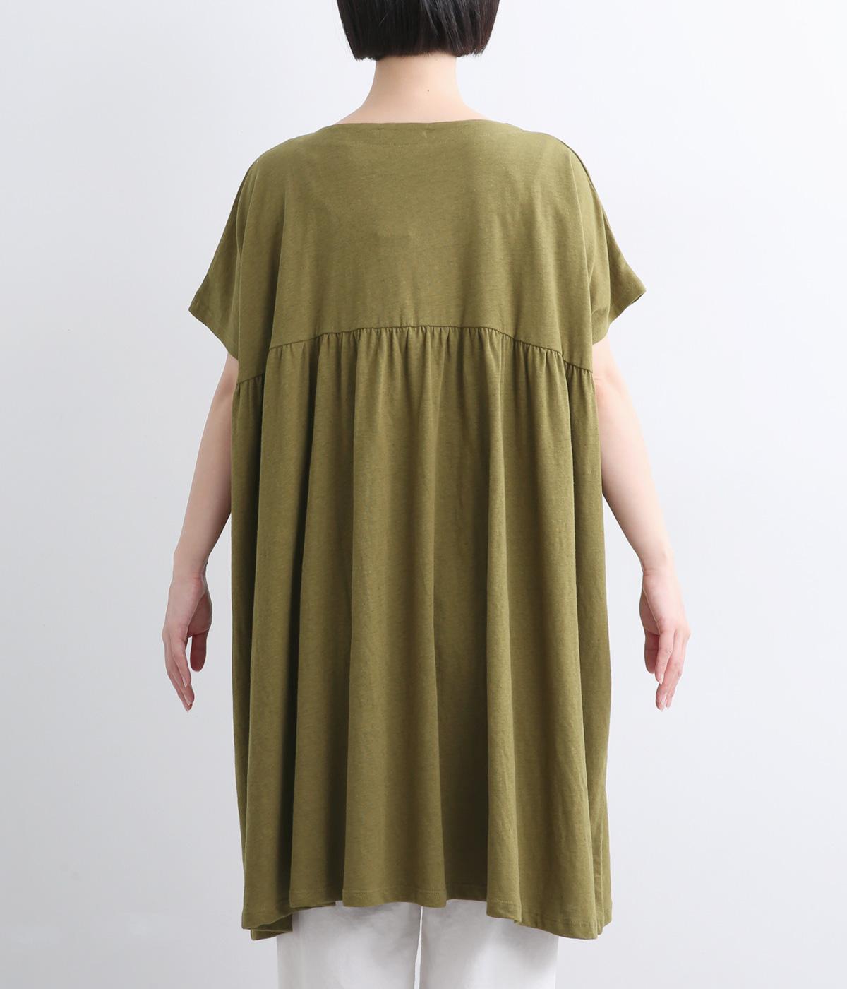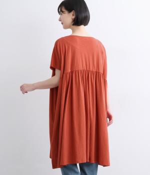 身幅をたっぷり取ったワイドなボックス型シルエットが独特のドレープ感を生む一枚。ギャザーをたっぷり寄せているので無地ながらも表情豊かで、シンプルなボトム合わせもきまります。体のラインを拾いにくくリラックスしたい日にも最適。