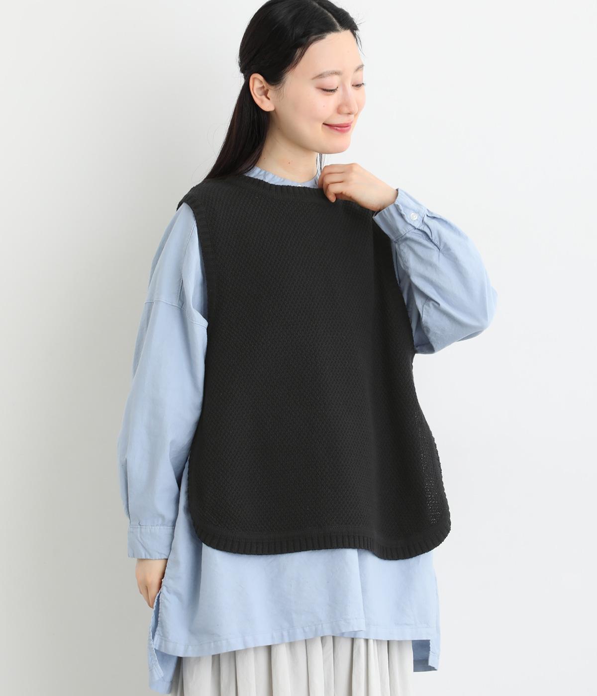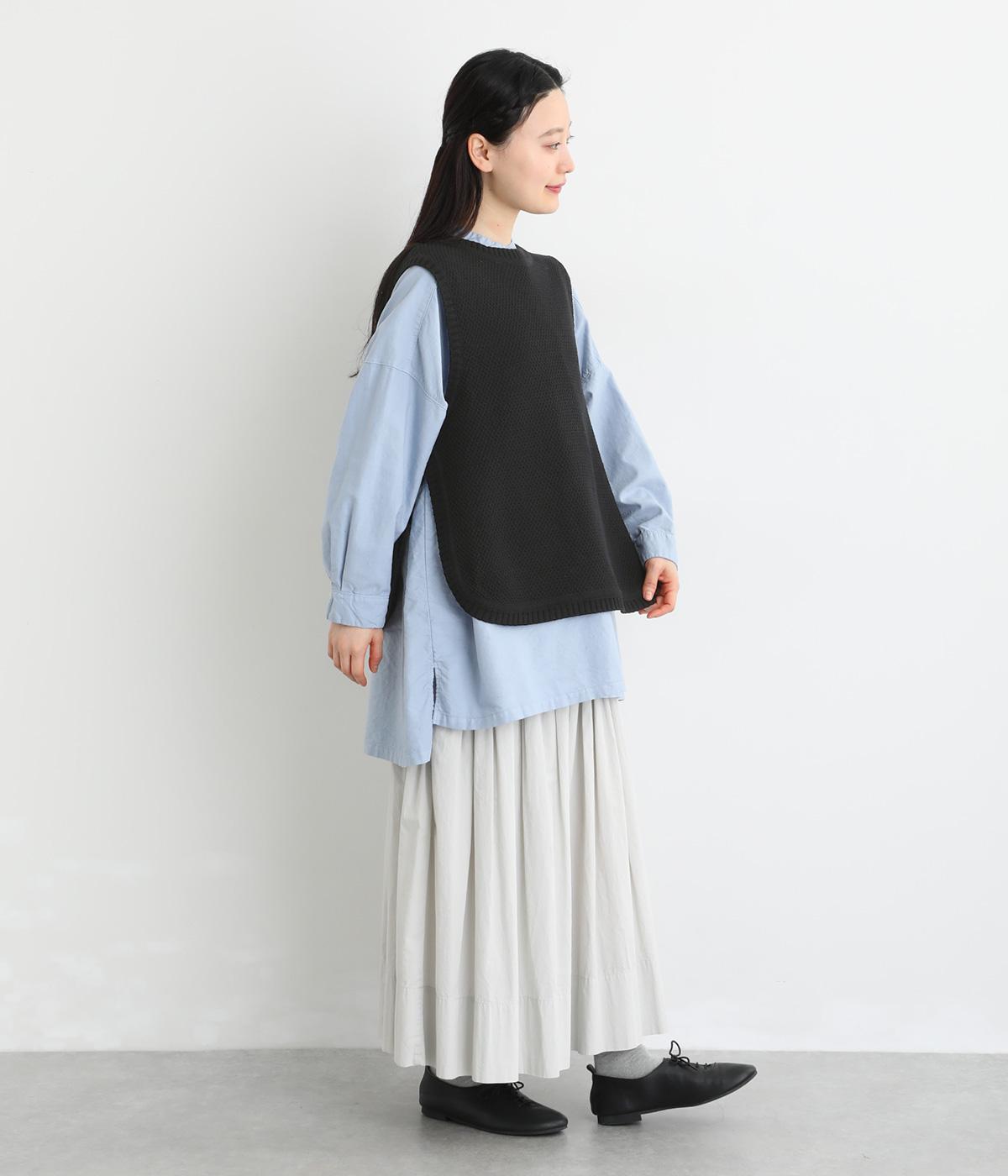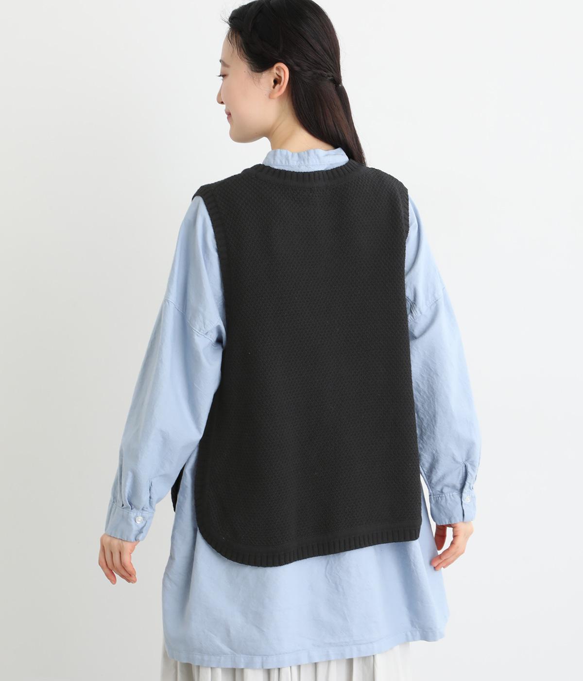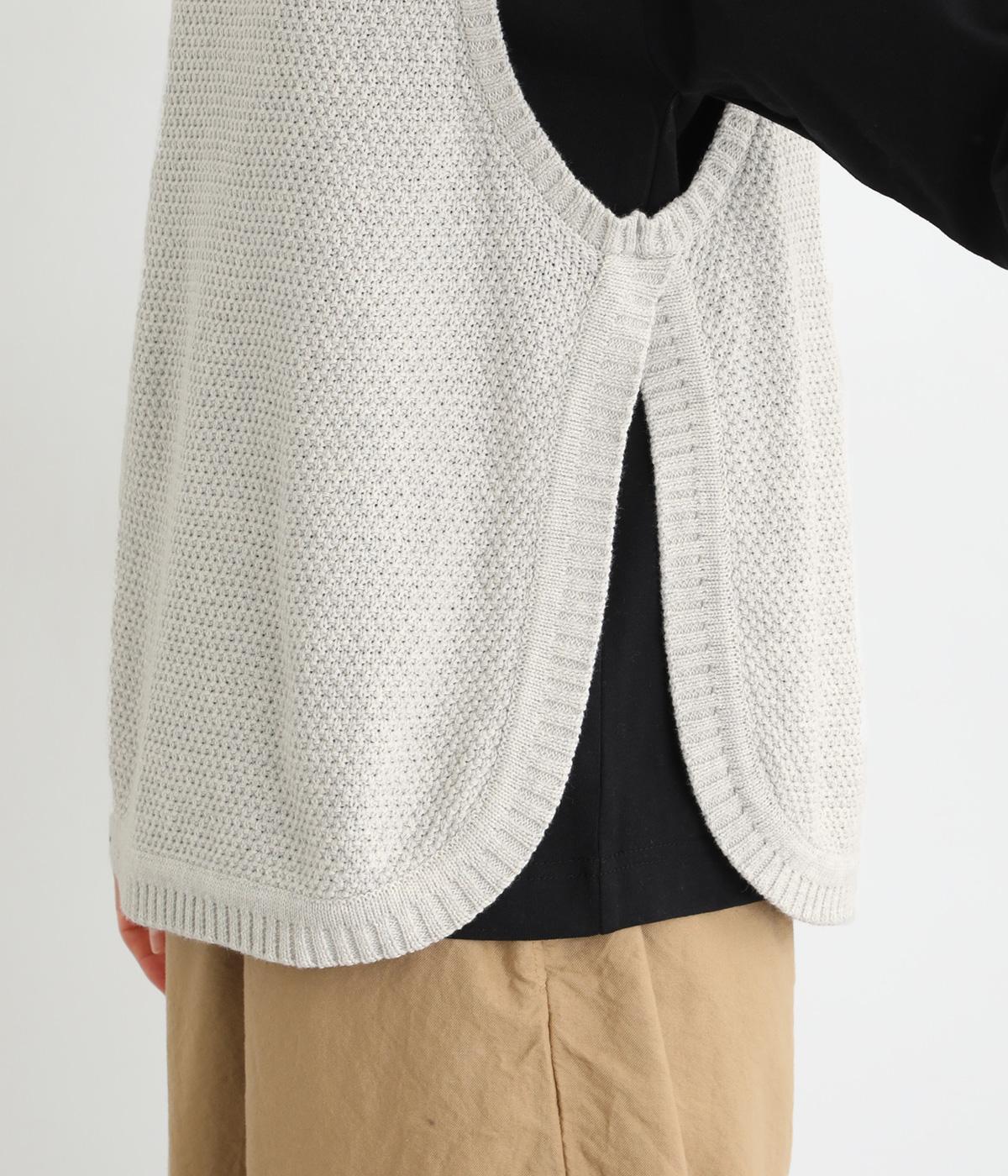 ゆったりとしたシルエットに、広めのアームホールを合わせたベストです。サイドには大きくスリットを入れ、動きのある軽やかな印象に仕上げました。前後差のあるラウンドヘムが抜け感を生み、ワンピースやブラウスとのレイヤードコーディネートもすっきりまとまります。