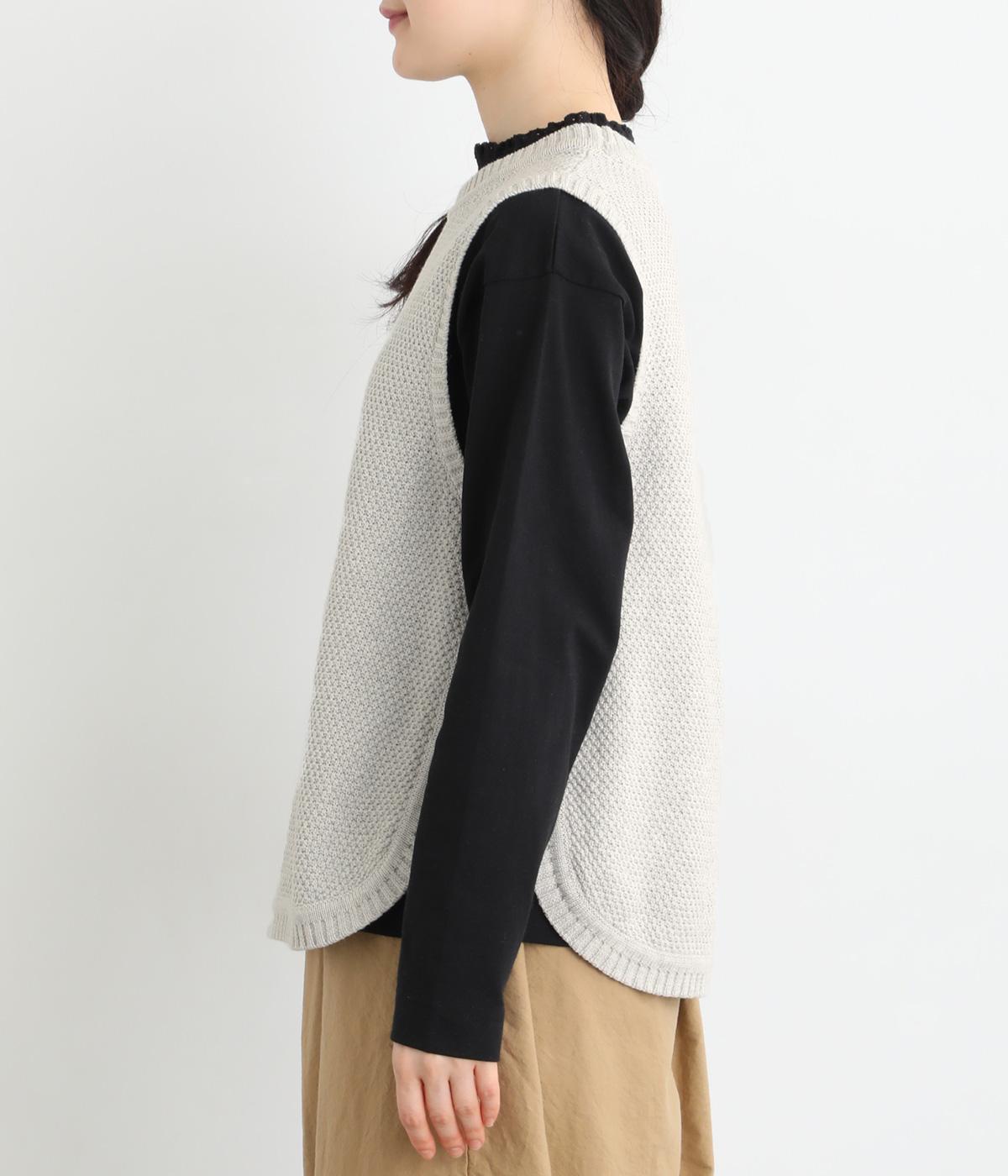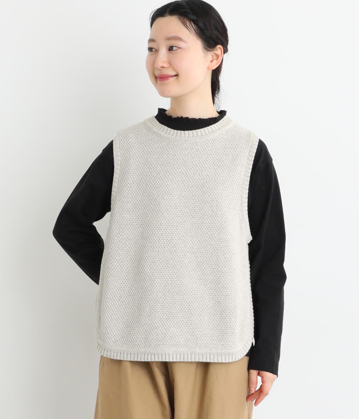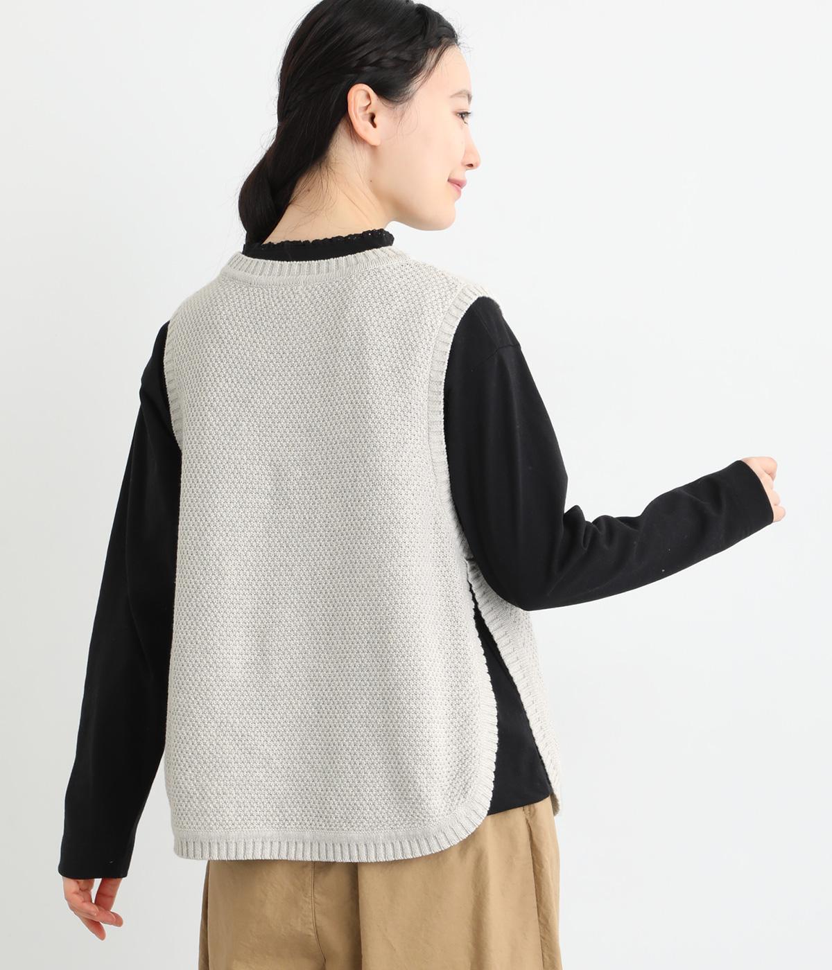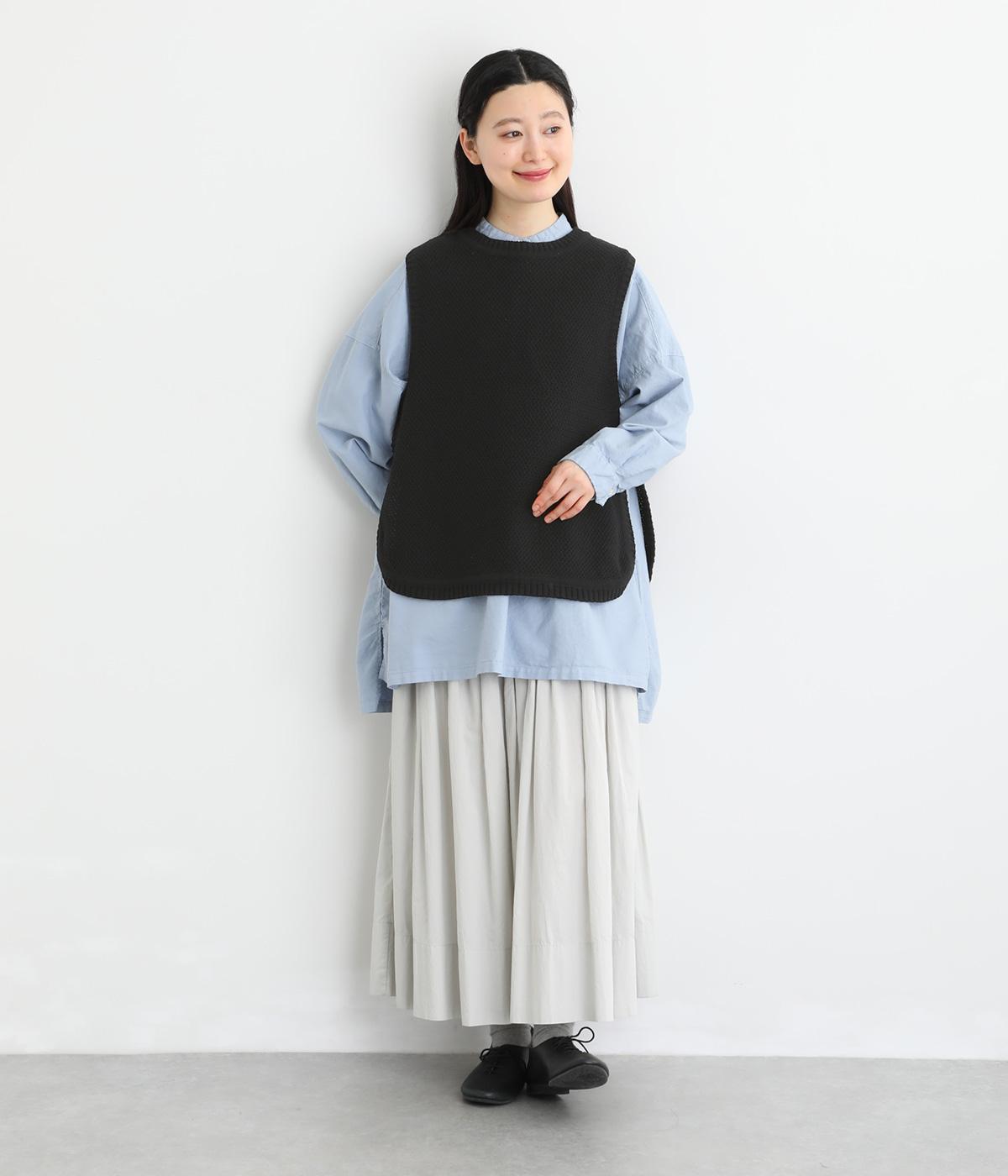 ゆったりとしたシルエットに、広めのアームホールを合わせたベストです。サイドには大きくスリットを入れ、動きのある軽やかな印象に仕上げました。前後差のあるラウンドヘムが抜け感を生み、ワンピースやブラウスとのレイヤードコーディネートもすっきりまとまります。