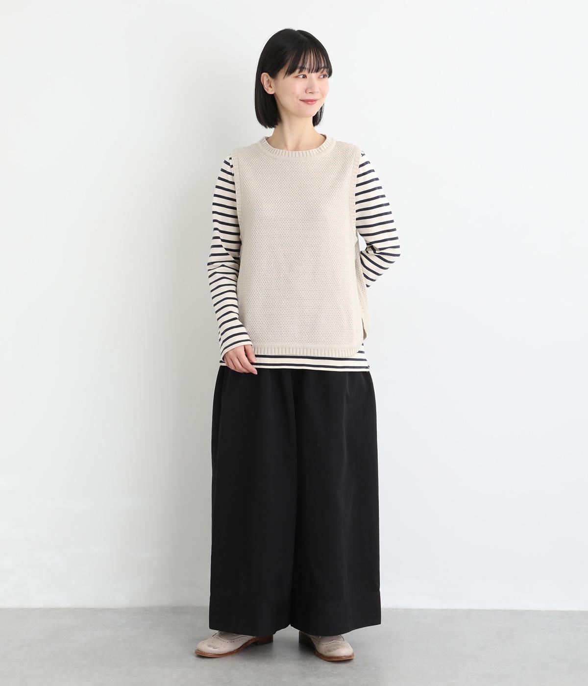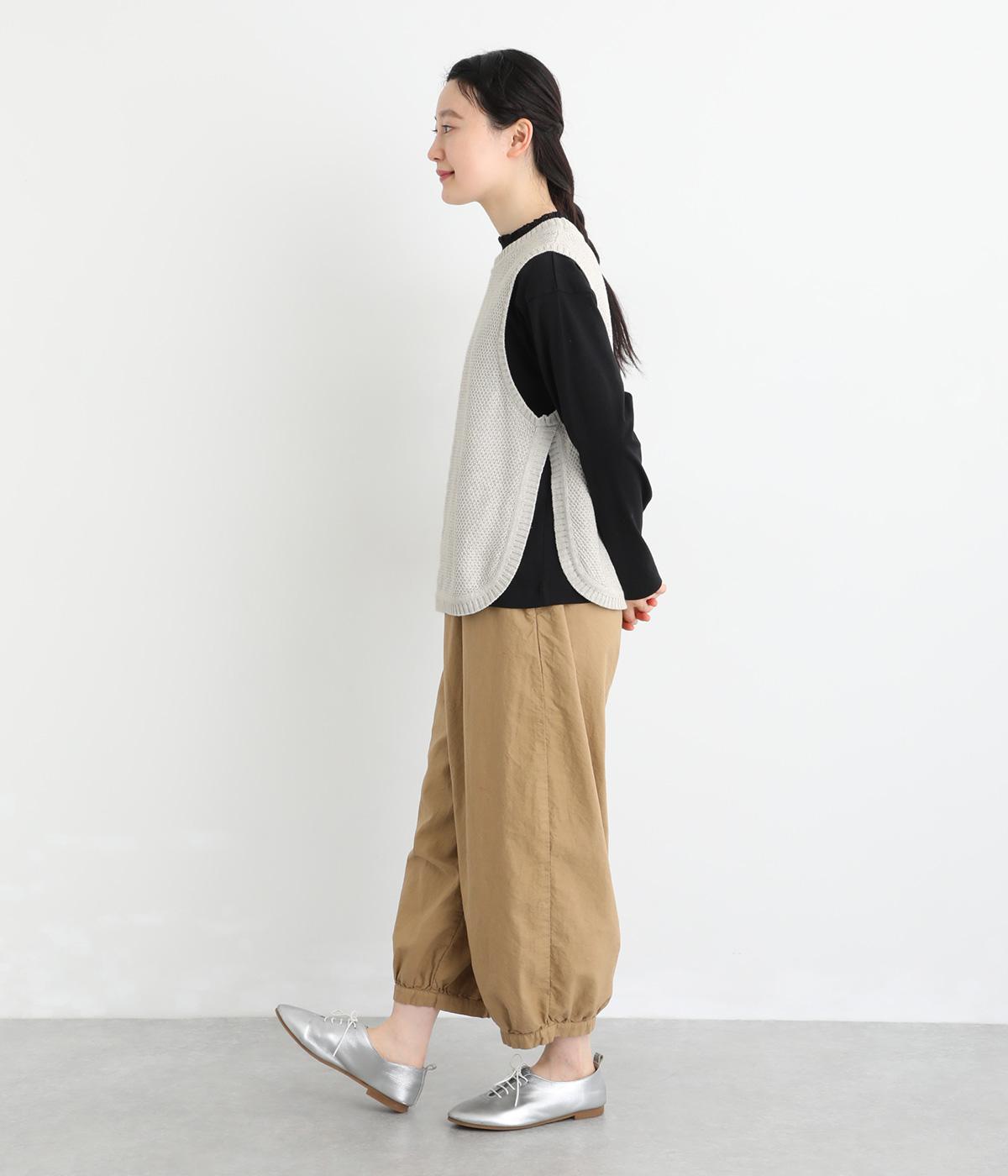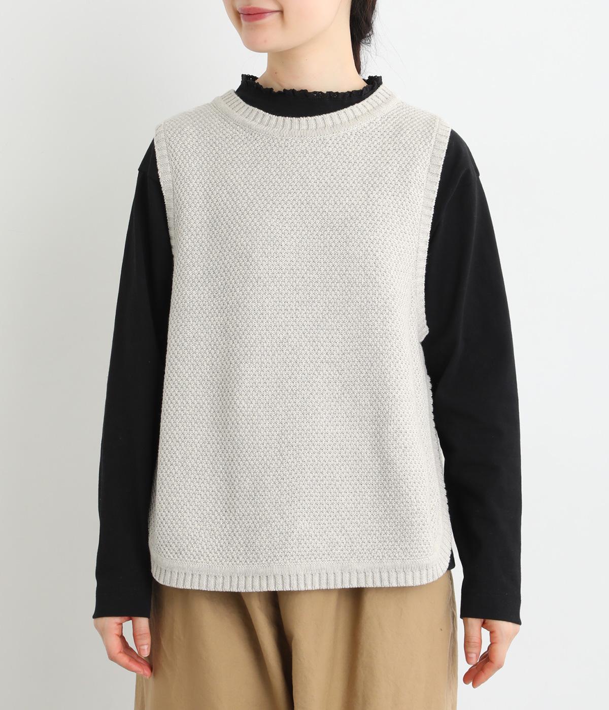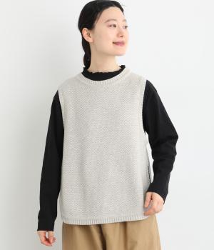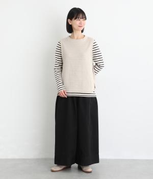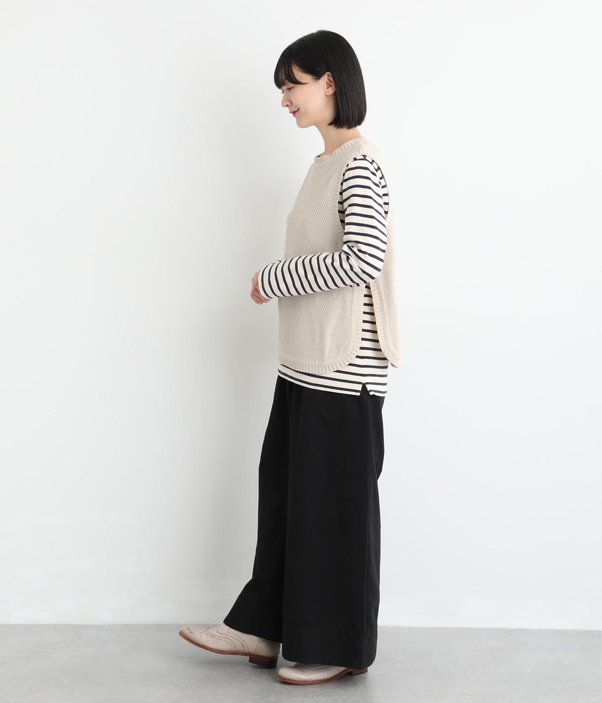 ゆったりとしたシルエットに、広めのアームホールを合わせたベストです。サイドには大きくスリットを入れ、動きのある軽やかな印象に仕上げました。前後差のあるラウンドヘムが抜け感を生み、ワンピースやブラウスとのレイヤードコーディネートもすっきりまとまります。