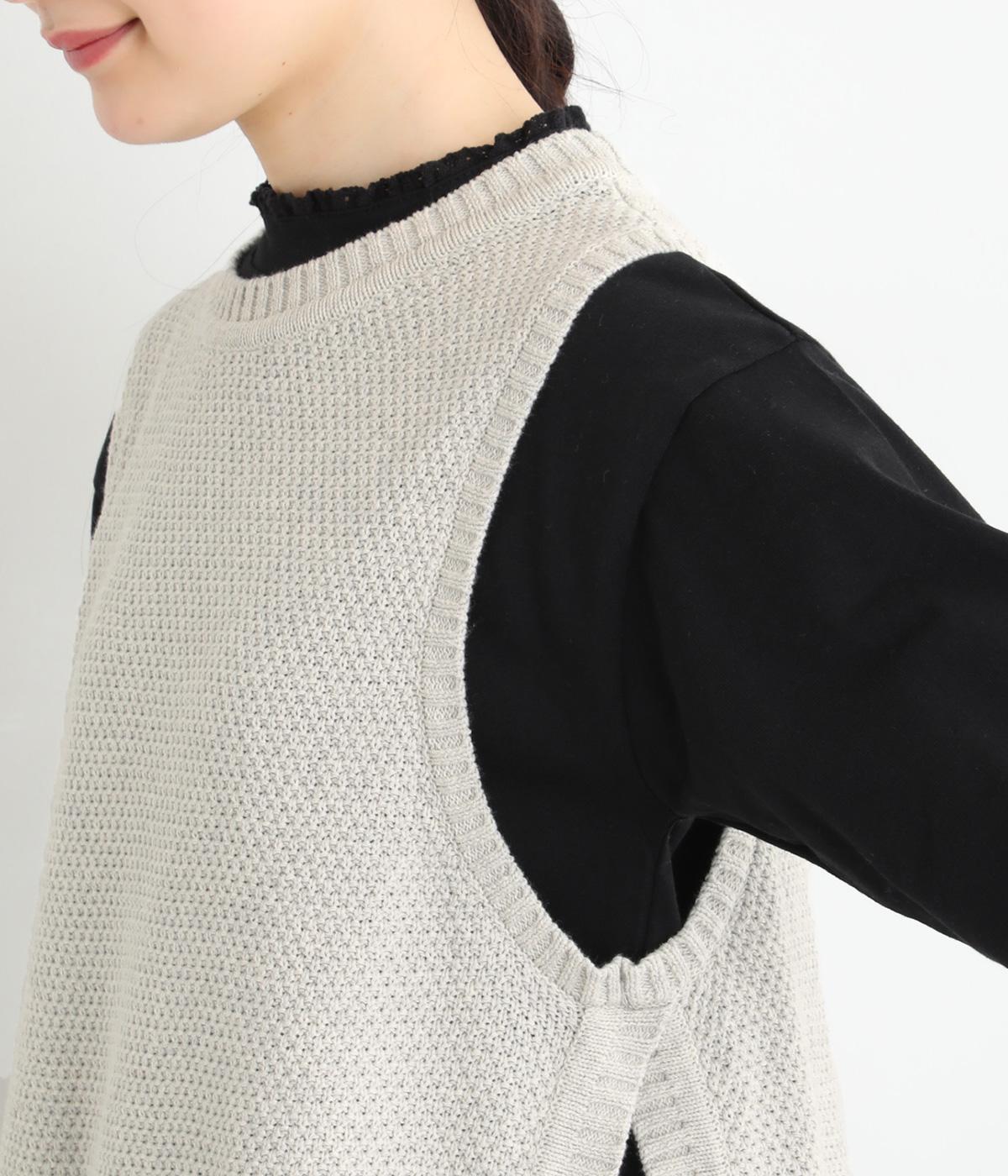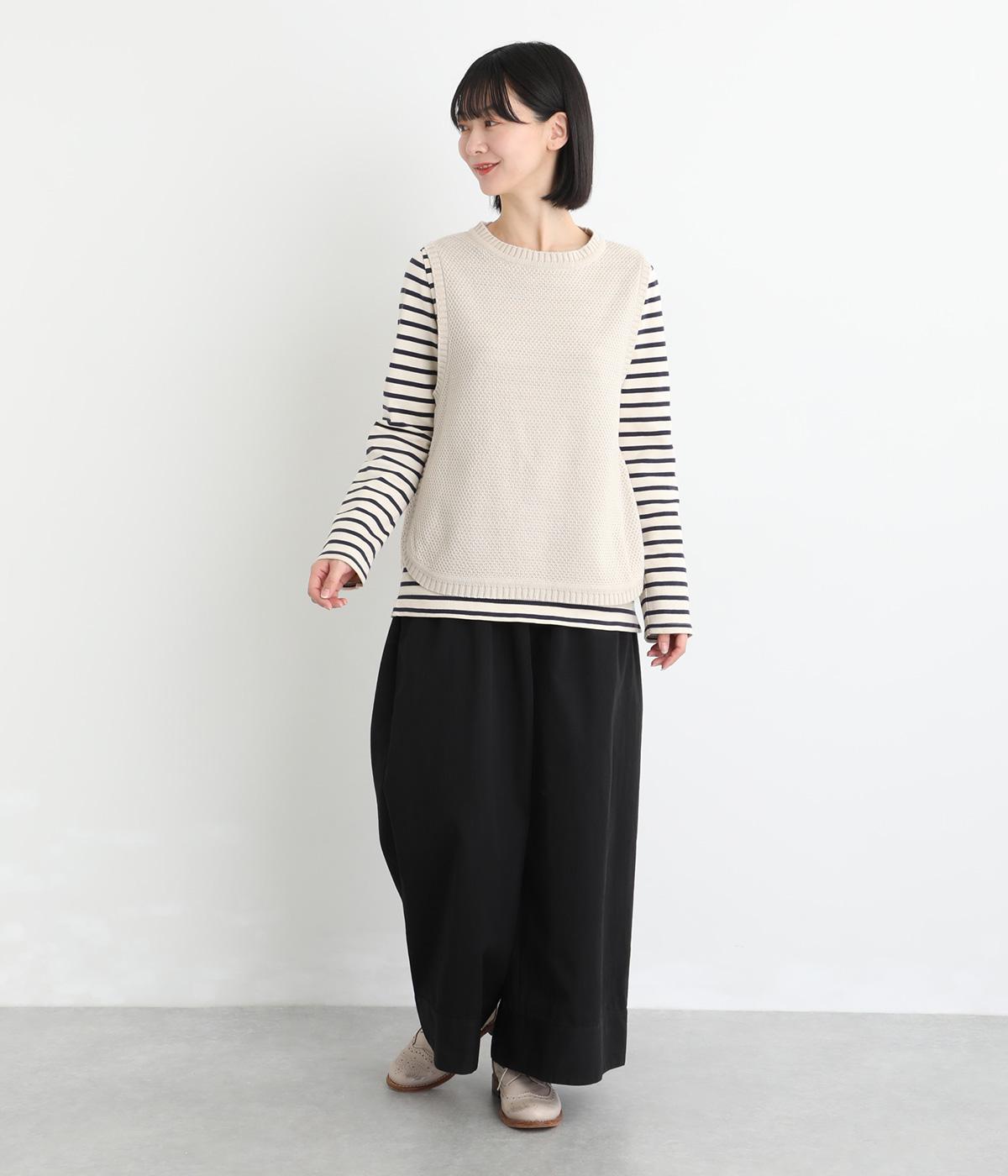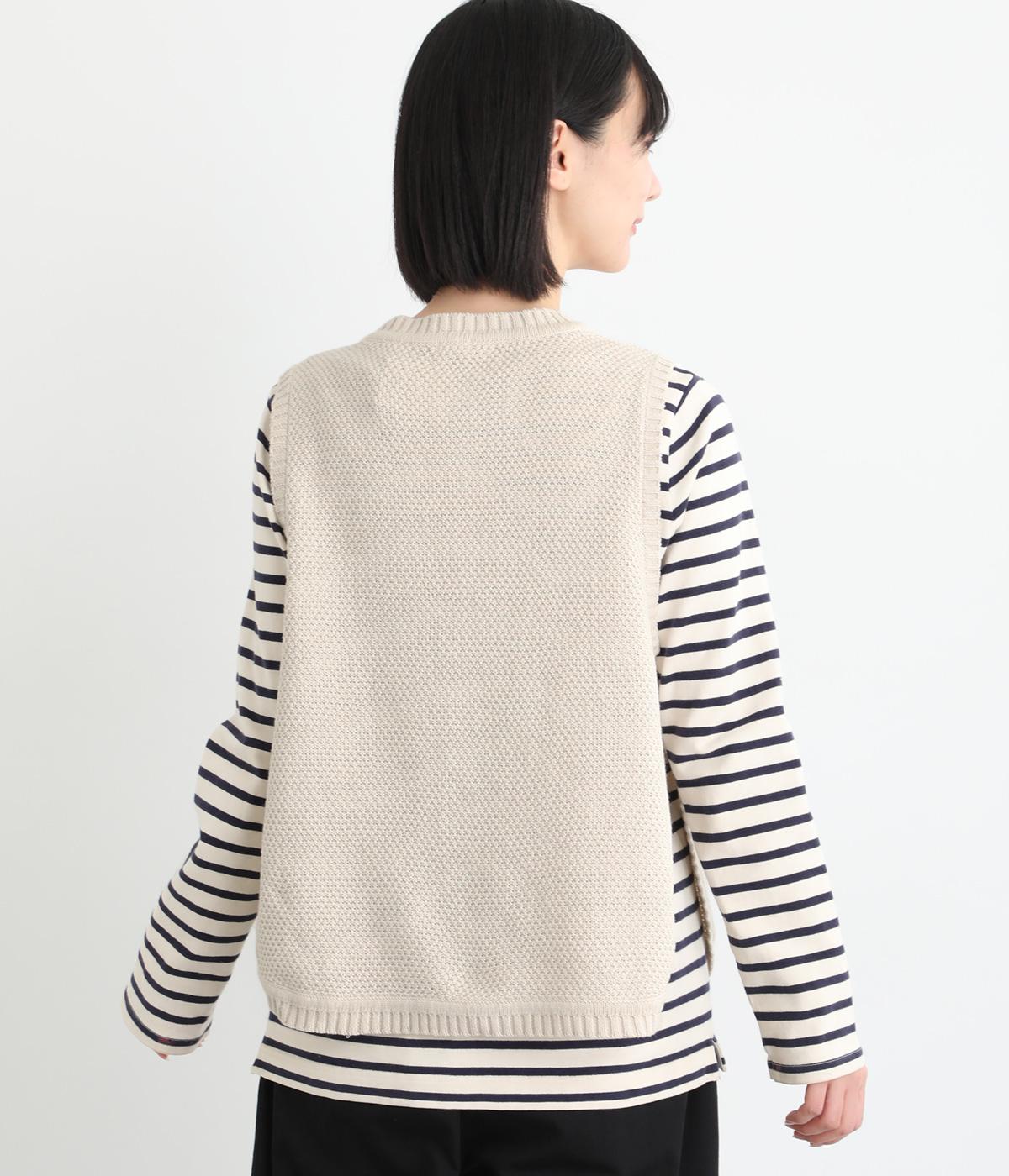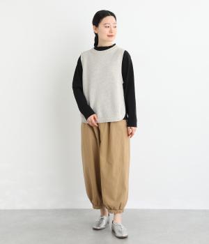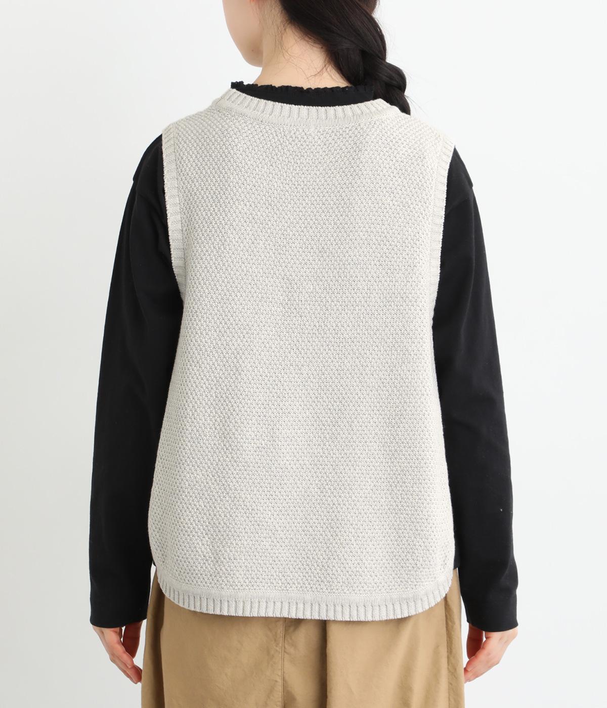ゆったりとしたシルエットに、広めのアームホールを合わせたベストです。サイドには大きくスリットを入れ、動きのある軽やかな印象に仕上げました。前後差のあるラウンドヘムが抜け感を生み、ワンピースやブラウスとのレイヤードコーディネートもすっきりまとまります。