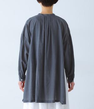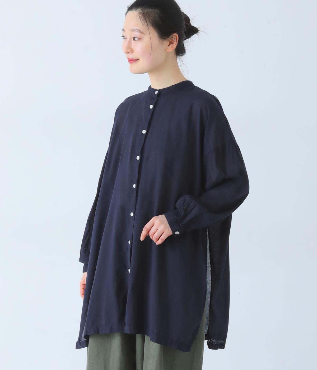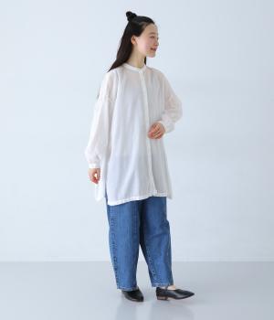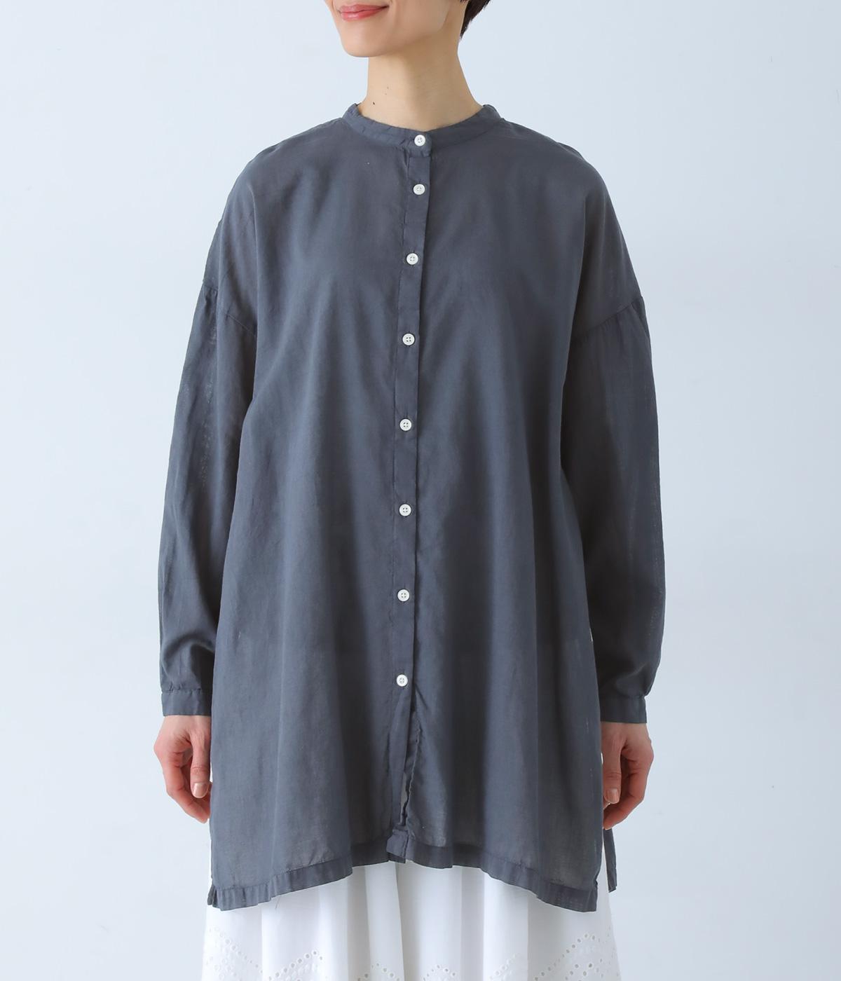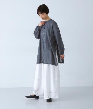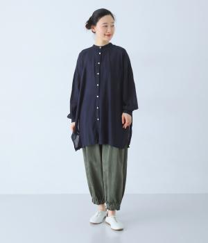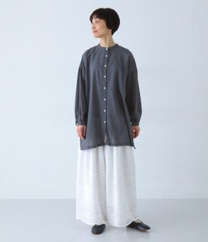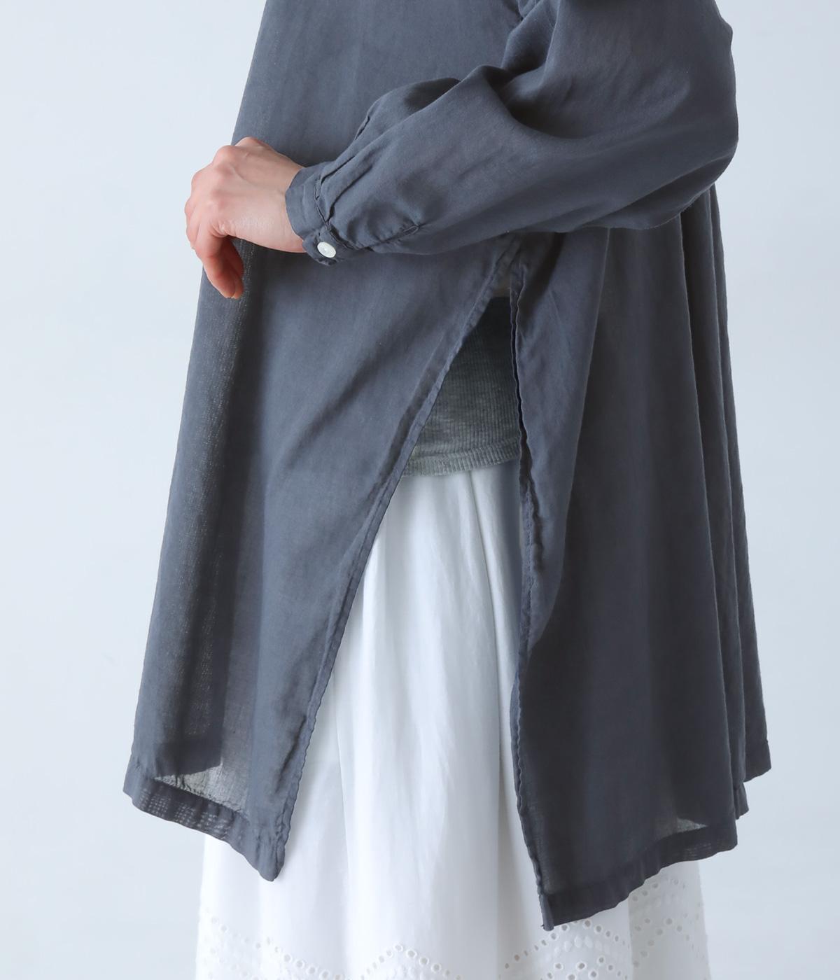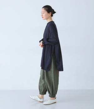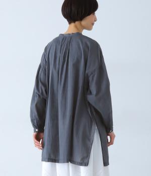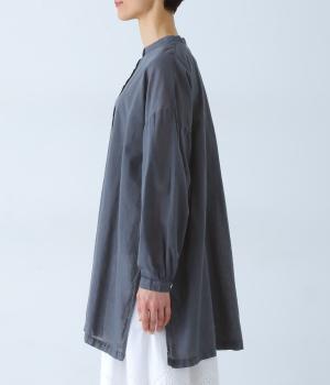 すっきりとしたスタンドネックのチュニックをベースに、サイドに大きくスリットを入れて、軽やかな動きを添えた一枚。インナーやボトムスをちらりとのぞかせた、抜け感のあるレイヤードをたのしめます。ゆとりのあるシルエットと、腰まわりをカバーする丈感で、リラックスした着心地なのもうれしいポイント。