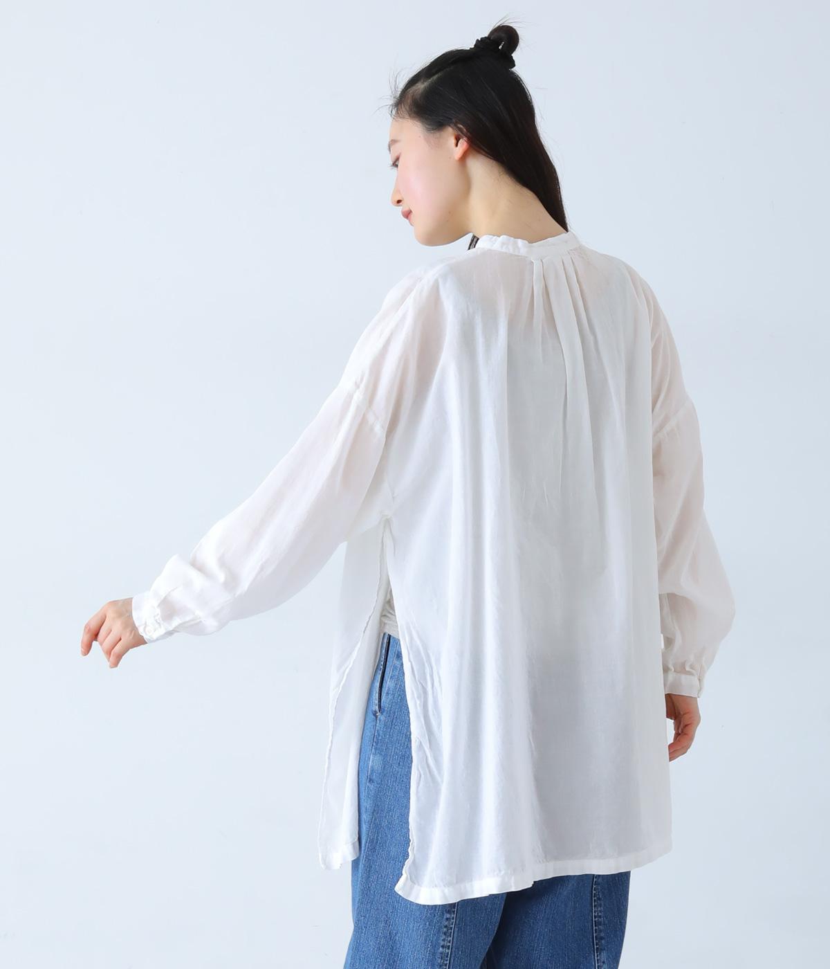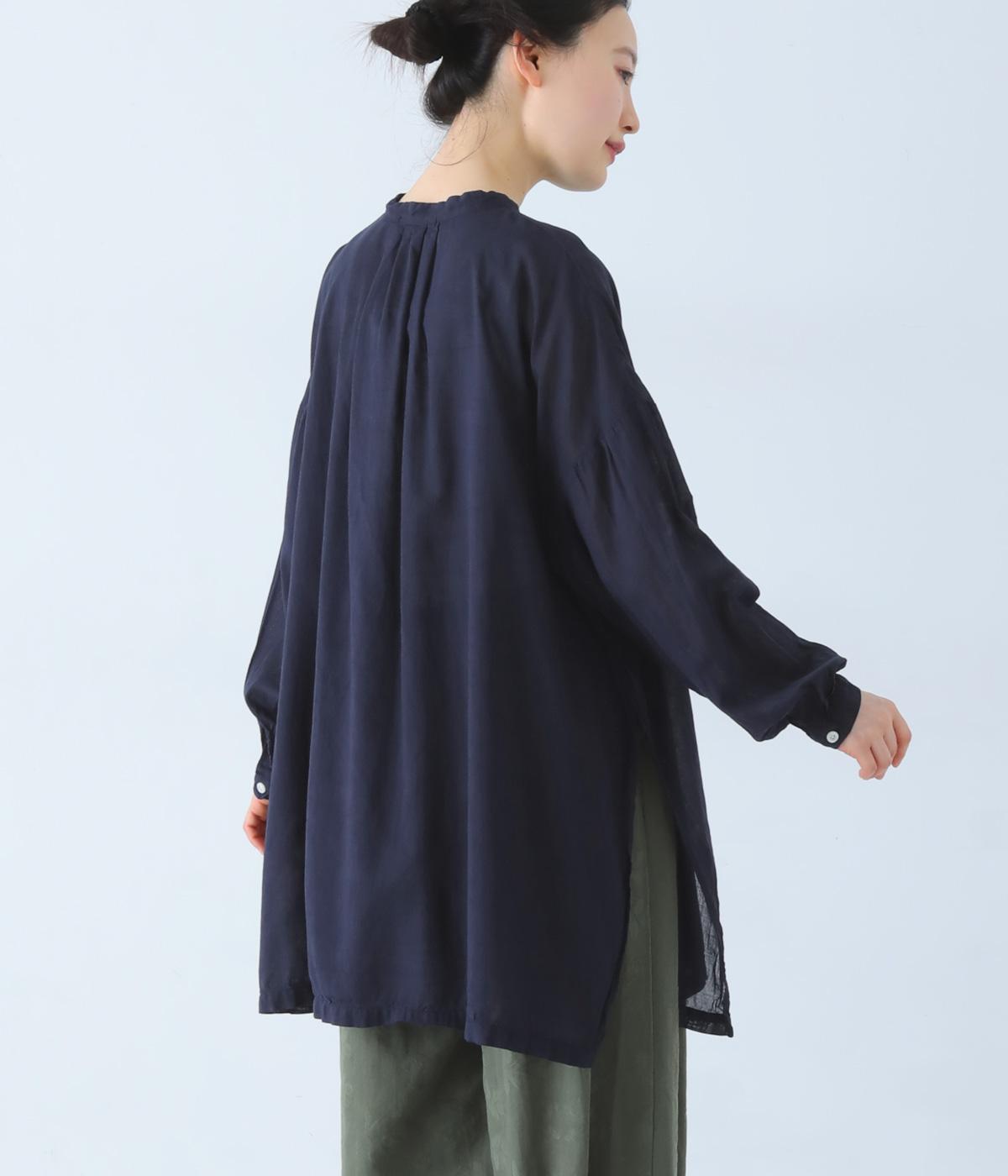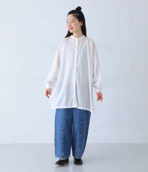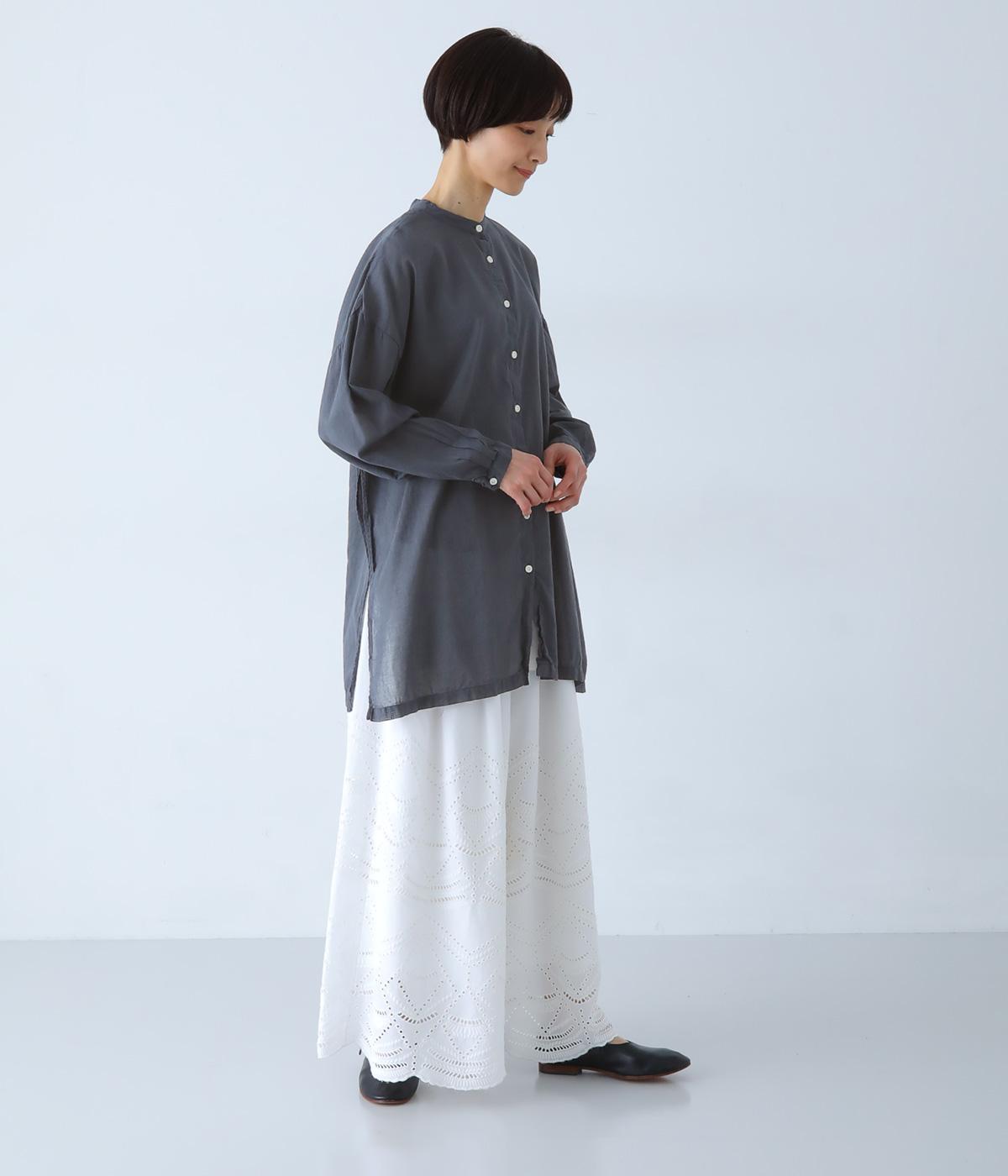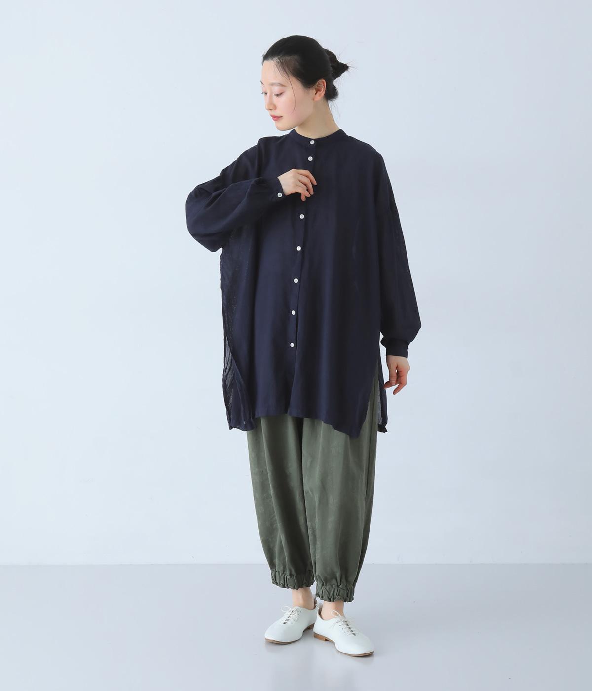 すっきりとしたスタンドネックのチュニックをベースに、サイドに大きくスリットを入れて、軽やかな動きを添えた一枚。インナーやボトムスをちらりとのぞかせた、抜け感のあるレイヤードをたのしめます。ゆとりのあるシルエットと、腰まわりをカバーする丈感で、リラックスした着心地なのもうれしいポイント。