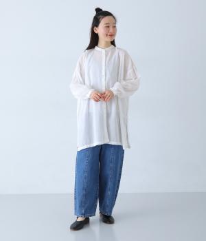 日本で製品染めを施した、薄手のコットン生地。洗いざらしのような自然な風合いと、さらりとしたやさしい肌ざわりが魅力です。ほんのりと透け感があり、装いに軽やかな印象を添えてくれます。