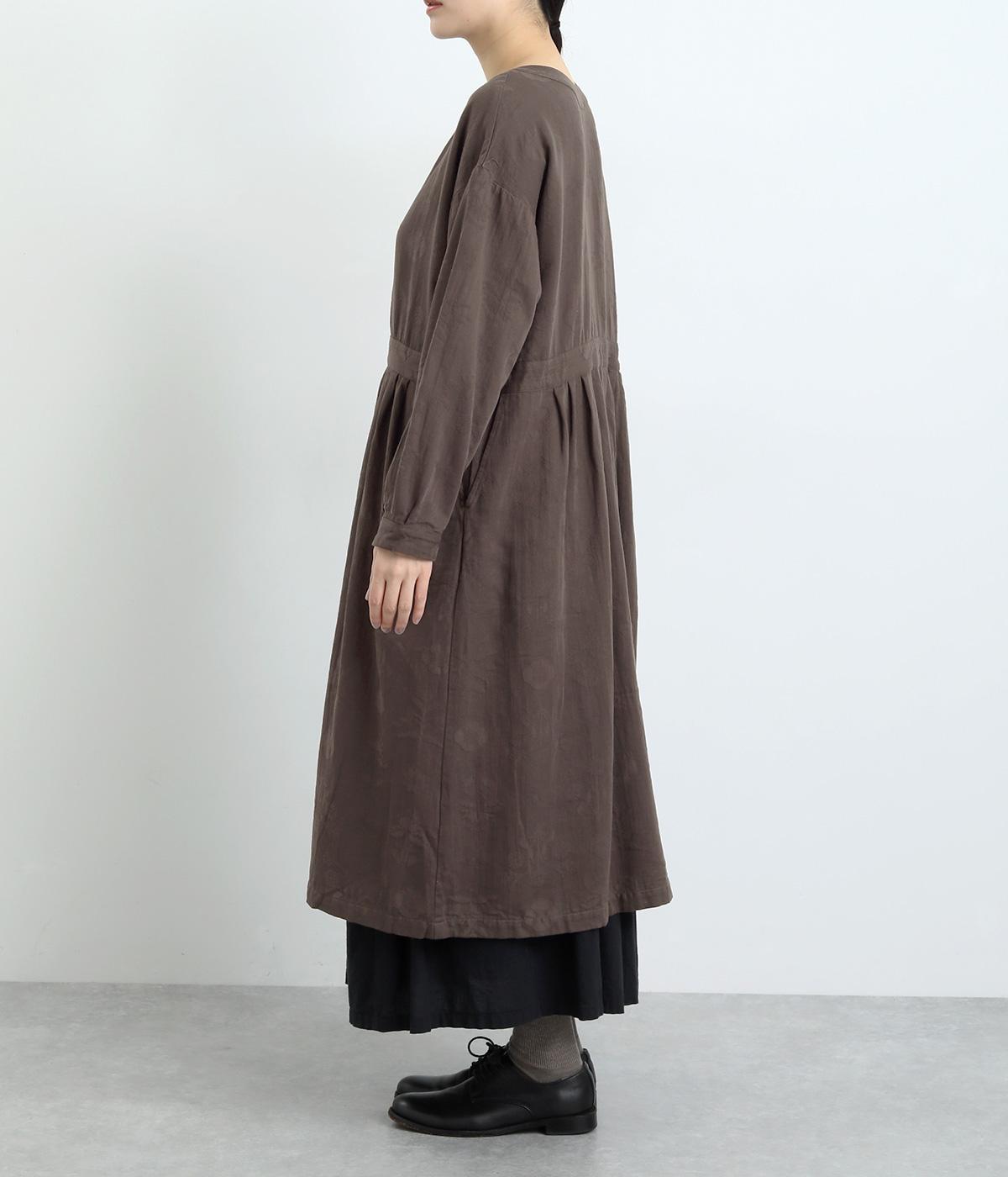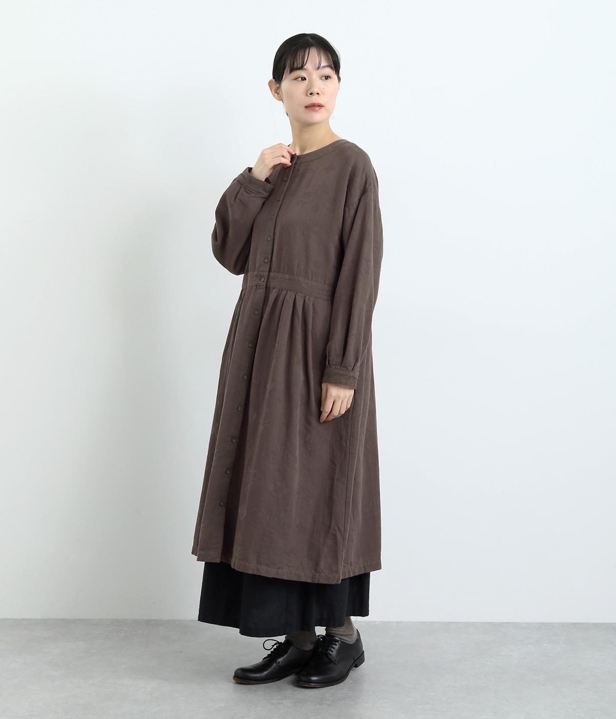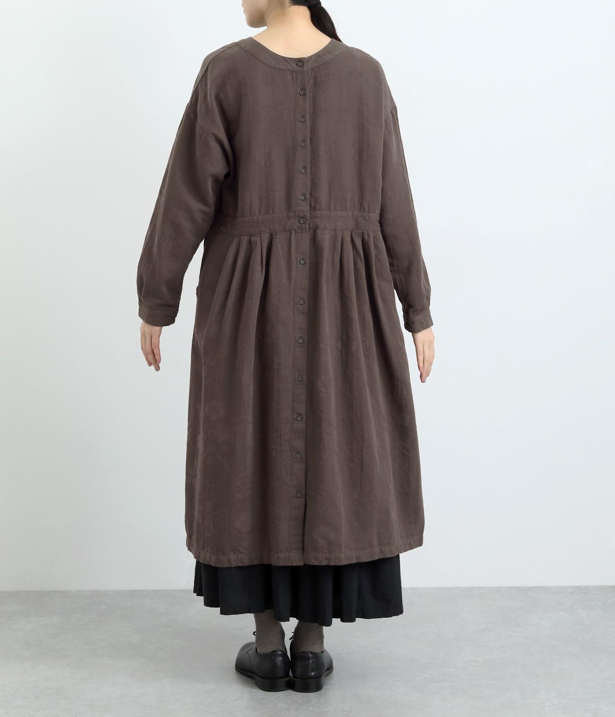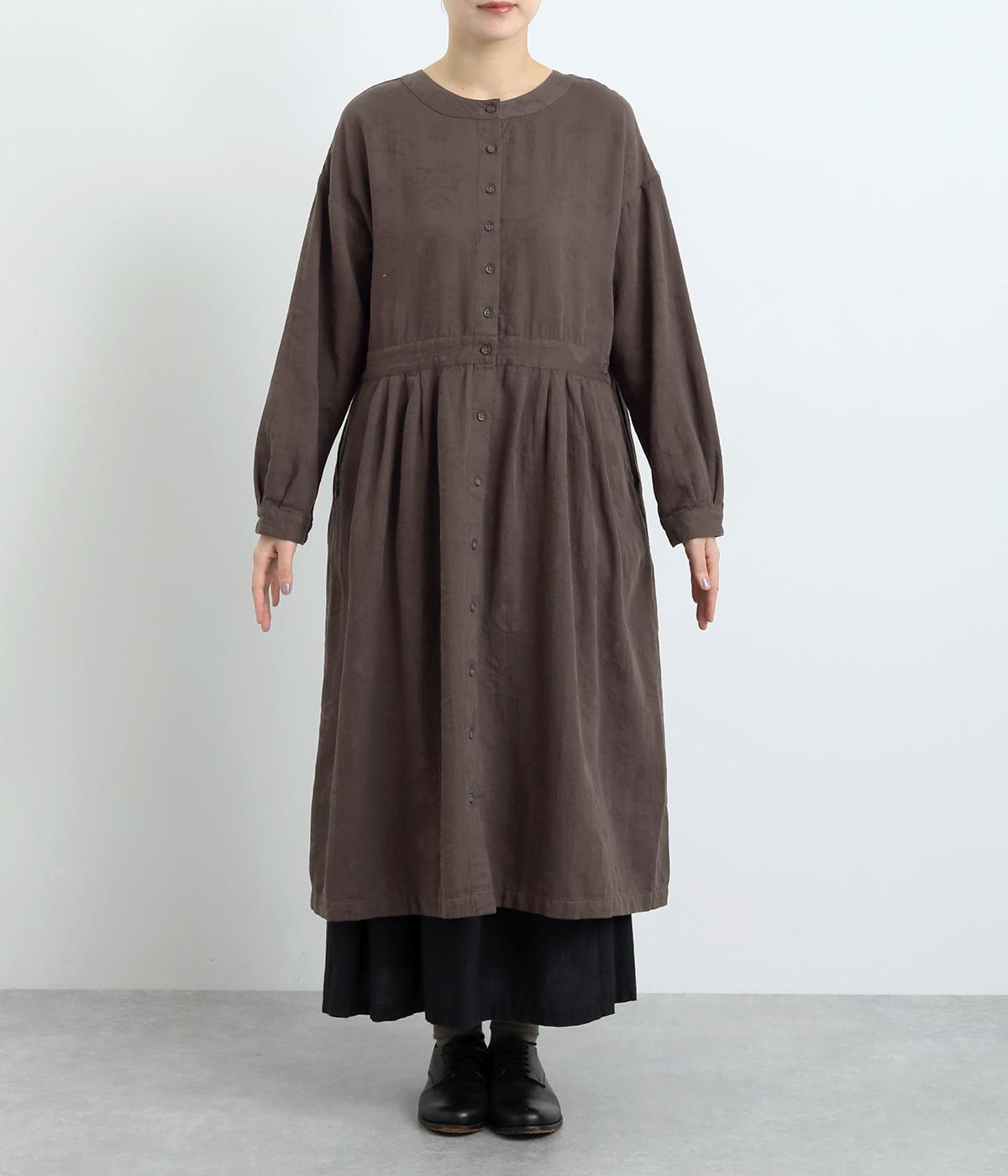 クラシカルな雰囲気を醸すジャカードワンピースは、前後どちらでもたのしめる2wayデザインにしました。ウエストラインにタックを入れてゆったりと着心地よく、前あきの羽織りスタイルもおすすめです。