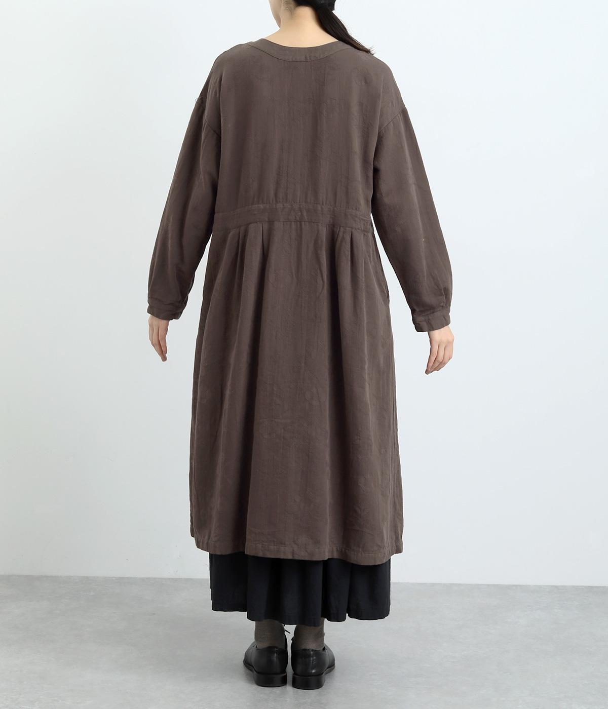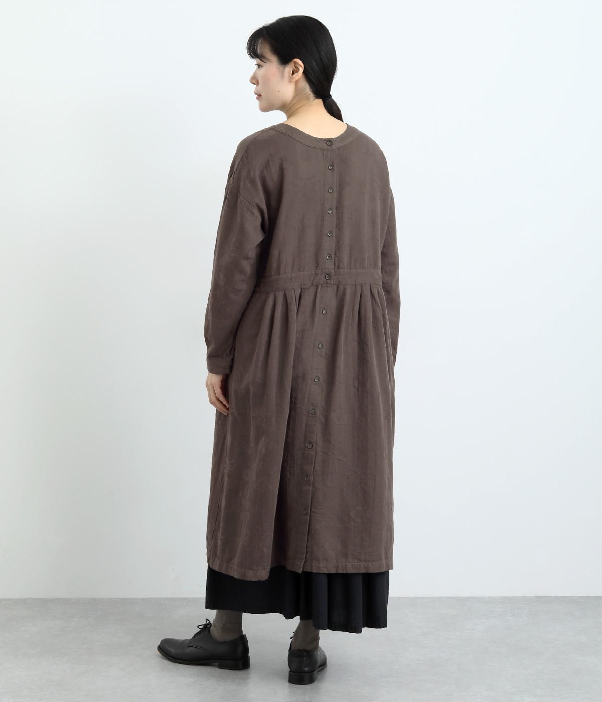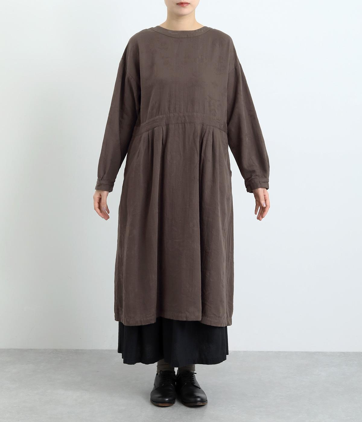 クラシカルな雰囲気を醸すジャカードワンピースは、前後どちらでもたのしめる2wayデザインにしました。ウエストラインにタックを入れてゆったりと着心地よく、前あきの羽織りスタイルもおすすめです。