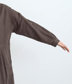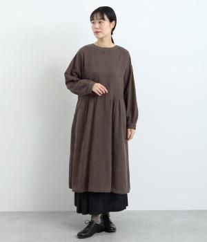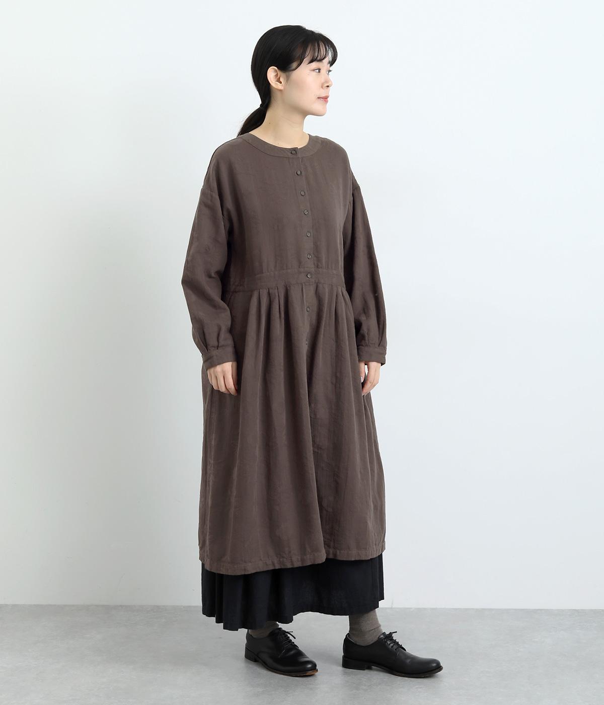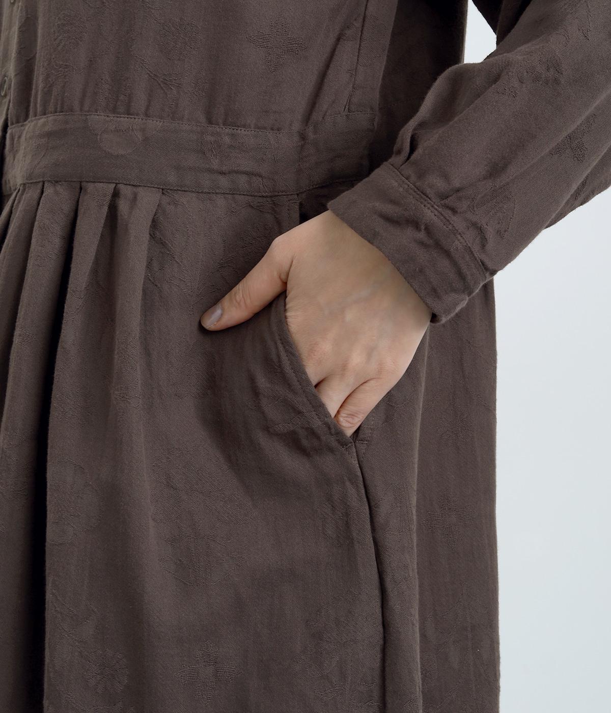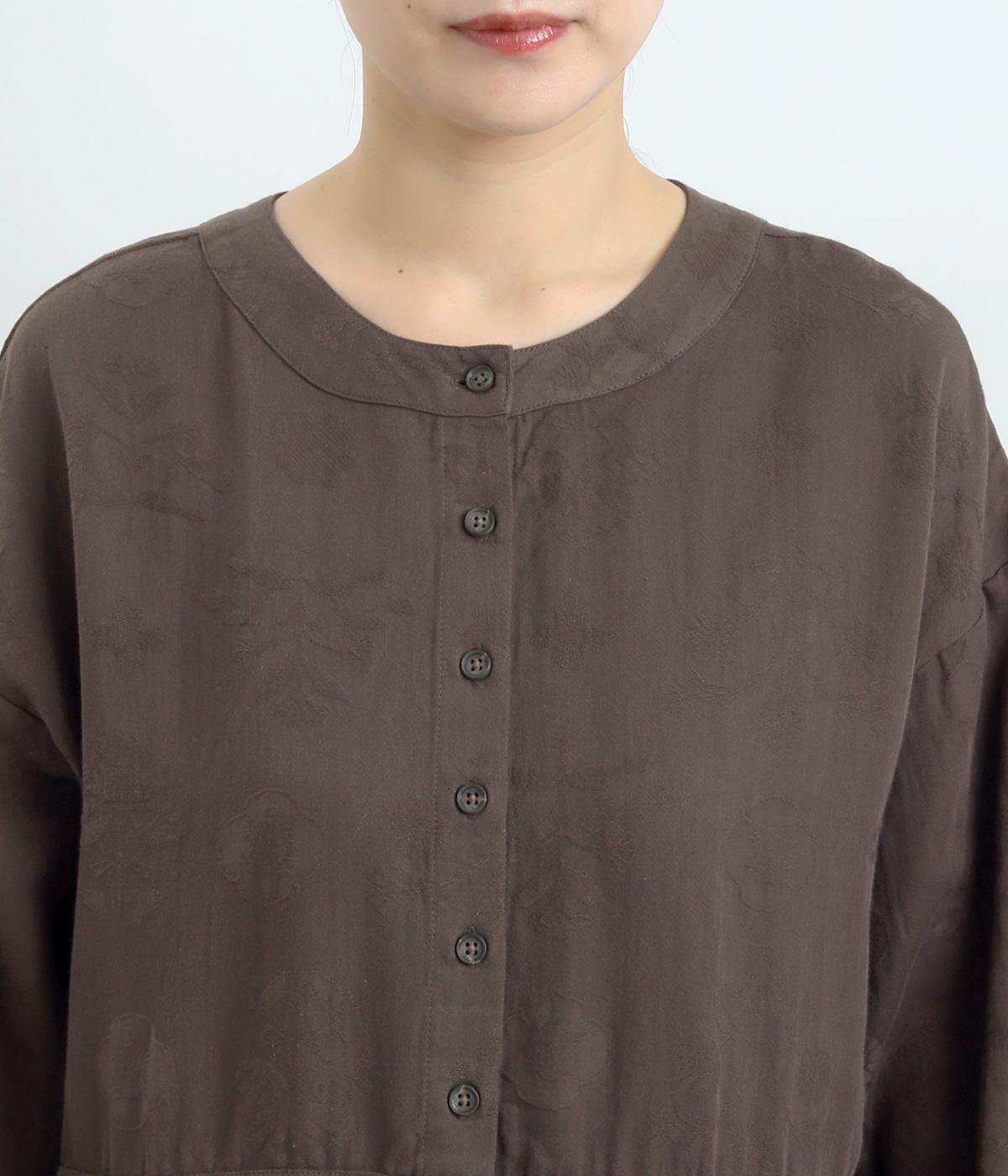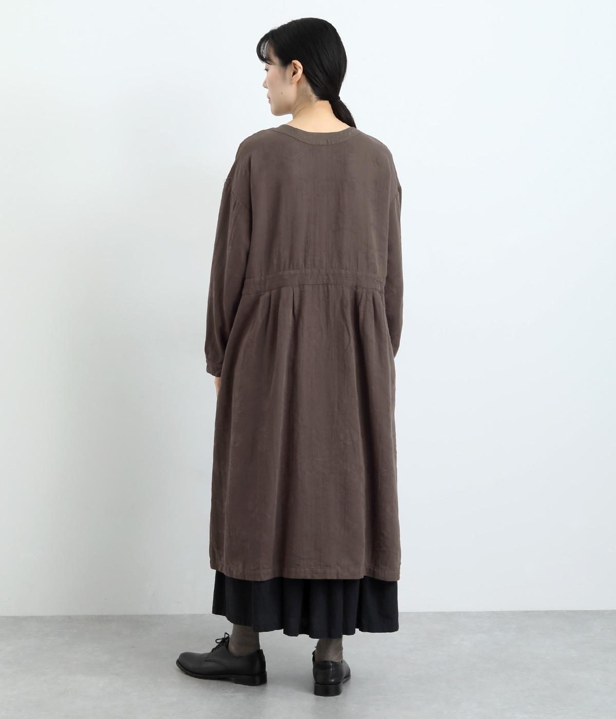 クラシカルな雰囲気を醸すジャカードワンピースは、前後どちらでもたのしめる2wayデザインにしました。ウエストラインにタックを入れてゆったりと着心地よく、前あきの羽織りスタイルもおすすめです。