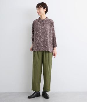 ウエストまわりにギャザーとタックをたっぷりと入れたテーパードパンツ。フロントのドレープと後ろの大きめのポケットが、気になる腰やヒップのラインをカモフラージュしてくれます。総ゴム仕様のウエストには内紐をプラスしてフィット感をアップさせました。