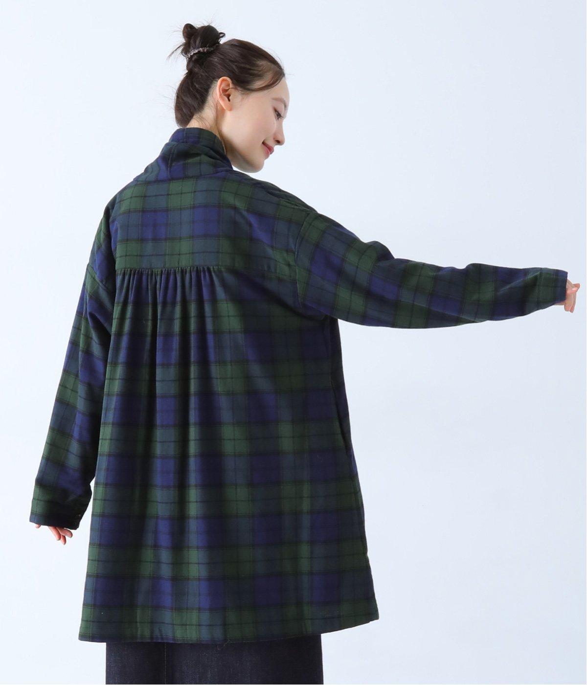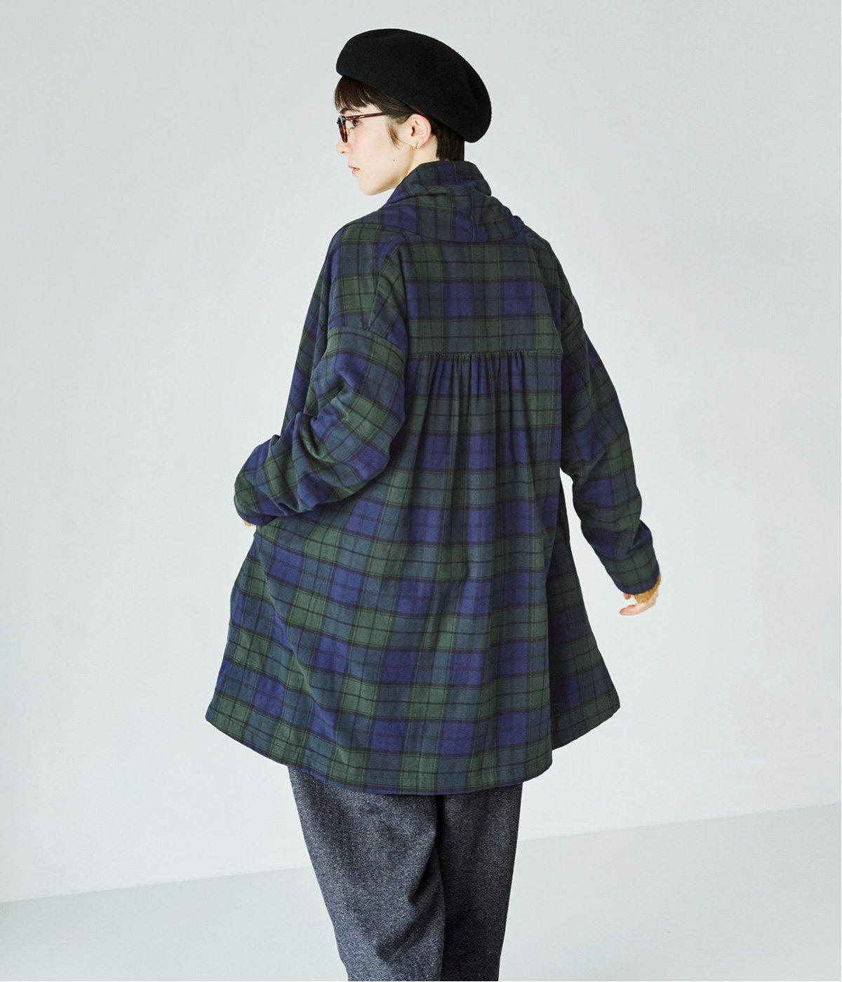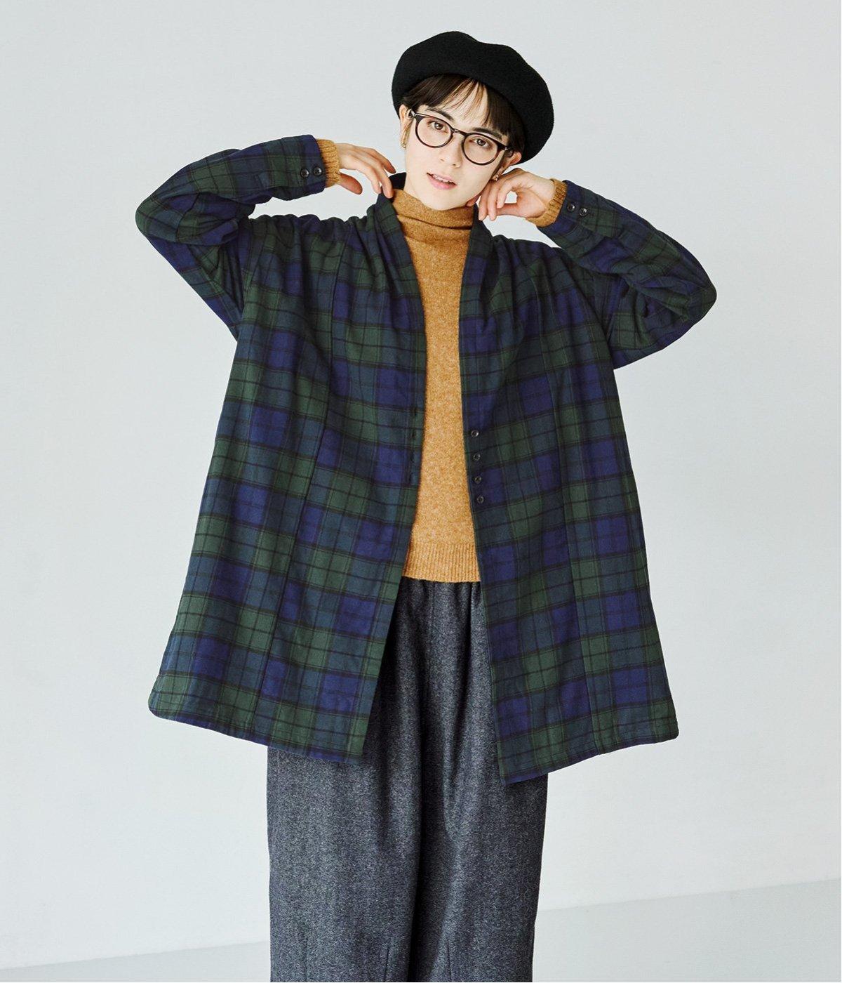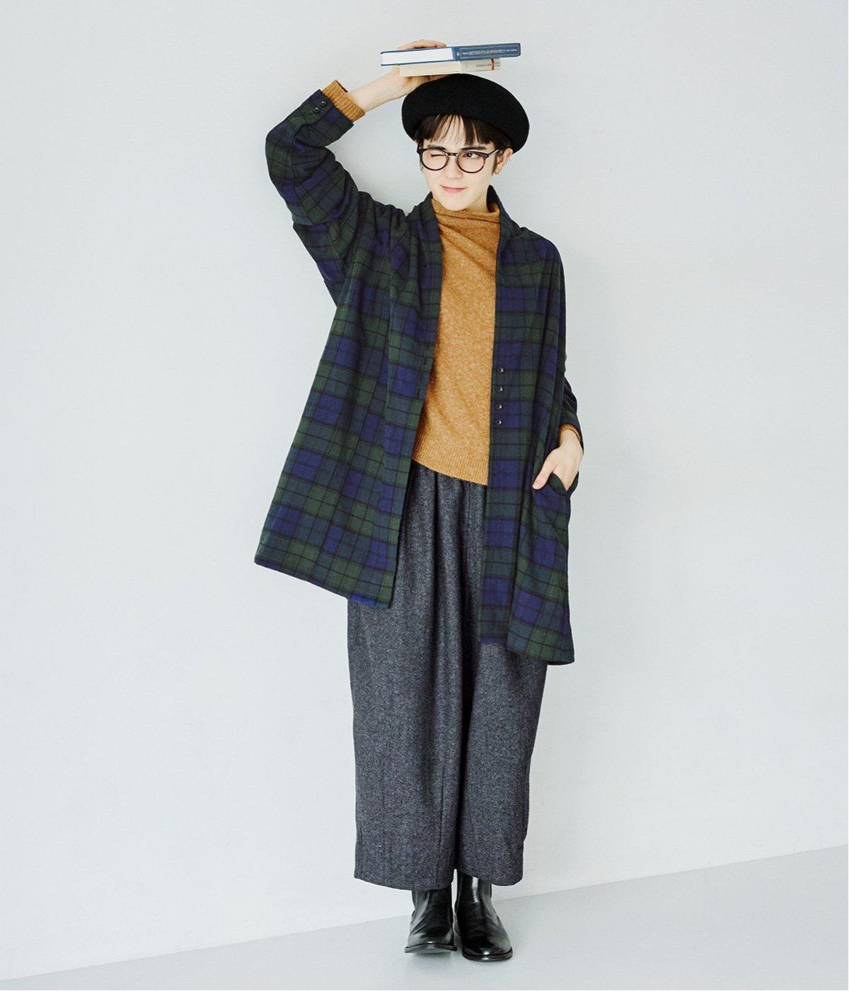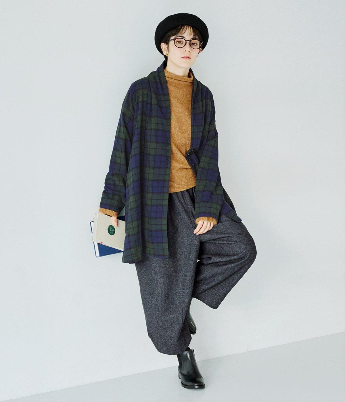ボタンを開けて、軽く羽織った<ブラックウォッチ>の装い。ワイドパンツやベレー帽でマニッシュな印象に仕上げました。