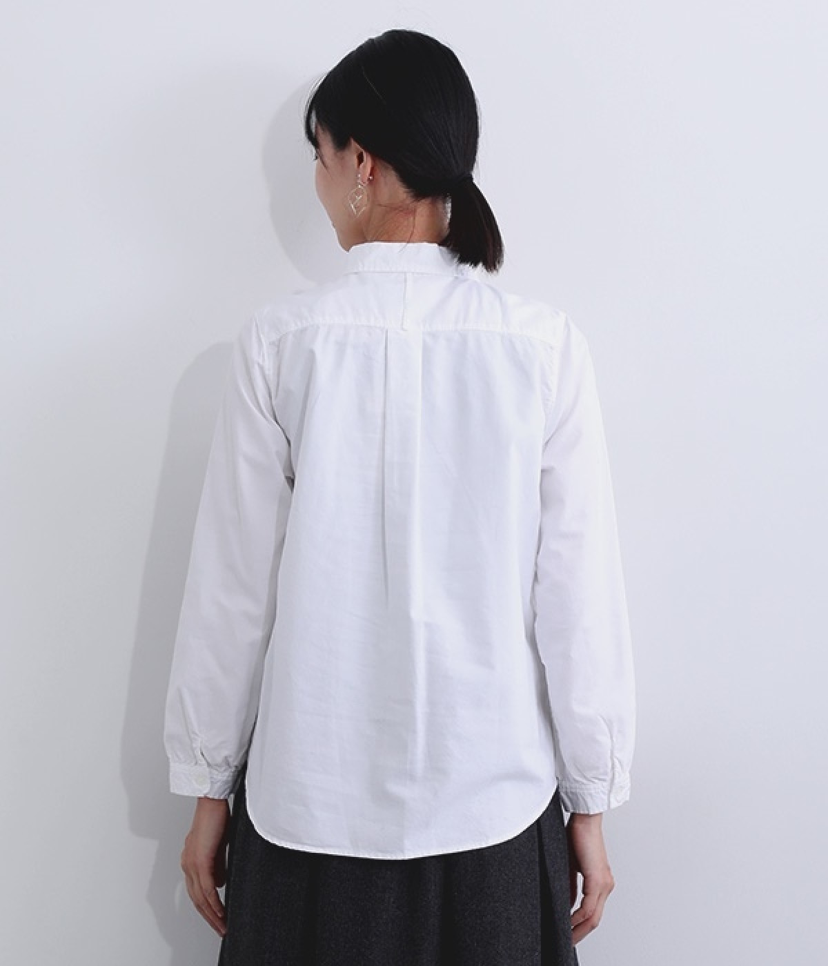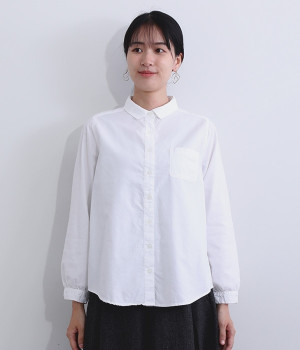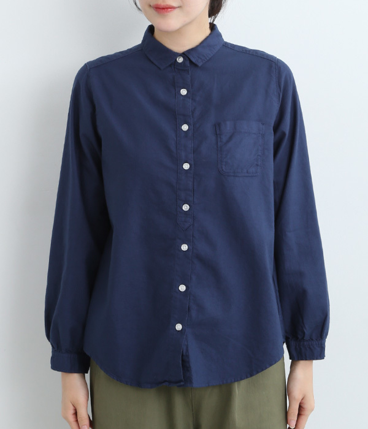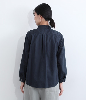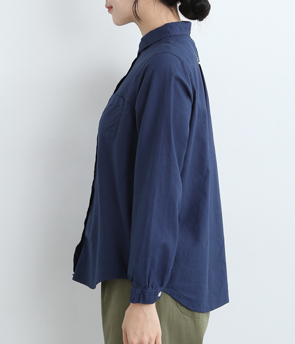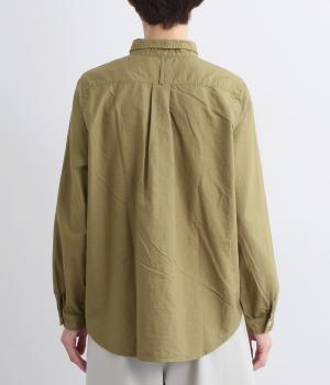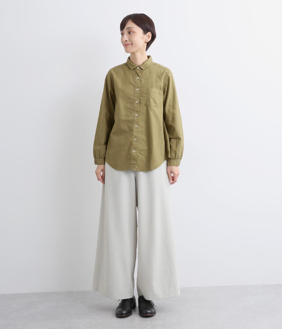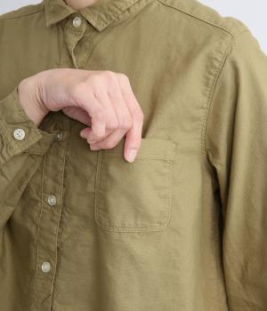 多彩なスタイリングが楽しめるシンプルな襟つきシャツです。前立てのデザインや、後ろのハンガーループなど細かな仕様がポイントに。前あきで羽織りものとしても活躍します。