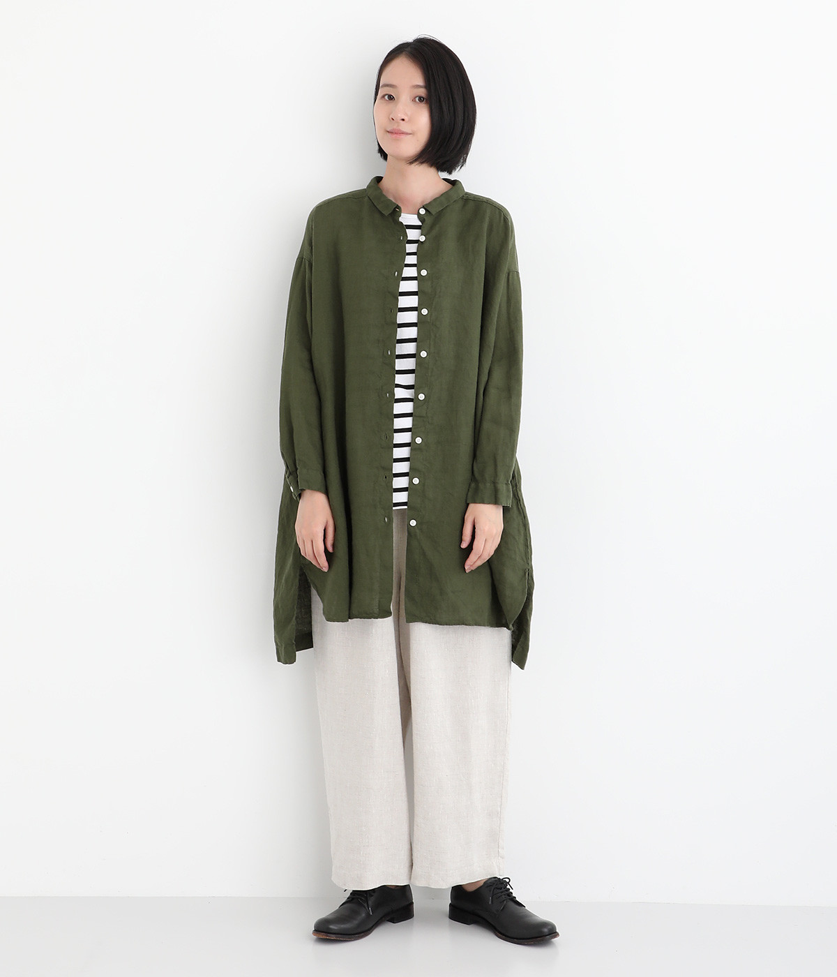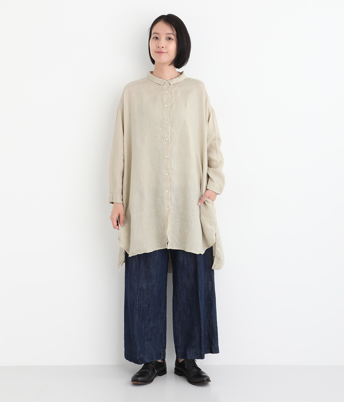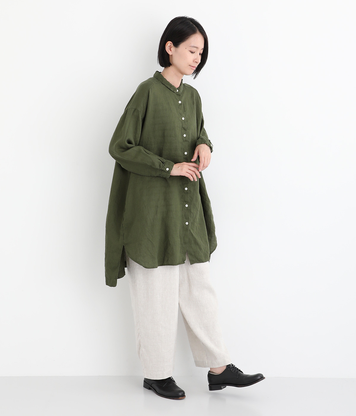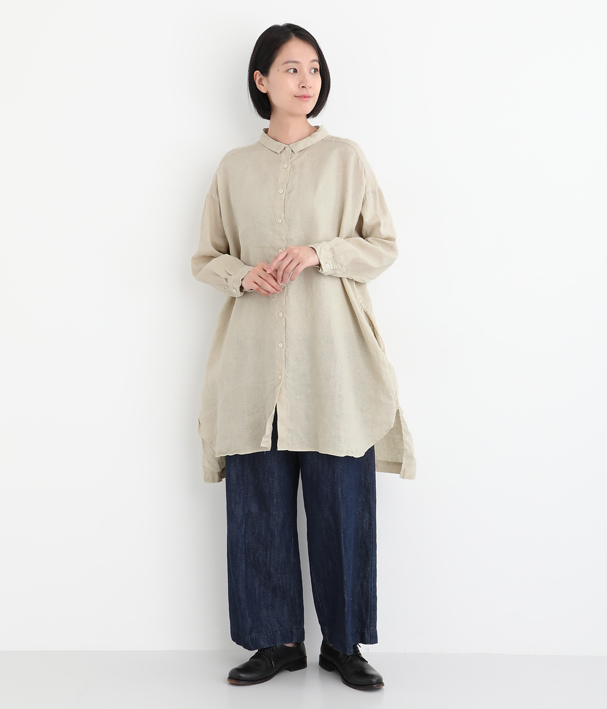 リネンのくったりとした表情が味わい深い平織生地。国内で職人による製品染めを施した、オリジナルカラー展開です。着るほどに風合いを増し、愛着が生まれていきます。