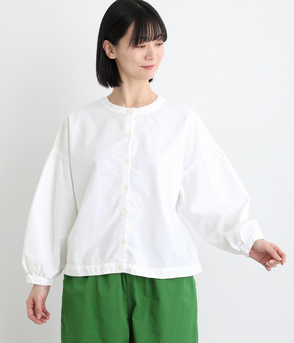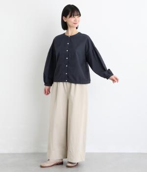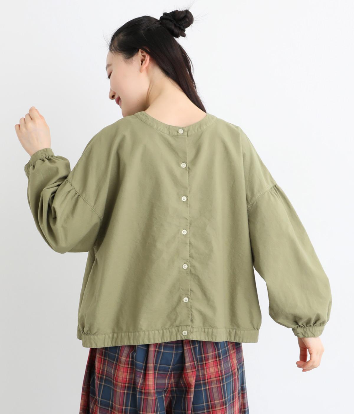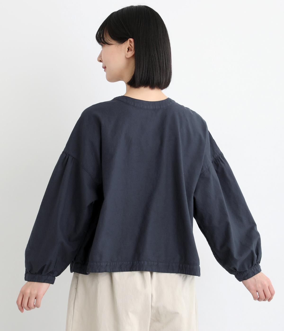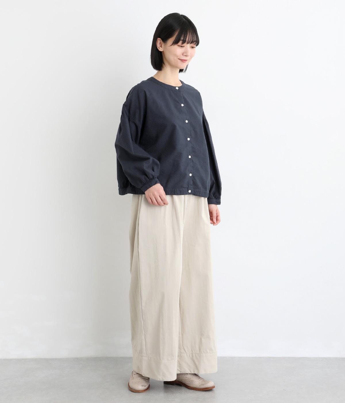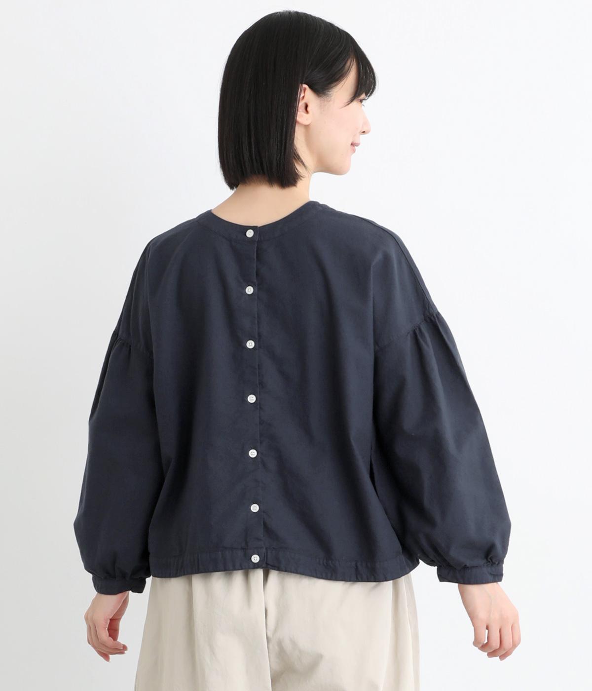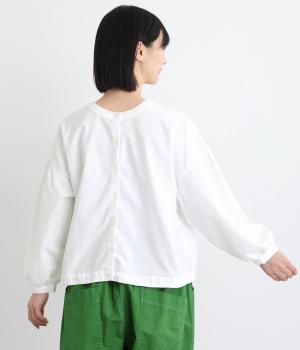前後2way仕様で、雰囲気の異なる着こなしがたのしめるブラウスです。ボタンを前にすれば縦のラインをきかせた端正な印象に、うしろにすればすっきりと着こなせます。ドロップショルダーとゆとりある身幅で、リラックス感のある着心地。ボリューム袖とサイドギャザーが裾へ丸く広がり、やわらかなシルエットを描きます。