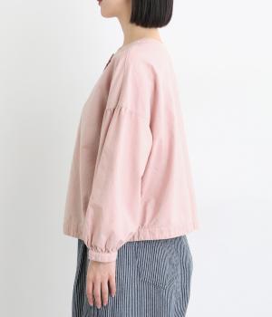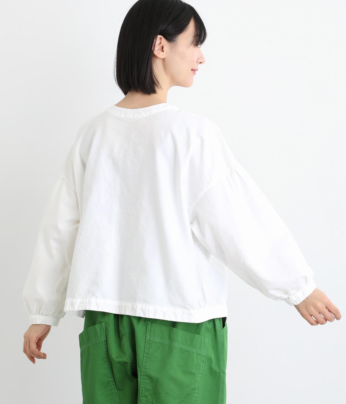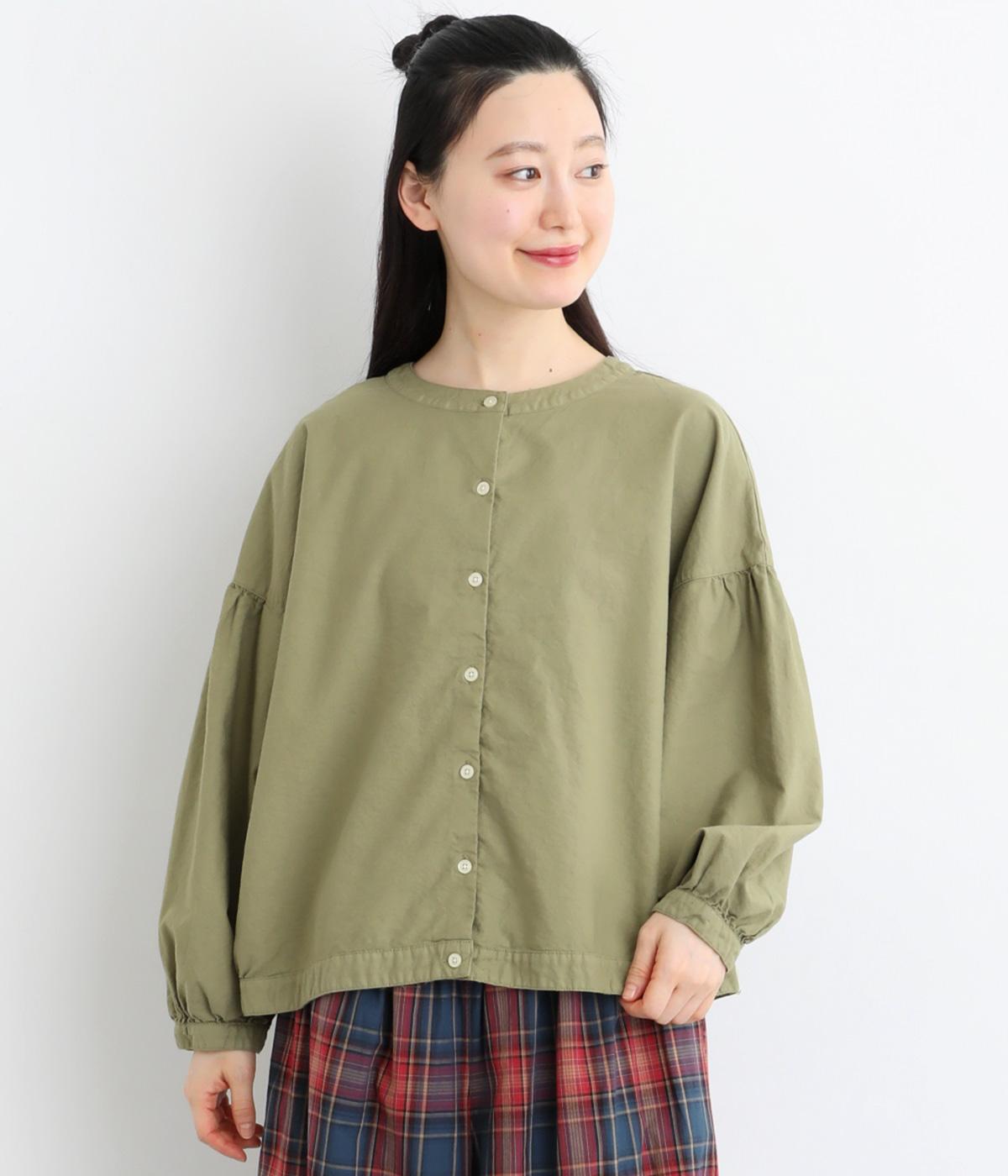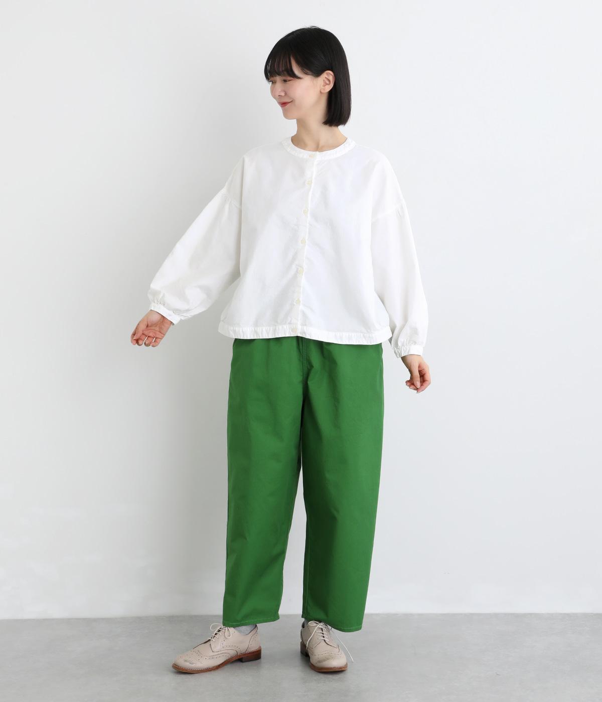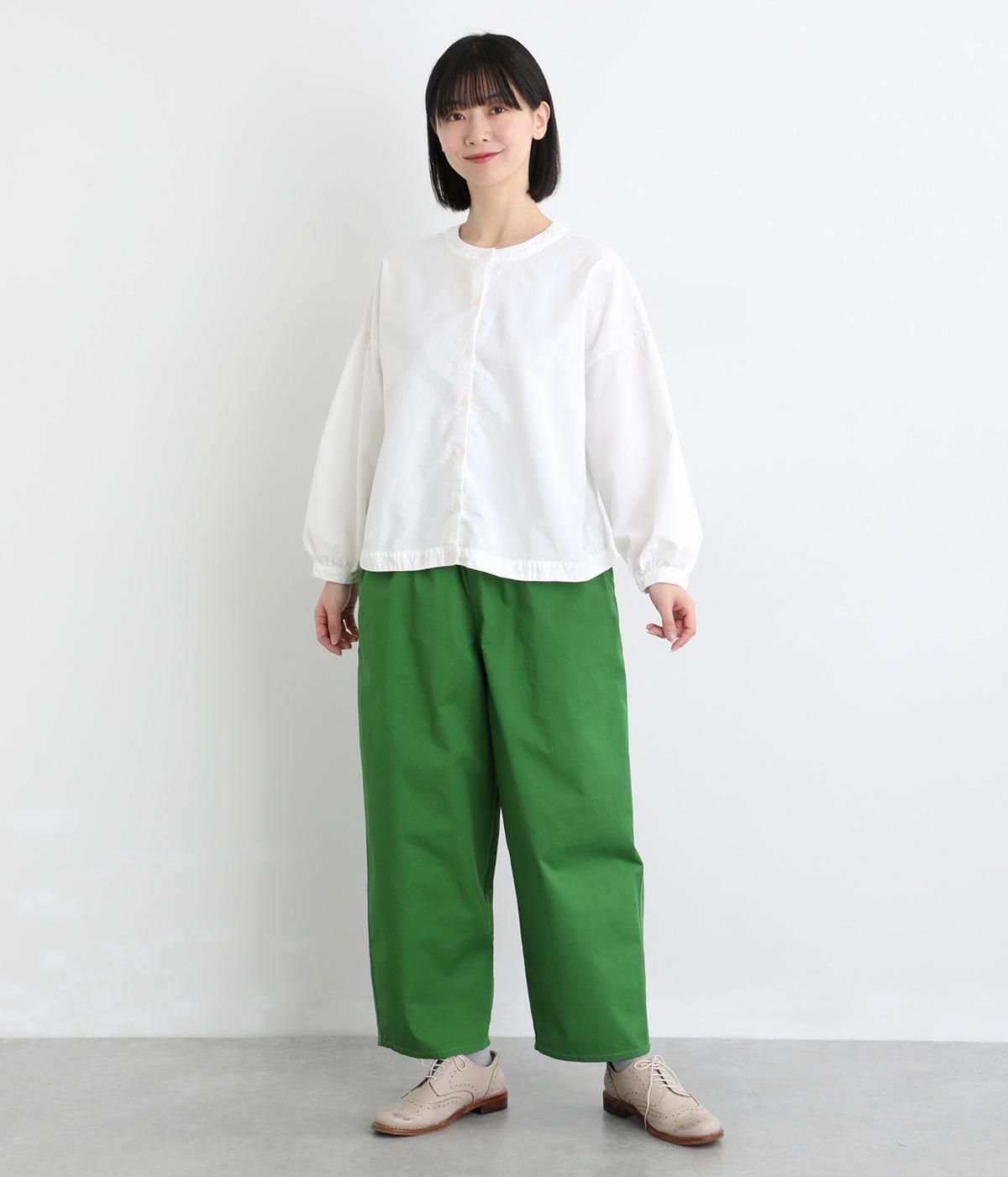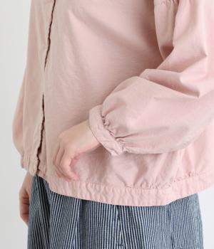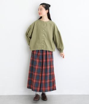 前後2way仕様で、雰囲気の異なる着こなしがたのしめるブラウスです。ボタンを前にすれば縦のラインをきかせた端正な印象に、うしろにすればすっきりと着こなせます。ドロップショルダーとゆとりある身幅で、リラックス感のある着心地。ボリューム袖とサイドギャザーが裾へ丸く広がり、やわらかなシルエットを描きます。