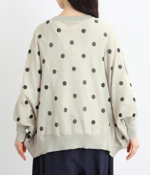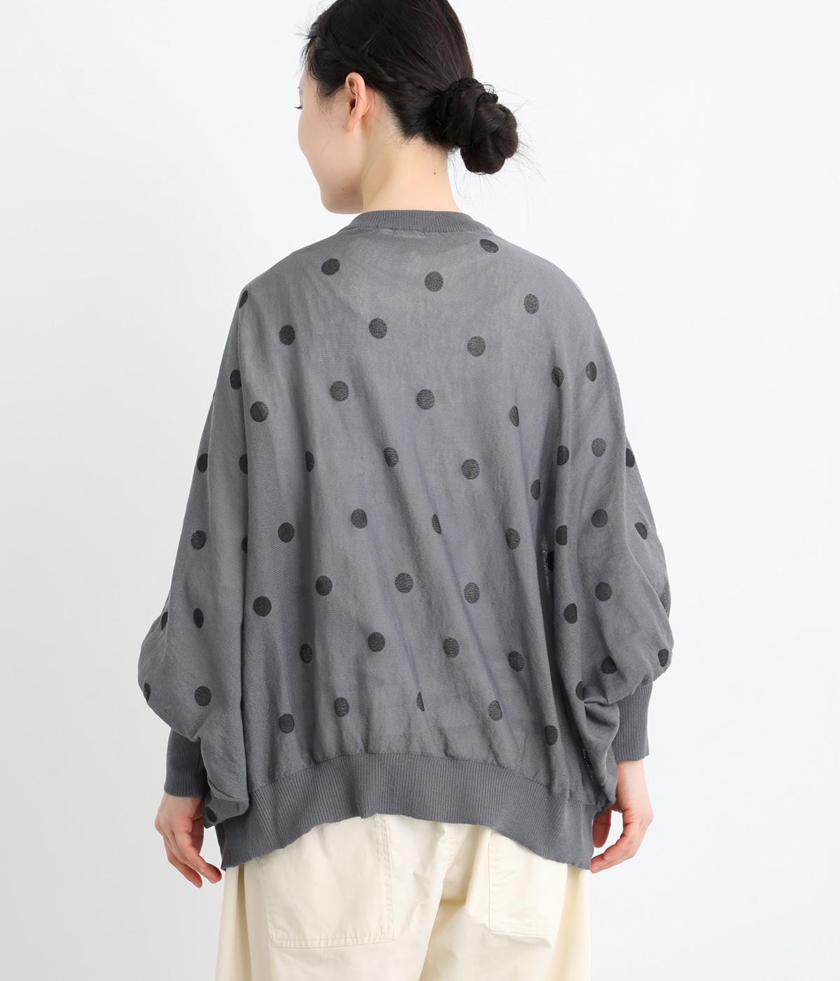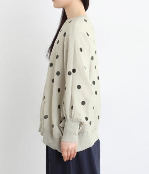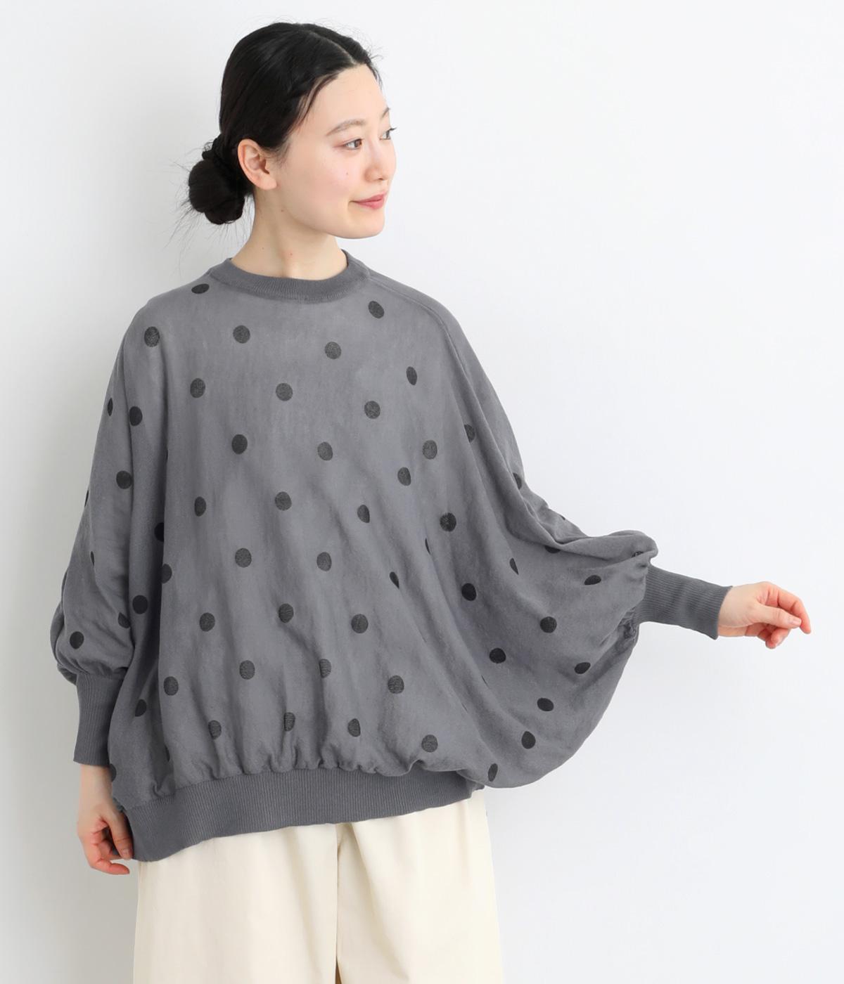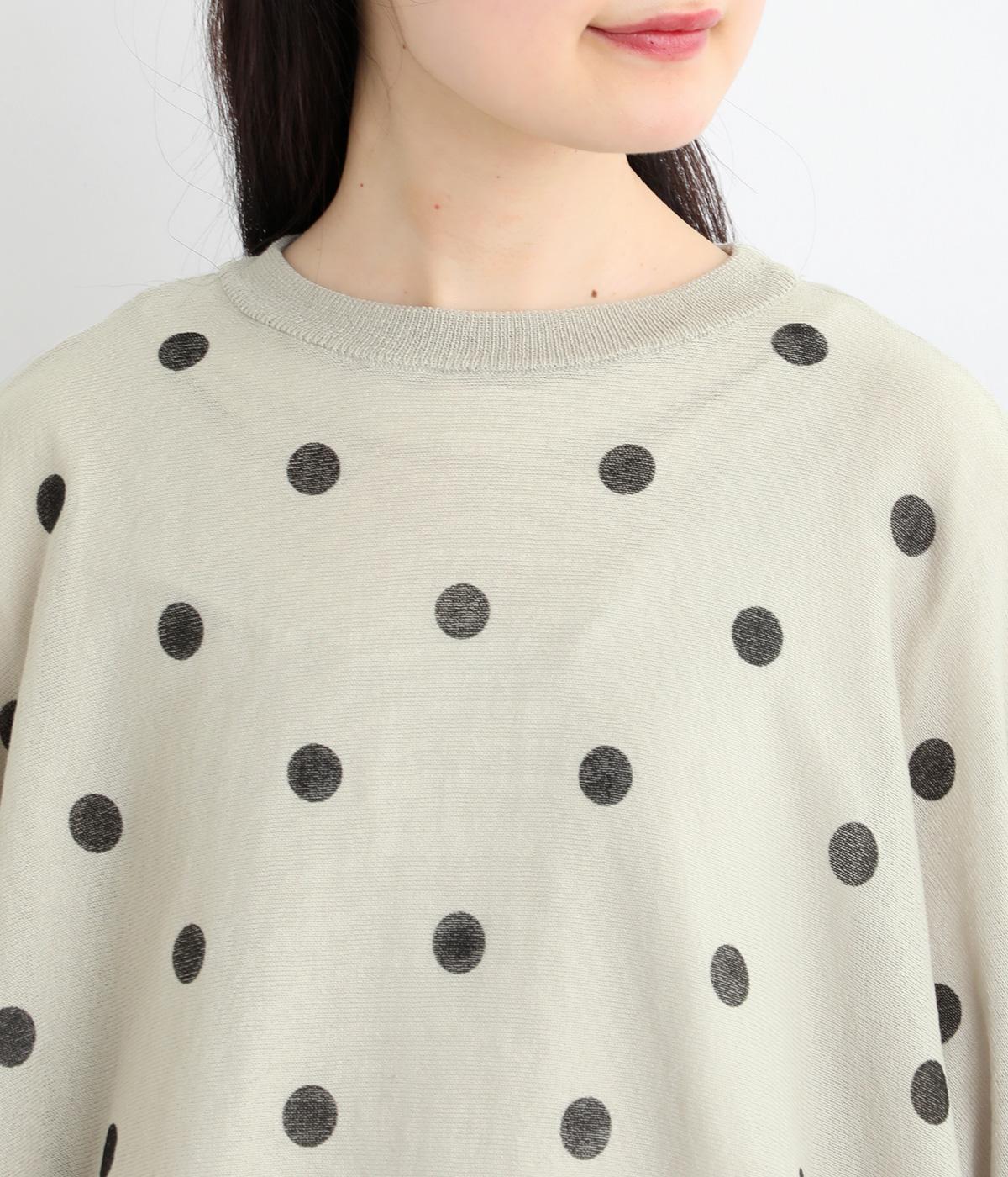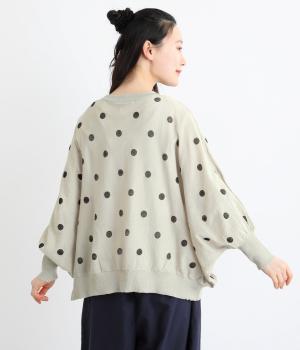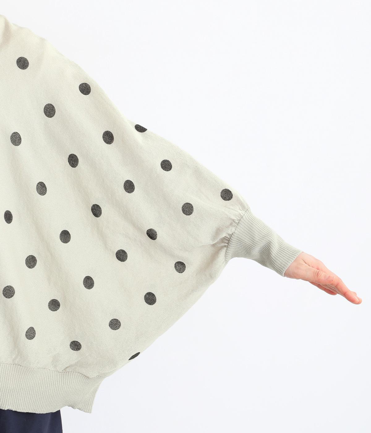 全体にちりばめた大きめのドット柄が目を引く一枚。ゆったりとしたドルマンシルエットが抜け感を生み、動くたびにやわらかなドレープが広がります。裾に丸みをつけることで立体感を持たせ、長めの袖リブをアクセントに全体を引き締めました。