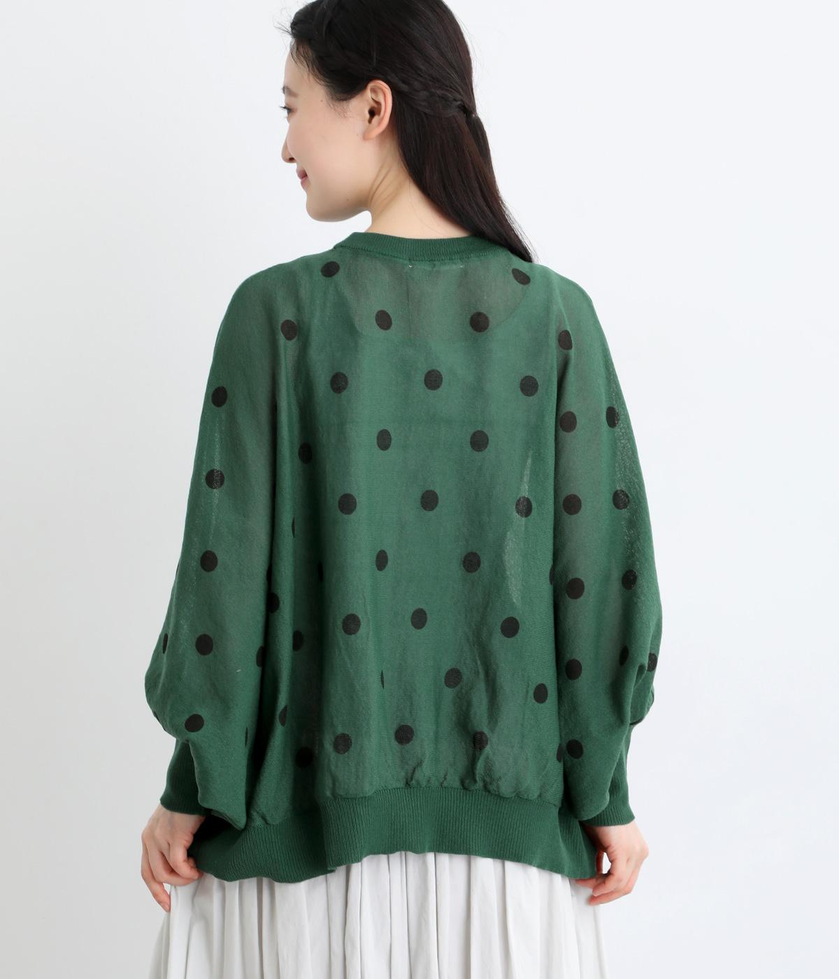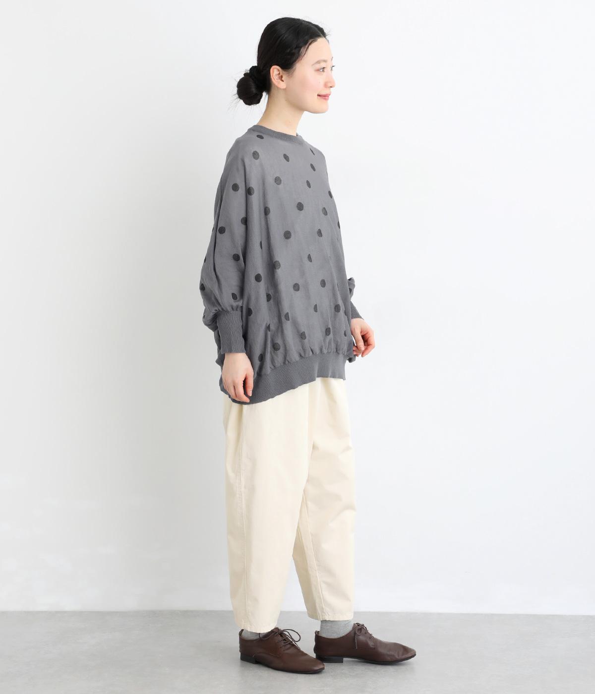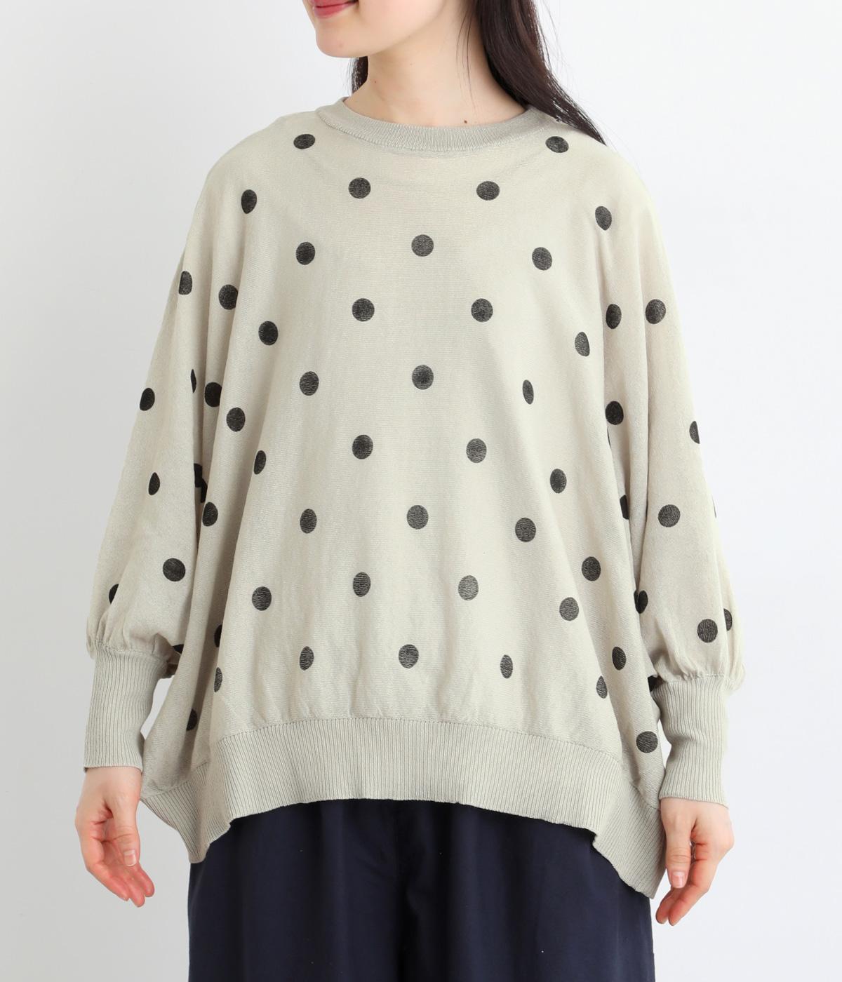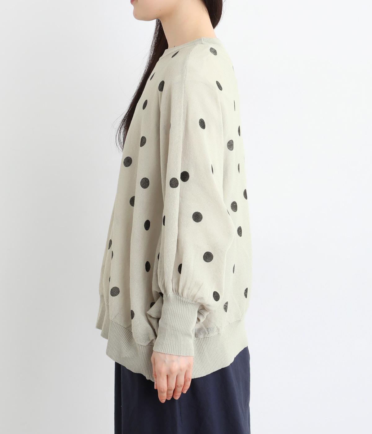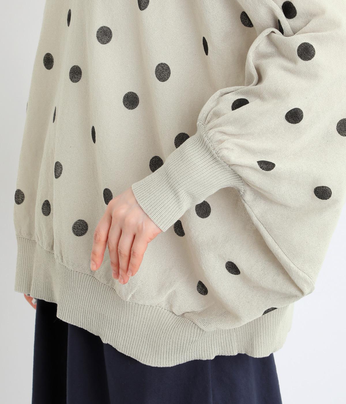 全体にちりばめた大きめのドット柄が目を引く一枚。ゆったりとしたドルマンシルエットが抜け感を生み、動くたびにやわらかなドレープが広がります。裾に丸みをつけることで立体感を持たせ、長めの袖リブをアクセントに全体を引き締めました。
