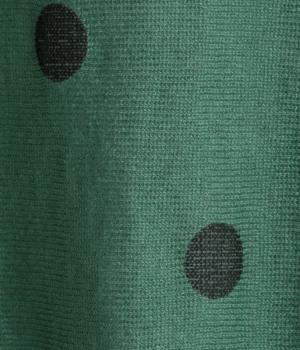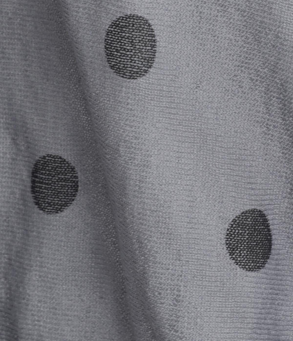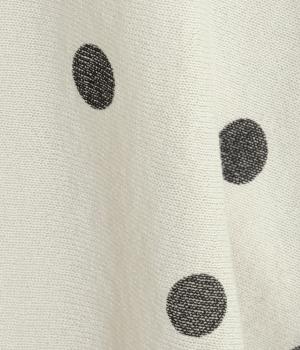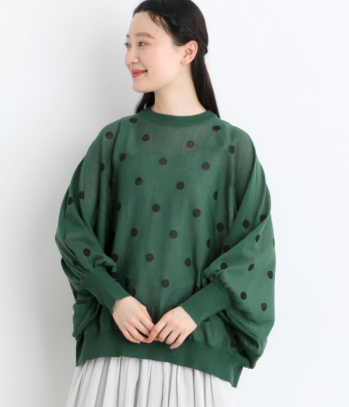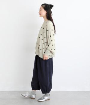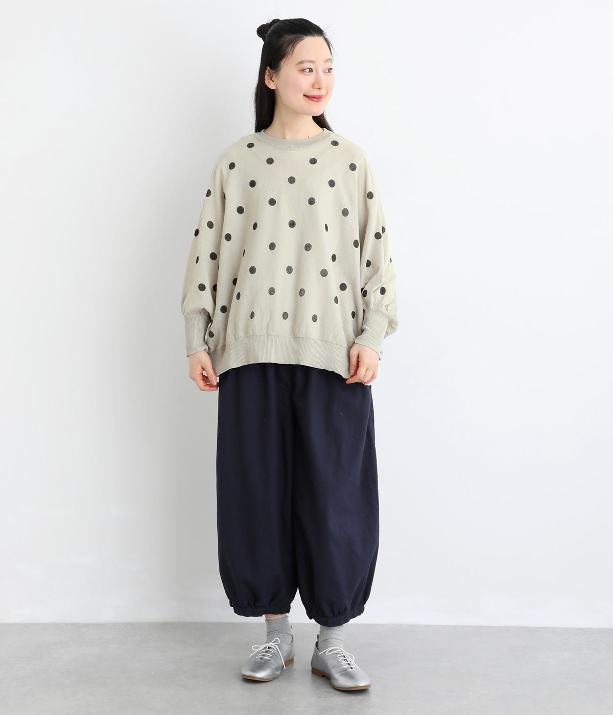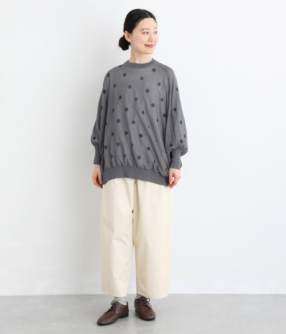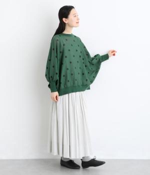全体にちりばめた大きめのドット柄が目を引く一枚。ゆったりとしたドルマンシルエットが抜け感を生み、動くたびにやわらかなドレープが広がります。裾に丸みをつけることで立体感を持たせ、長めの袖リブをアクセントに全体を引き締めました。