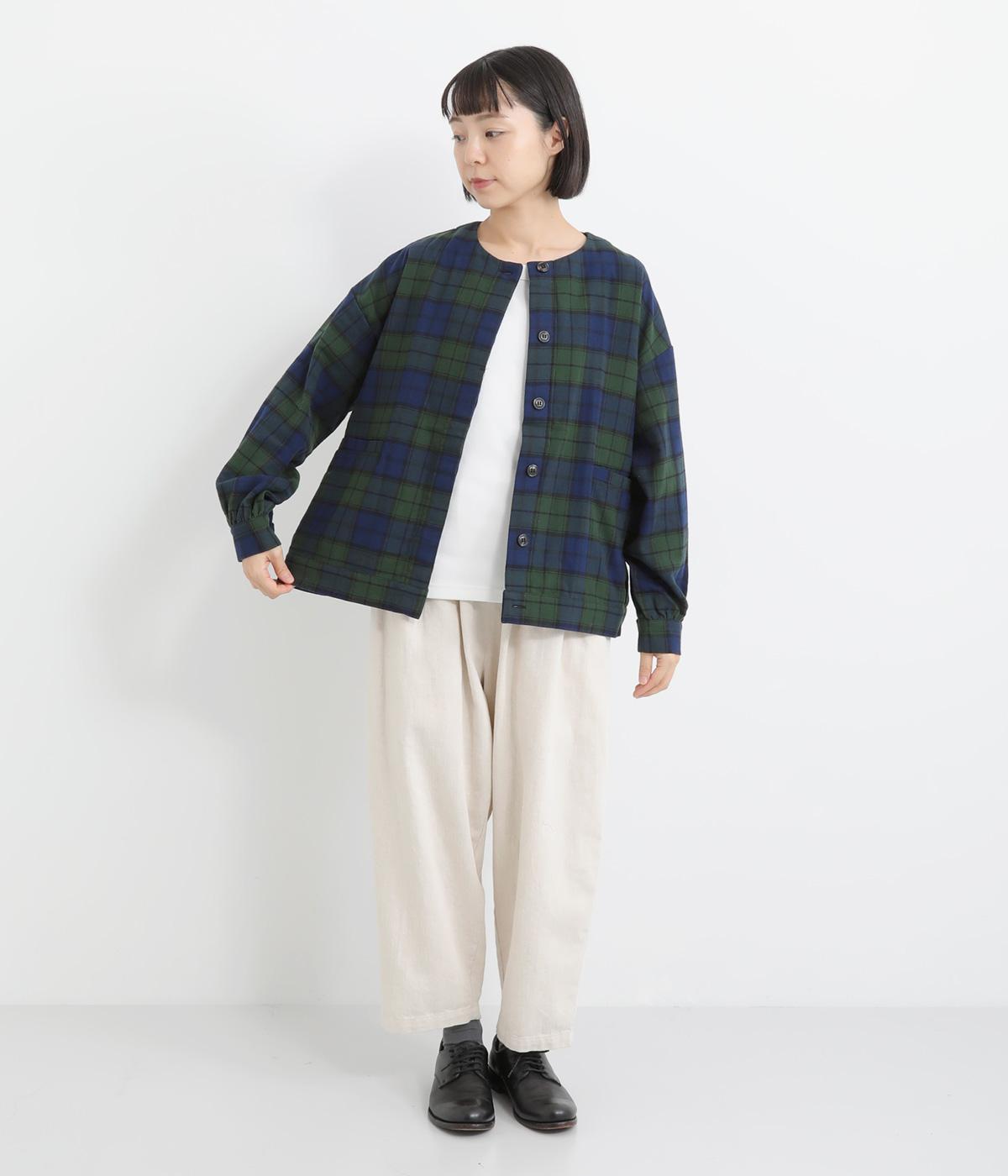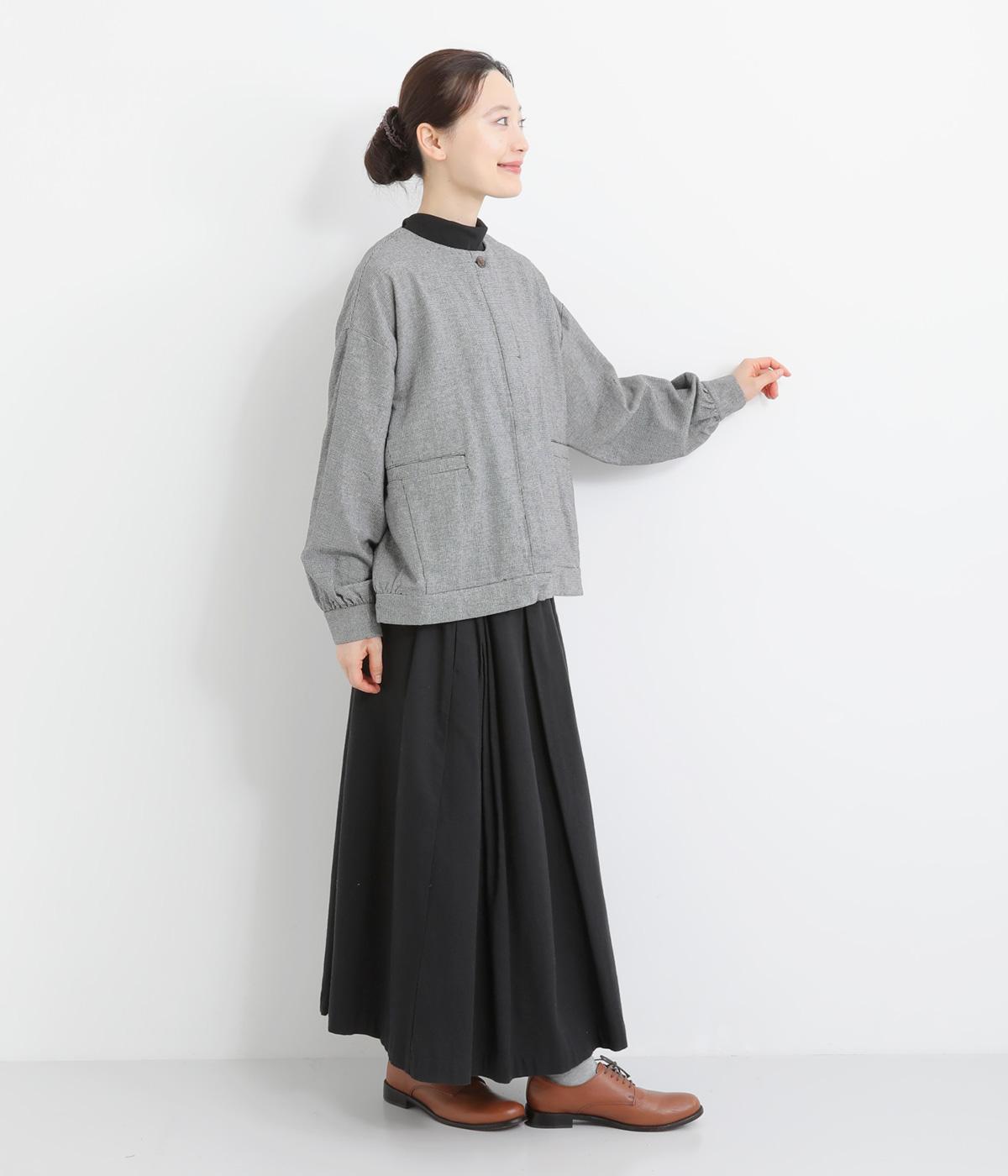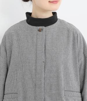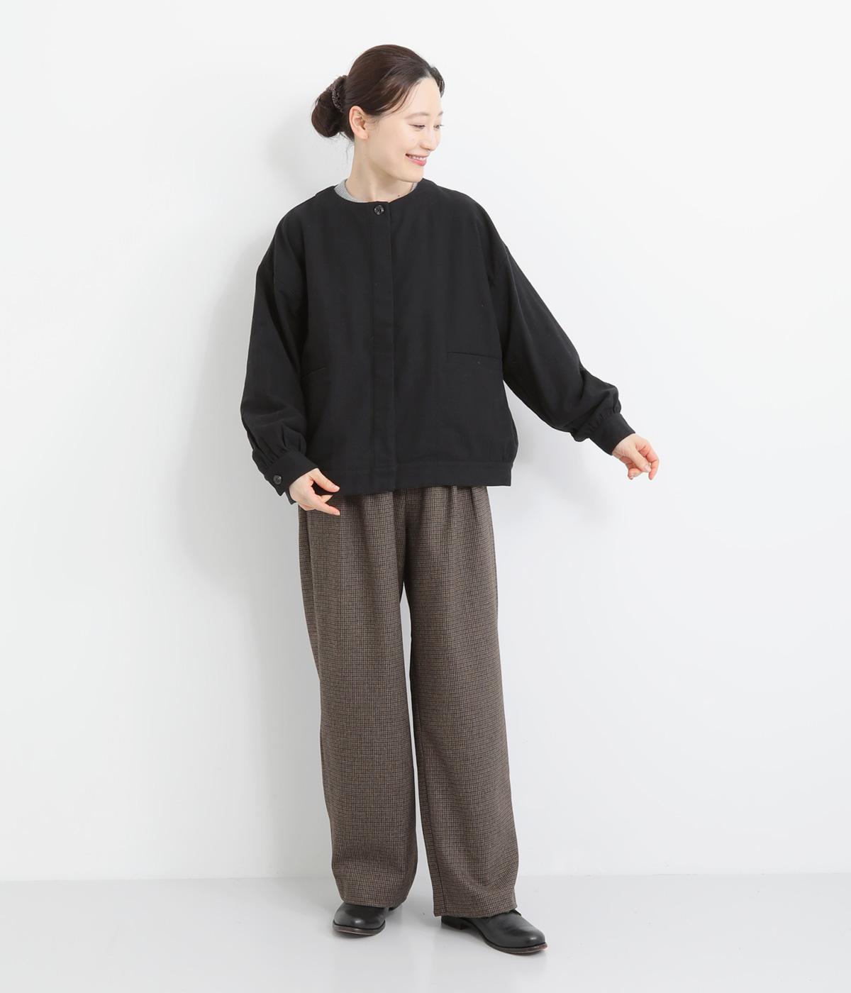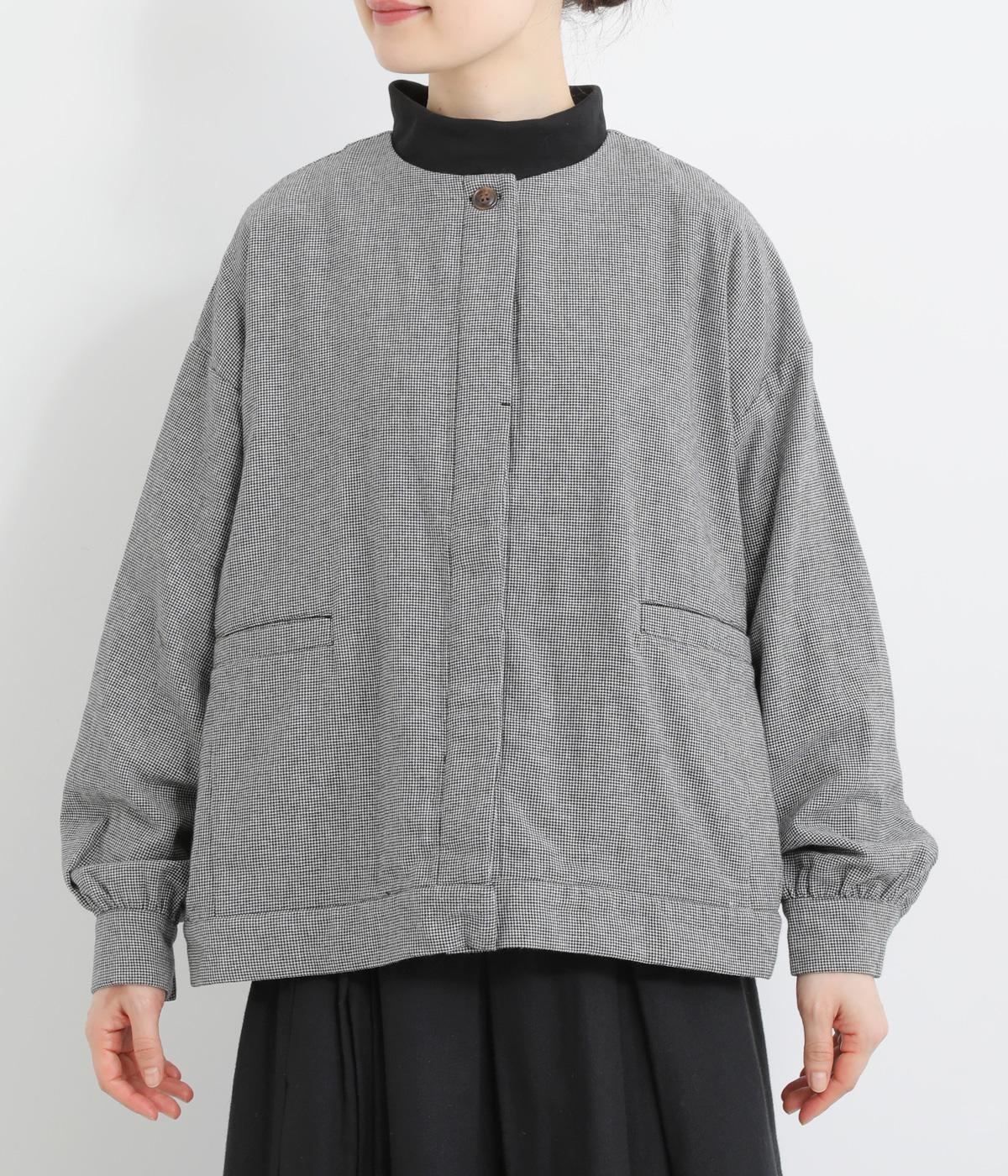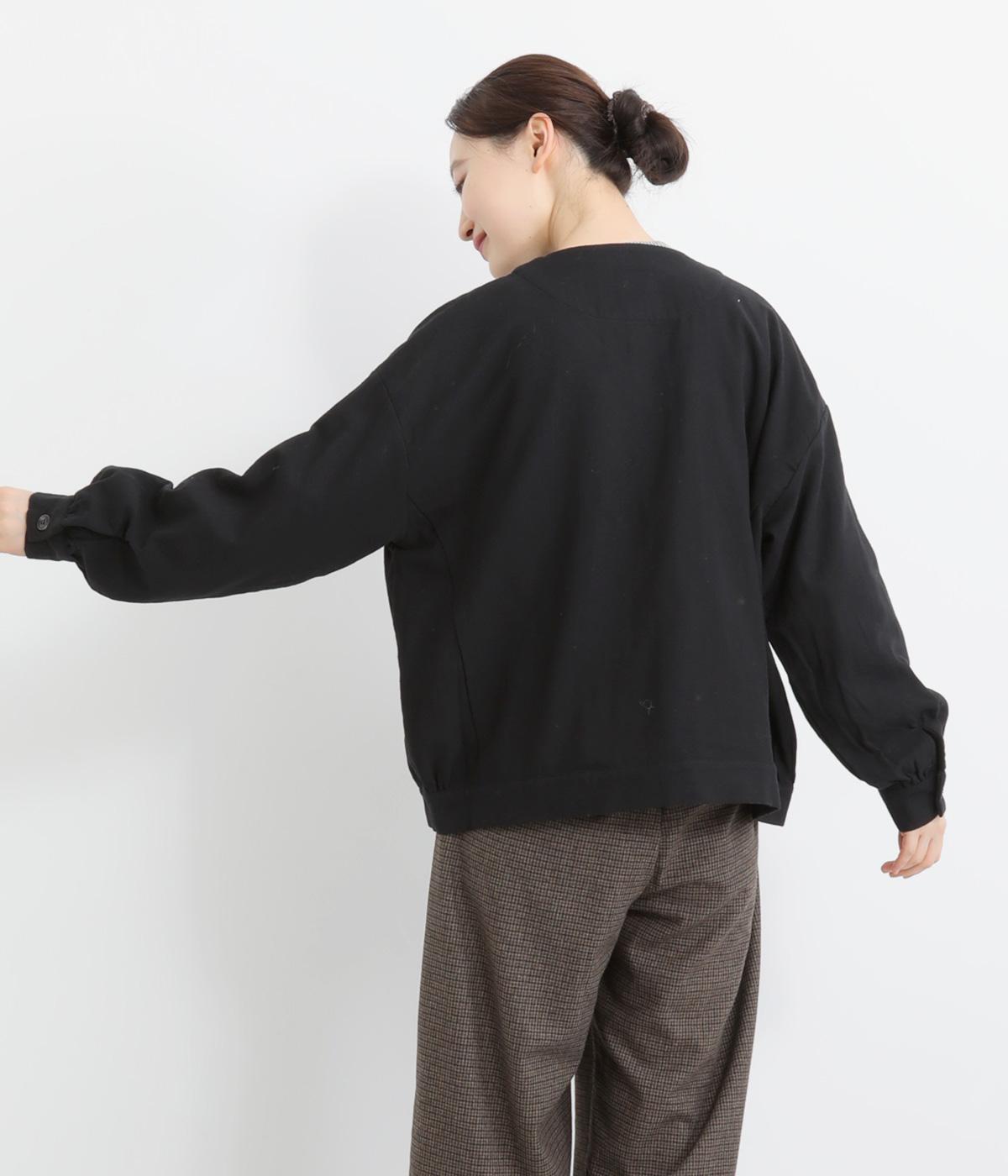 シンプルな美しさとゆとりのあるシルエットが魅力。しっかりとした裏地や、隠れボタンも付いているこだわりのディテールです。立体感があり、体型を選ばずカジュアルにもフォーマルにも着用できます。全体的にやわらかな印象のノーカラージャケットです。