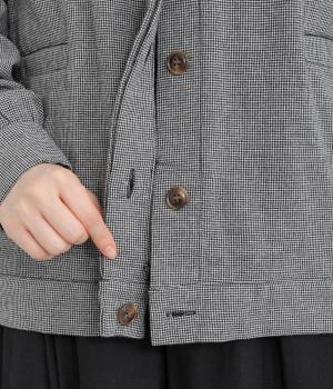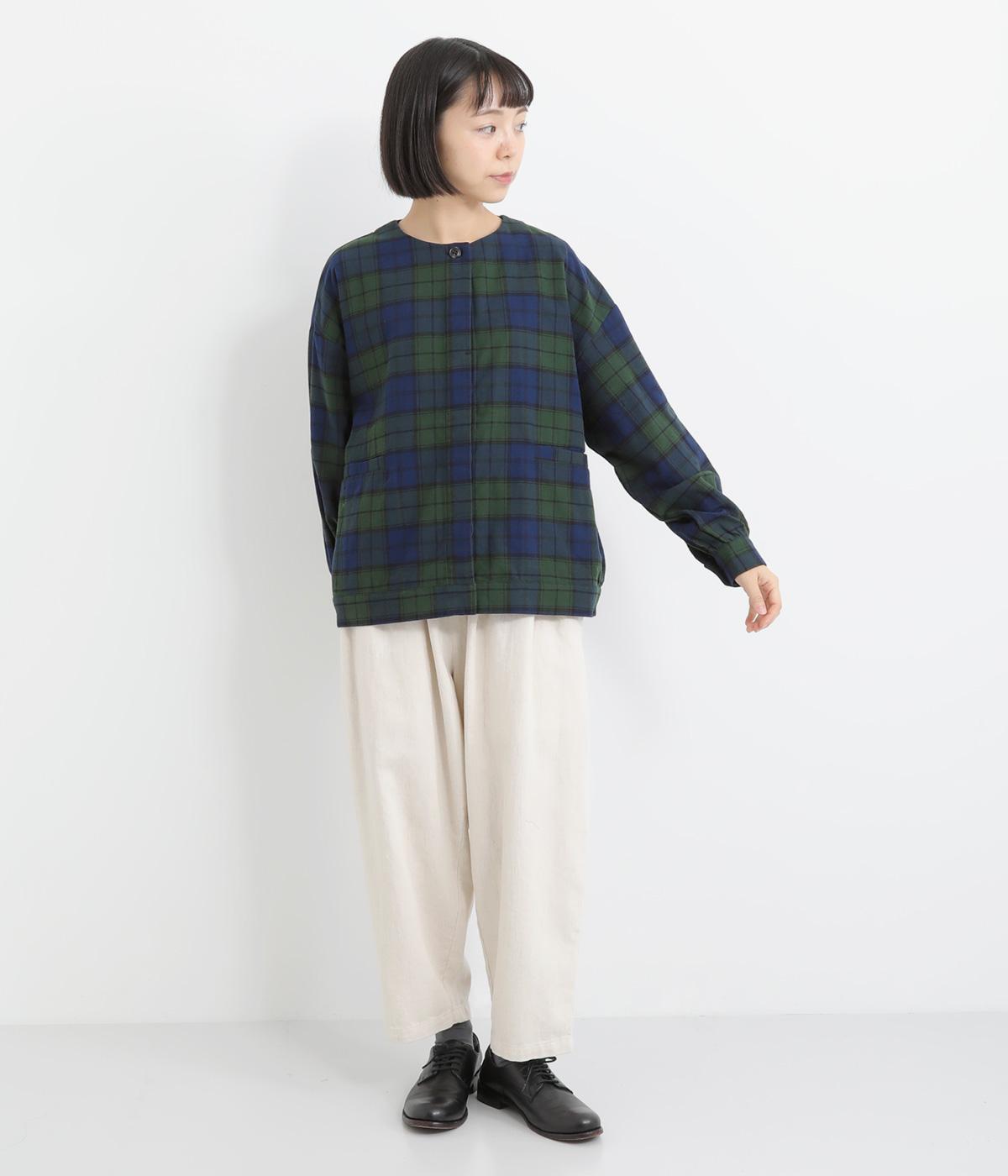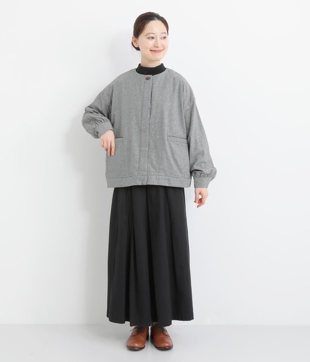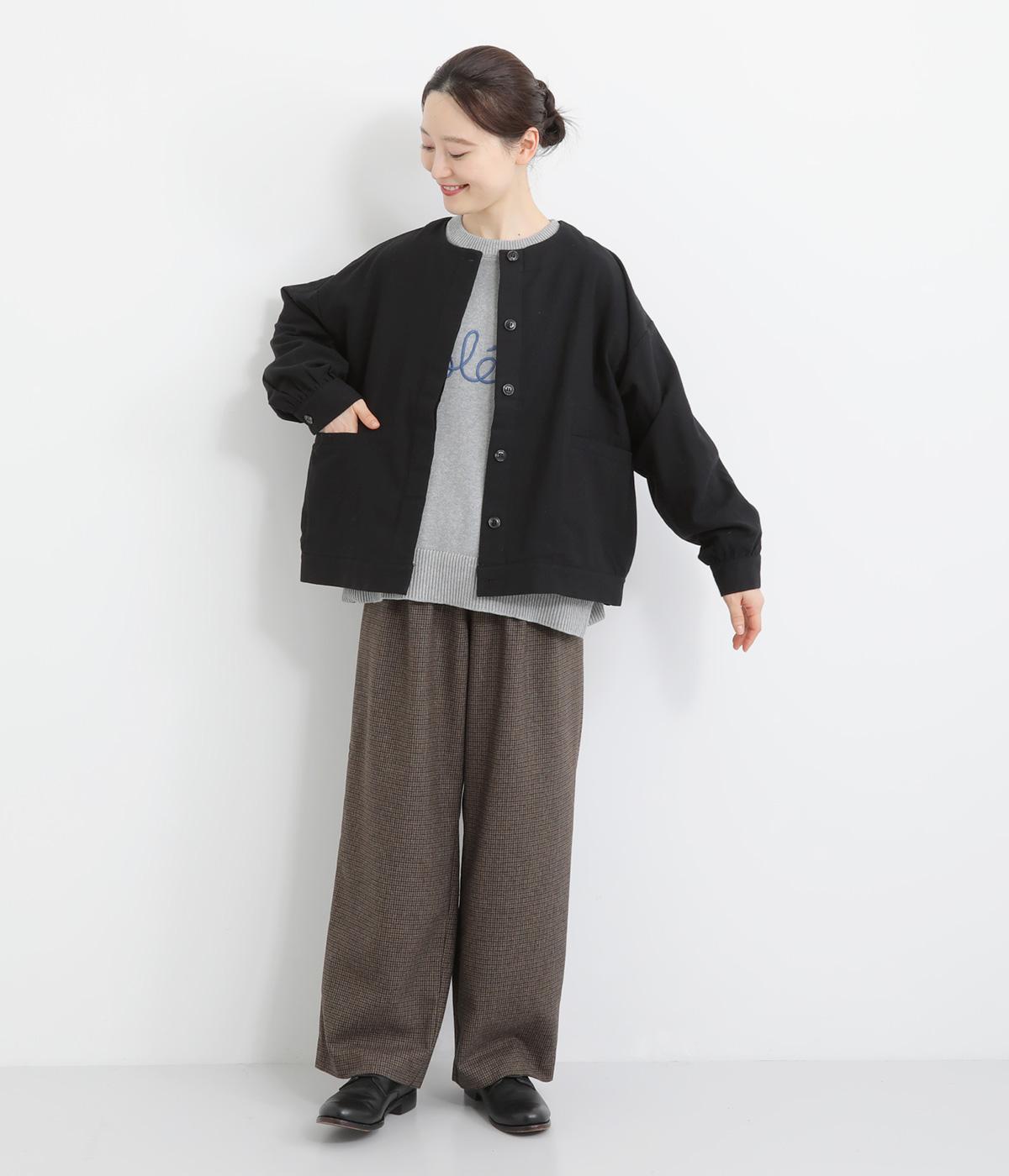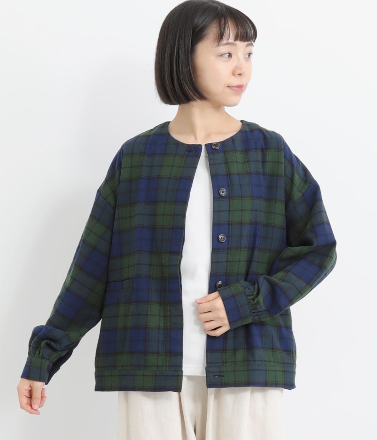 シンプルな美しさとゆとりのあるシルエットが魅力。しっかりとした裏地や、隠れボタンも付いているこだわりのディテールです。立体感があり、体型を選ばずカジュアルにもフォーマルにも着用できます。全体的にやわらかな印象のノーカラージャケットです。