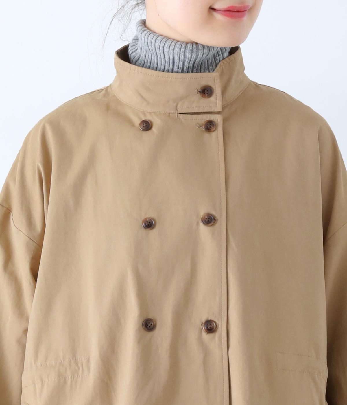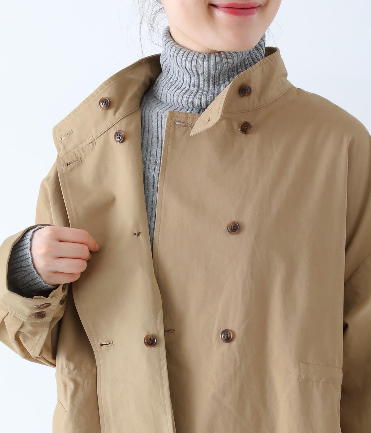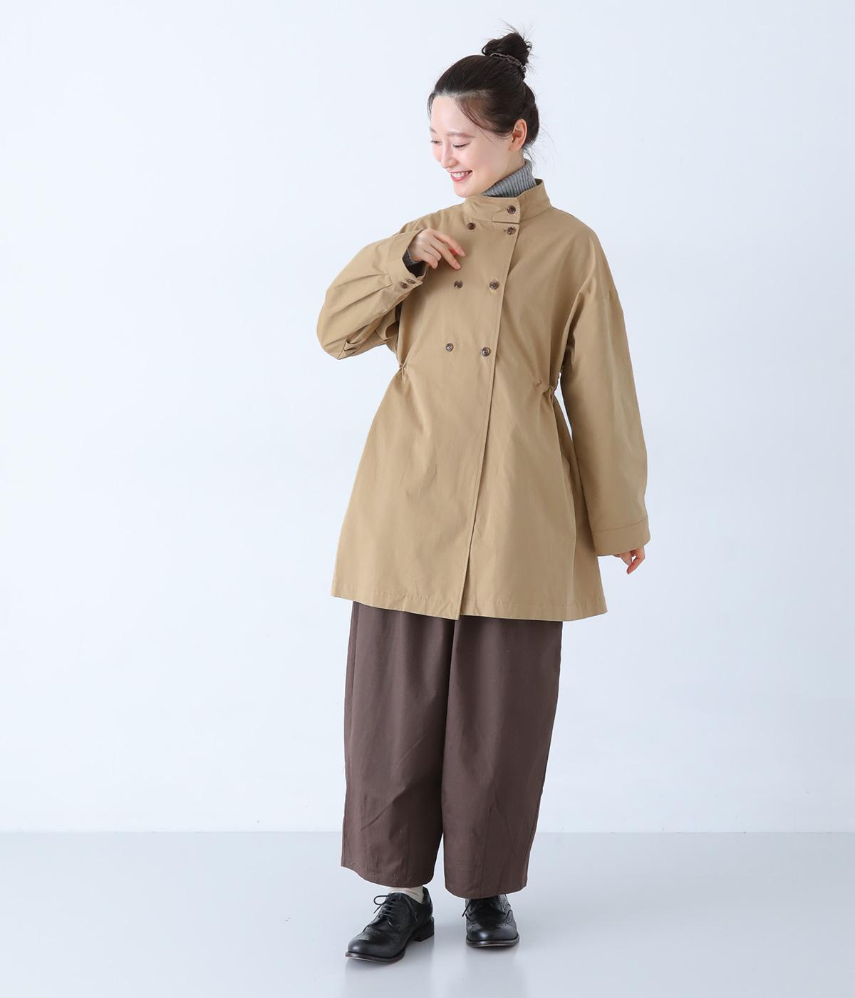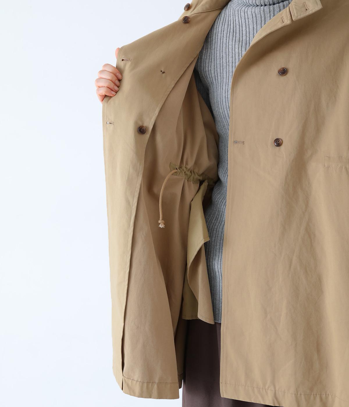 ダブルボタンとスタンドカラーがクラシカルな印象を与えるハーフコート。ウエスト内側に通した紐をきゅっと絞ればシルエットをすっきりとアレンジ可能です。襟部分は開けるとテーラード風に着こなせるのもグッド。袖口カフスのボタンやタック使いなど、細かなディテールにもこだわりが光ります。
