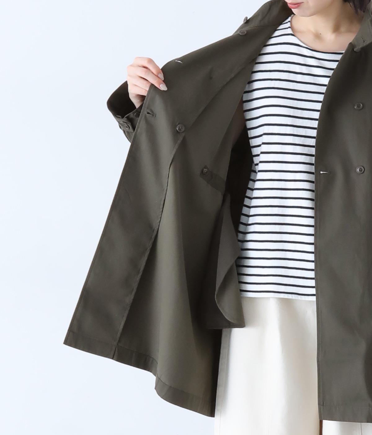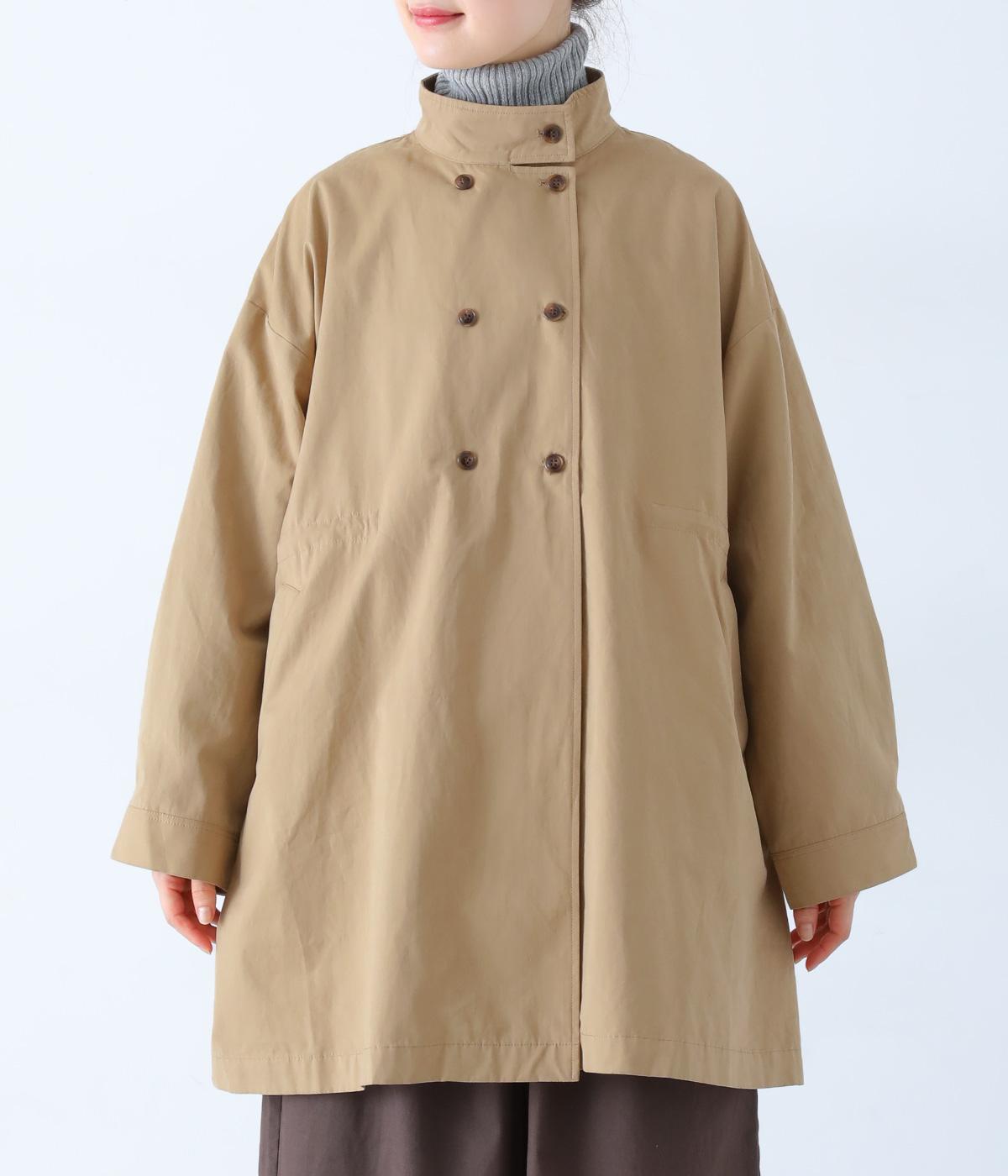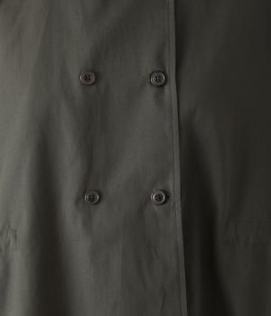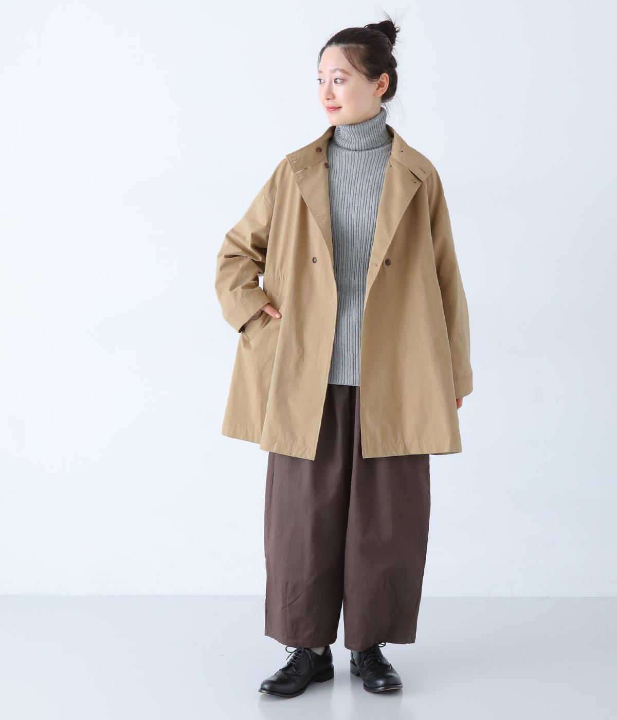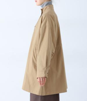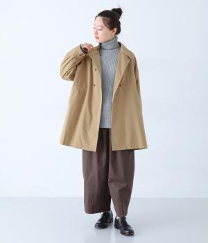 ダブルボタンとスタンドカラーがクラシカルな印象を与えるハーフコート。ウエスト内側に通した紐をきゅっと絞ればシルエットをすっきりとアレンジ可能です。襟部分は開けるとテーラード風に着こなせるのもグッド。袖口カフスのボタンやタック使いなど、細かなディテールにもこだわりが光ります。